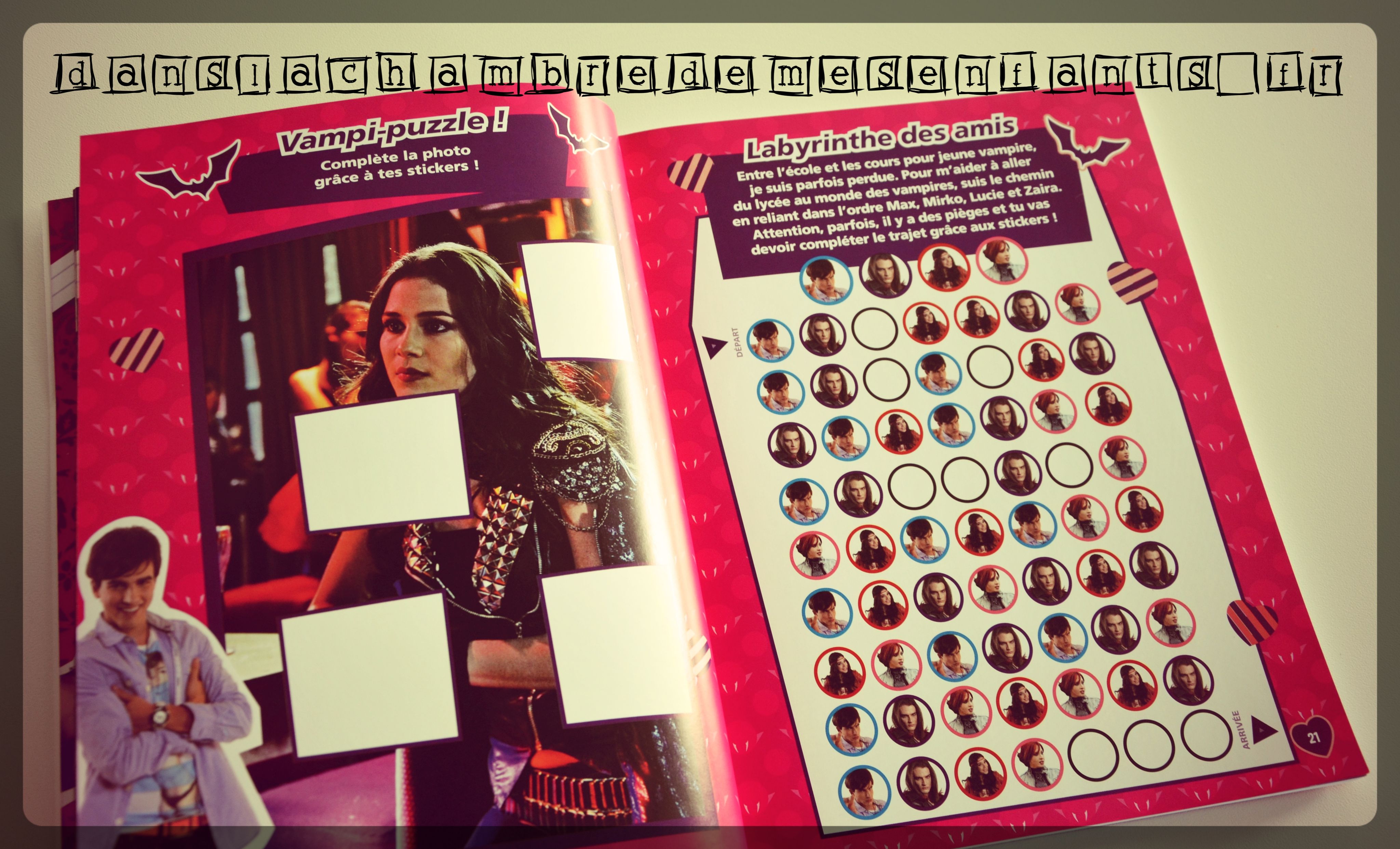 Ce livre d’activité propose des pages sur les personnages de la série puis des jeux à remplir, essentiellement, à l’aide des stickers fournis (beaucoup à l’effigie des personnages), et ce sur 30 pages. Une grande place est faite aux autocollants qui sont en nombre suffisant (1000) pour être utilisés sur d’autres supports (agenda…). Parmi les jeux, on retrouve des scènes à compléter (ex : photo du couloir d’école à remplir), les 7 différences, le labyrinthe, mots croisés ou encore du sudoku.