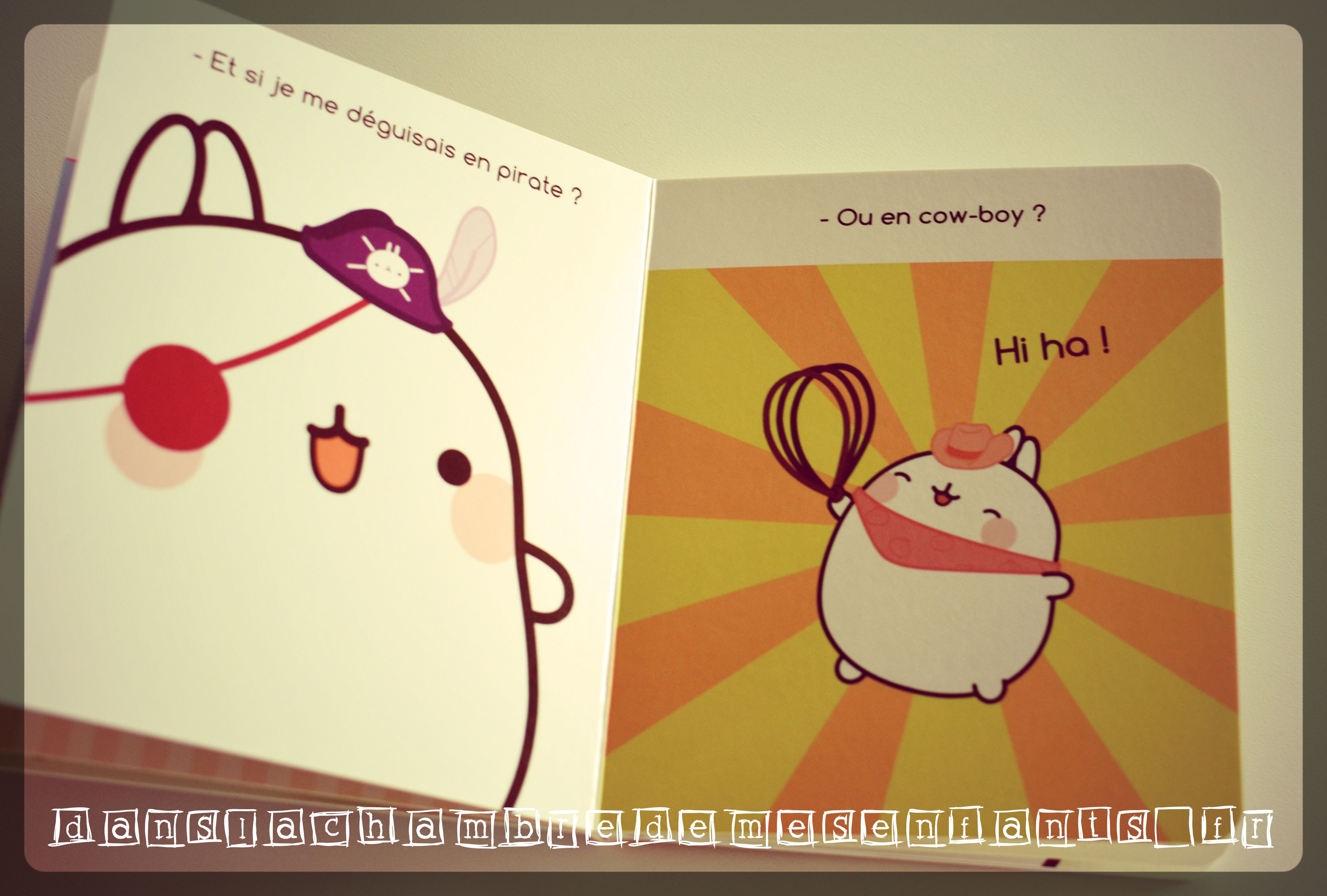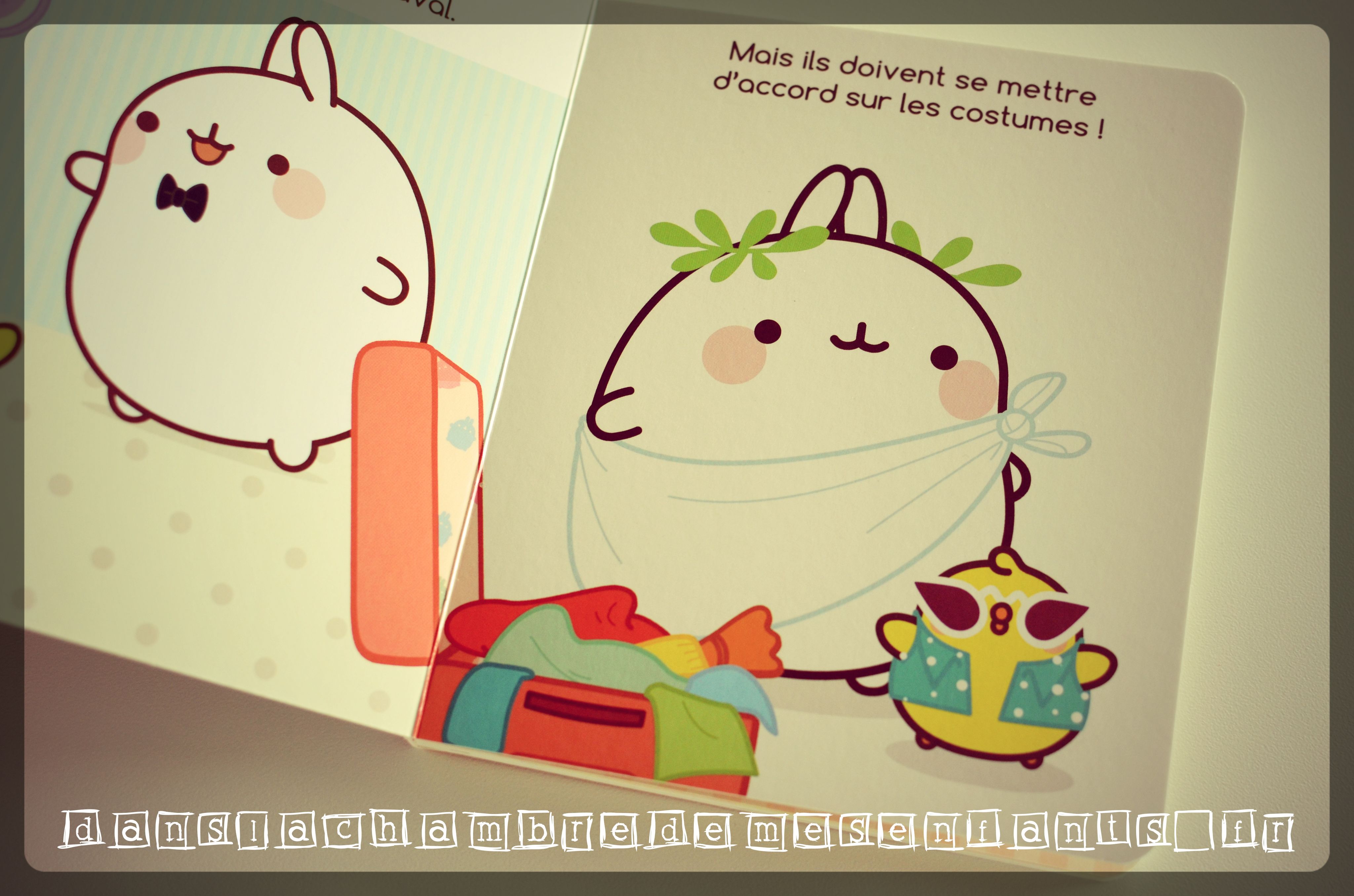 Sous format cartonné, ce livre présente l’aventure de Mölang sous des traits tout en rondeur et avec de doux coloris. L’histoire est toute aussi simple : les deux amis sont invités à la grande fête du Carnaval et ils hésitent sur le choix de leurs costumes pour enfin s’accorder à ne prendre que l’essentiel, à savoir un chapeau pour faire la fête.