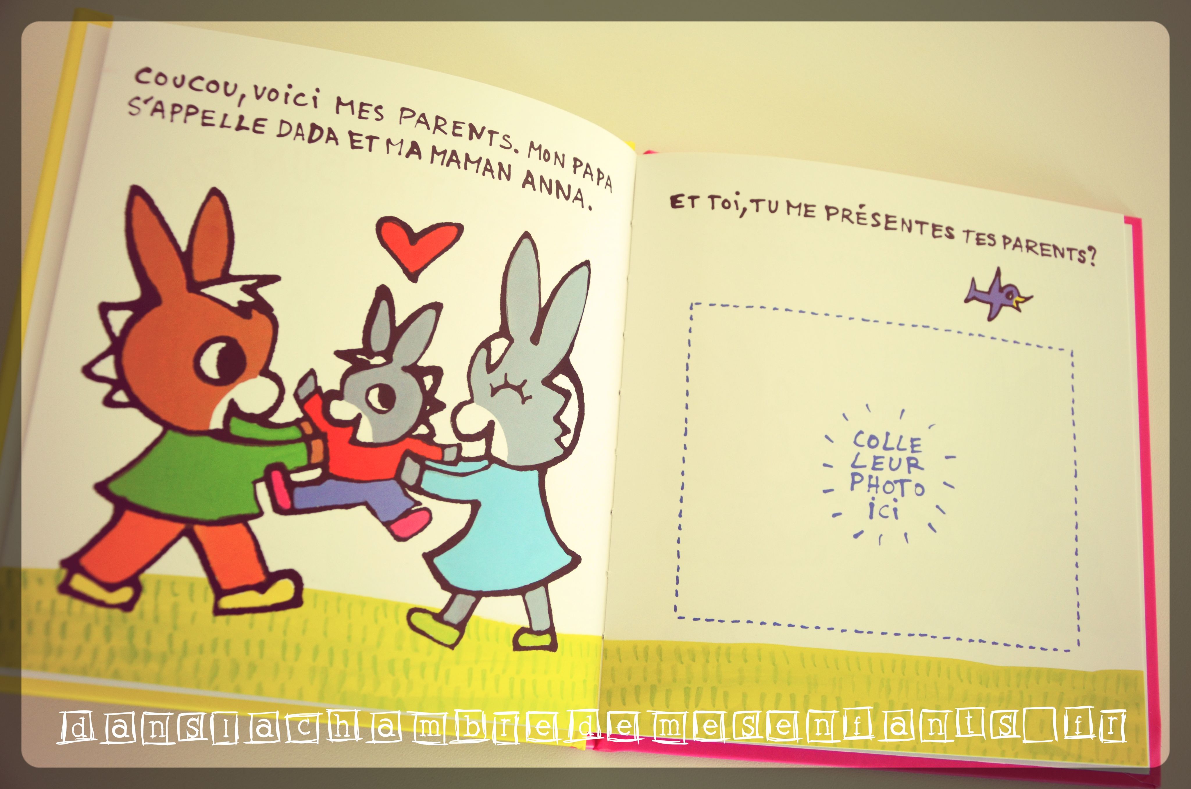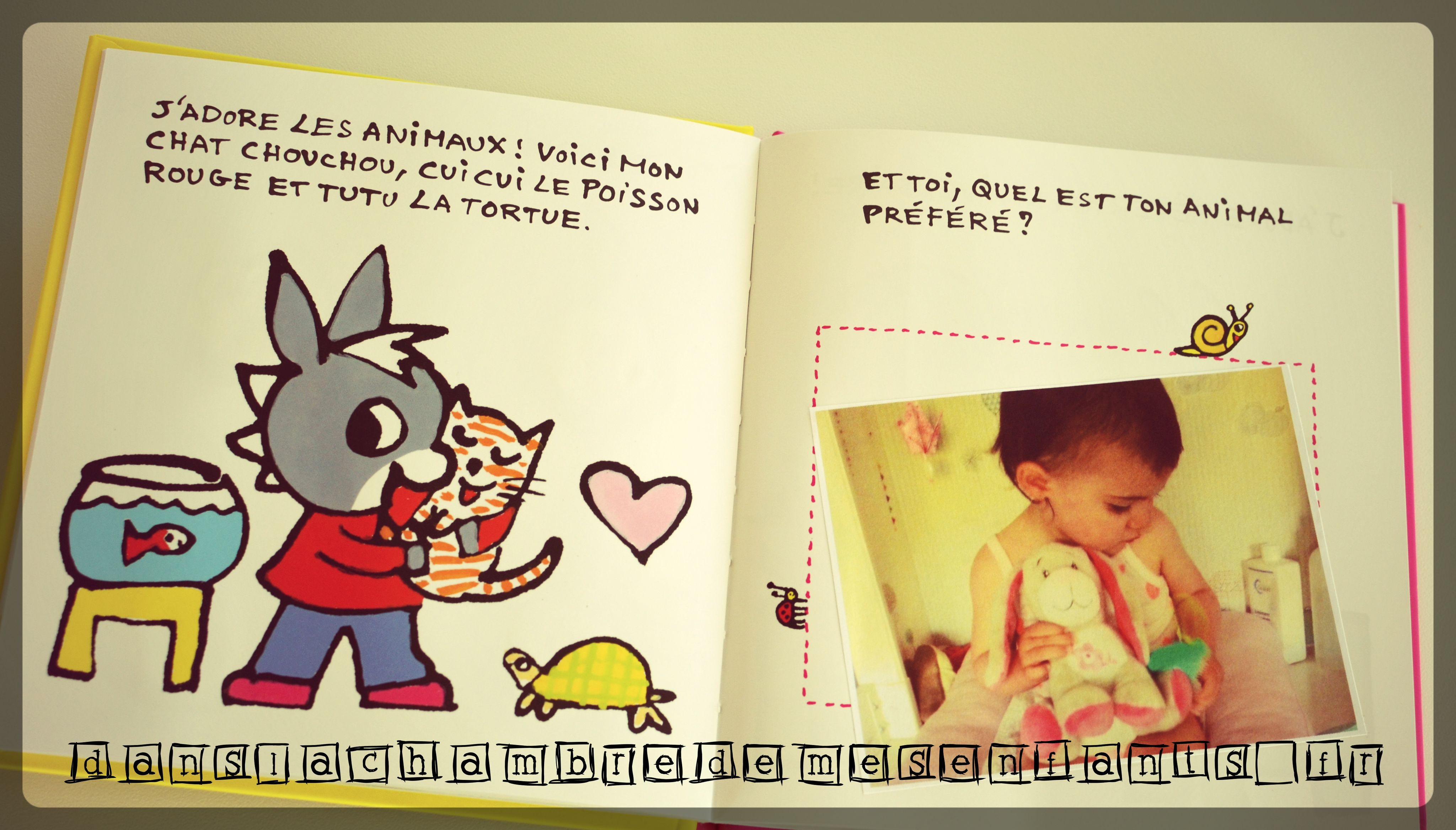 L’avis des enfants : Emi, 21 mois, a eu la surprise de cet ouvrage personnalisé. J’ai repris des photos en suivant les indications de l’histoire de l’album et je les ai redimensionnées avec un peu de manipulation sous Word (insertion d’image dans une zone de texte). Les têtes ne suivent pas toujours très bien les contours des zones à compléter et les cadres des photos complètes non plus mais ce n’est pas grave. J’ai parfois disposé la photo de biais, laissant apparaître le cadre en pointillés, voire deux photos pour composer une page à ma façon. C’est à vous de vous l’approprier et les traits des illustrations le permettent. Je pense que c’est intéressant de le composer pour un enfant à partir de 2 ans environ (attention les pages ne sont pas cartonnées) car le sujet les intéresse beaucoup. Quant à ma fille, elle est ravie !