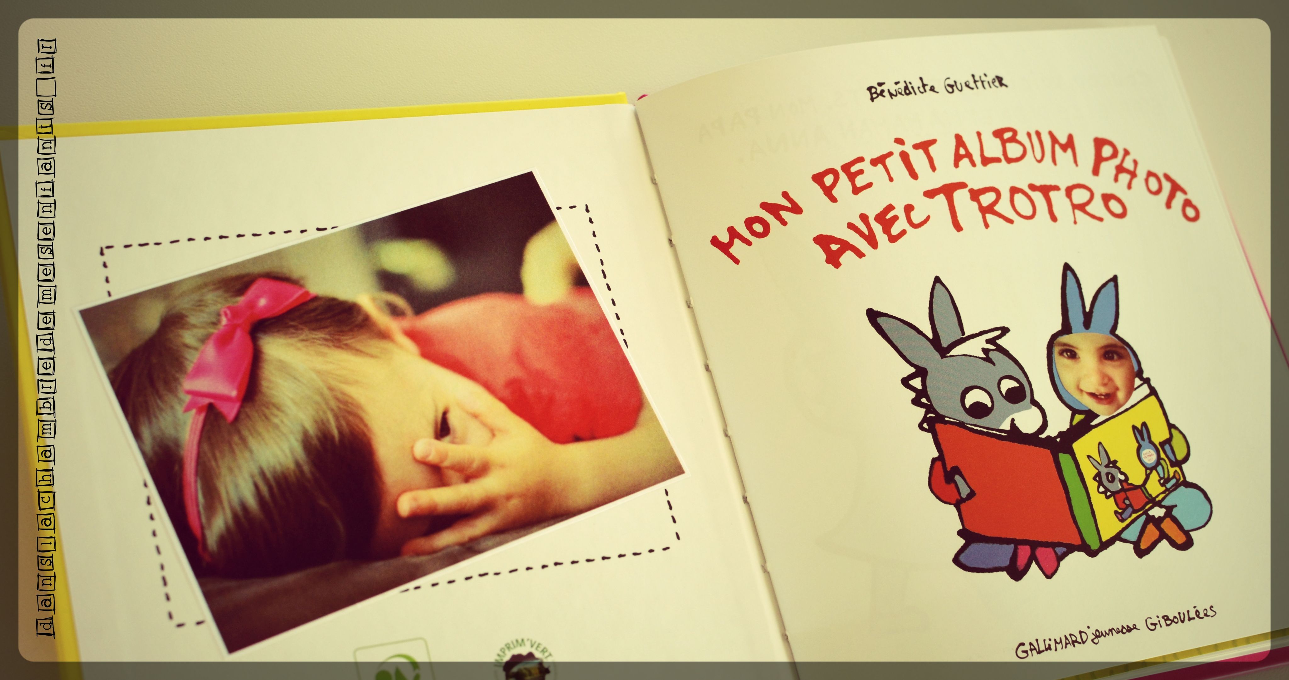 Le fameux petit âne y présente ceux qu’il aime (ses parents, sa petite sœur, ses amis) mais aussi ce qu’il préfère (nourriture, activité…) et ses expressions. Cet album se finit comme une journée, en se couchant avec son doudou et en souhaitant une bonne nuit. Et c’est fini ?! Non, c’est un peu plus qu’une histoire de Trotro : ce livre est partagé avec l’histoire de l’enfant, dès la couverture, en y collant des photos, comme autant de souvenirs à revoir et à garder.