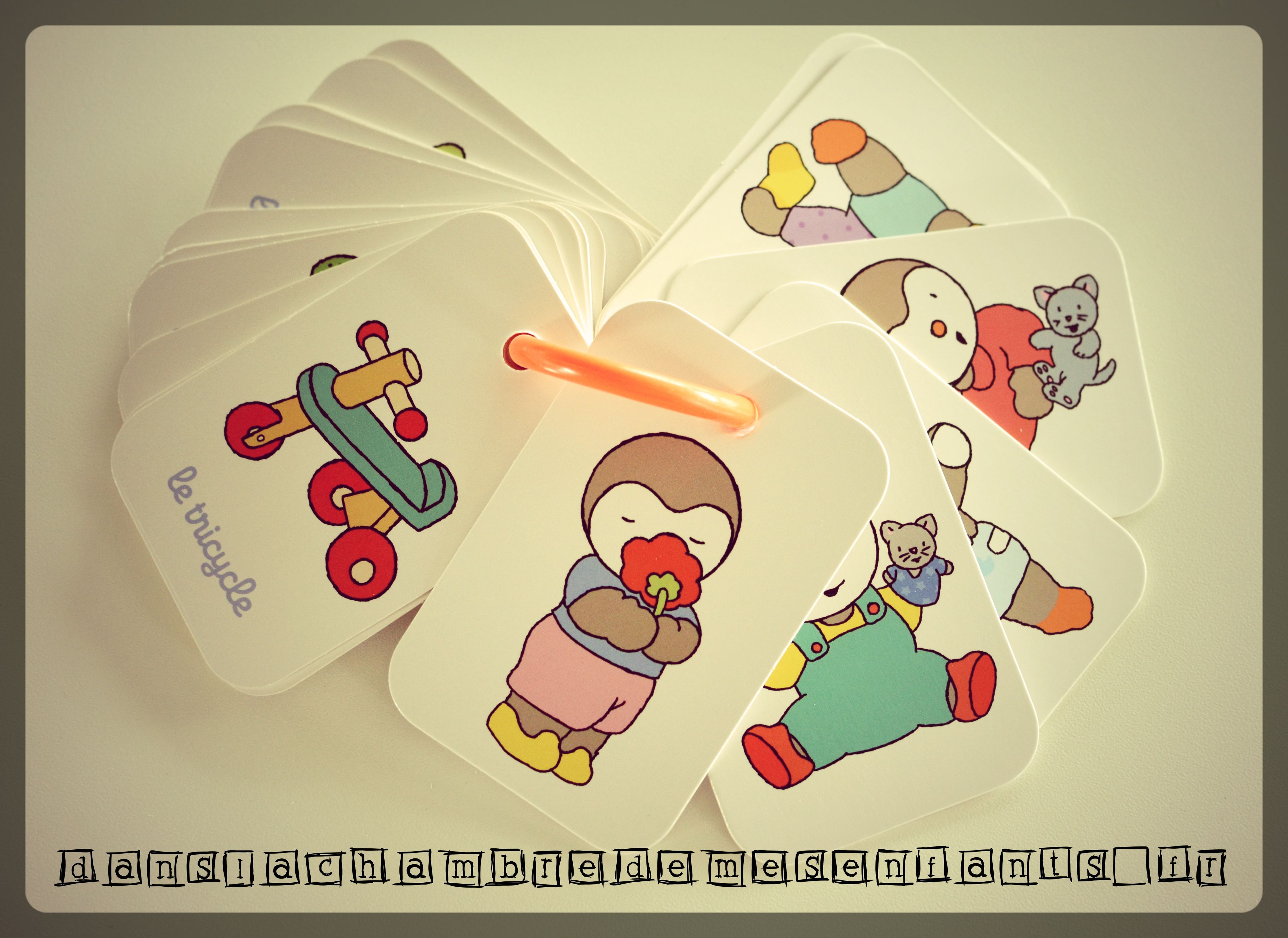 Il s’agit plus exactement d’une vingtaine de grandes cartes cartonnées, présentant des images couleurs : au recto, un objet sous légende (biberon, ballon…) et, au verso, leur mise en situation avec bébé T’choupi (boire le biberon, jouer au ballon…). Un anneau plastique relie les cartes entre elles et il facilite la manipulation par les petites mains, dès 9 mois. Vous pouvez également les utiliser sans l’anneau puisqu’il dispose d’un système d’ouverture.