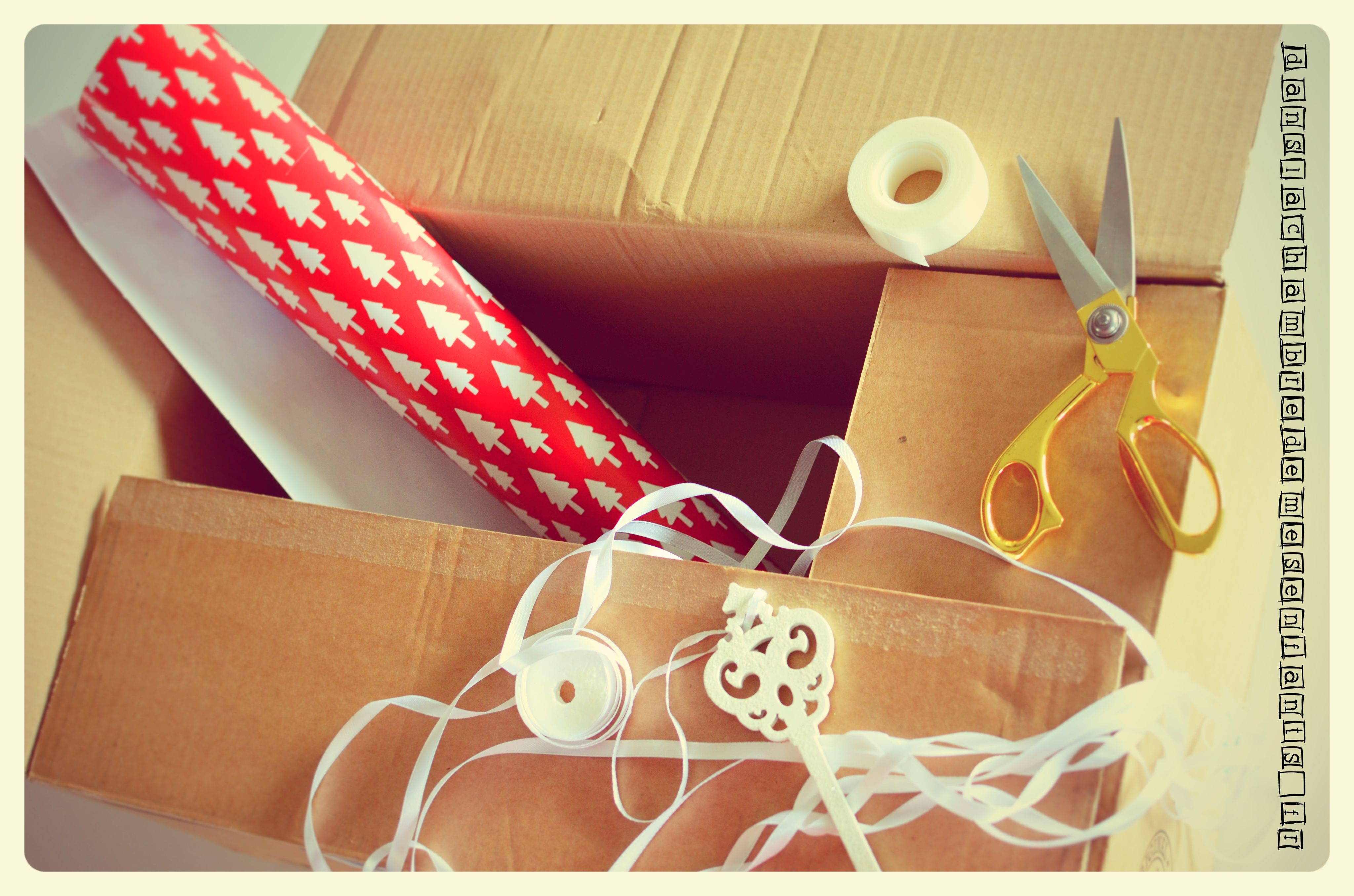 Alex maîtrise le calendrier et sa sœur est trop jeune pour en faire l’apprentissage. J’ai donc choisi de ne pas matérialiser le décompte sur une frise mais de l’adapter au support du jeu : je vais décorer un carton en cadeau dans lequel je cacherai l’objet du jour. Si l’objet est trop gros, exceptionnellement il ne sera pas dans la boîte mais ils auront la surprise d’une 2ème devinette dans la boîte avant de leur faire découvrir. Le jour sera inscrit sur un papier découpé en médaillon, attaché au ruban qui fermera le cadeau.