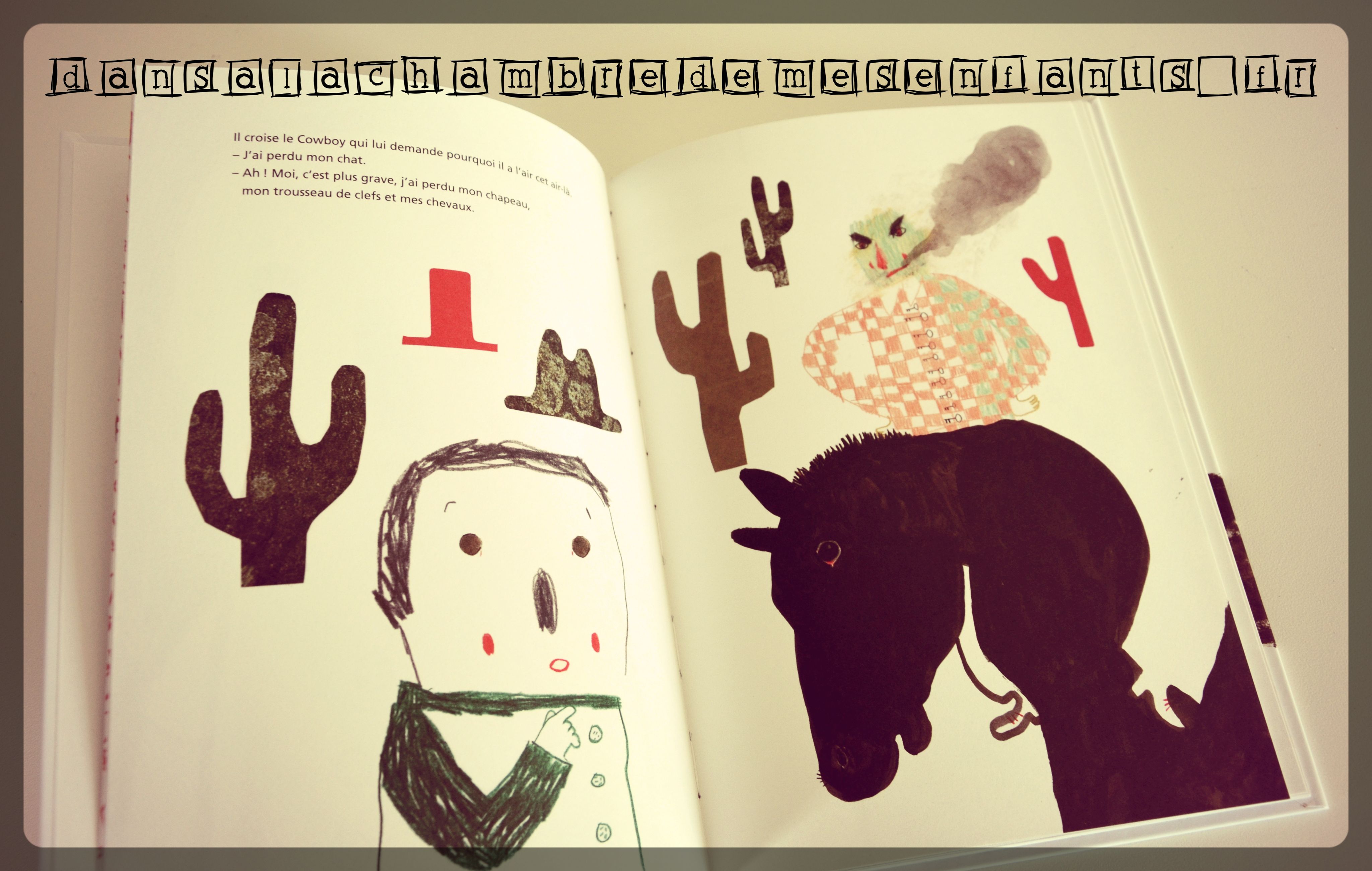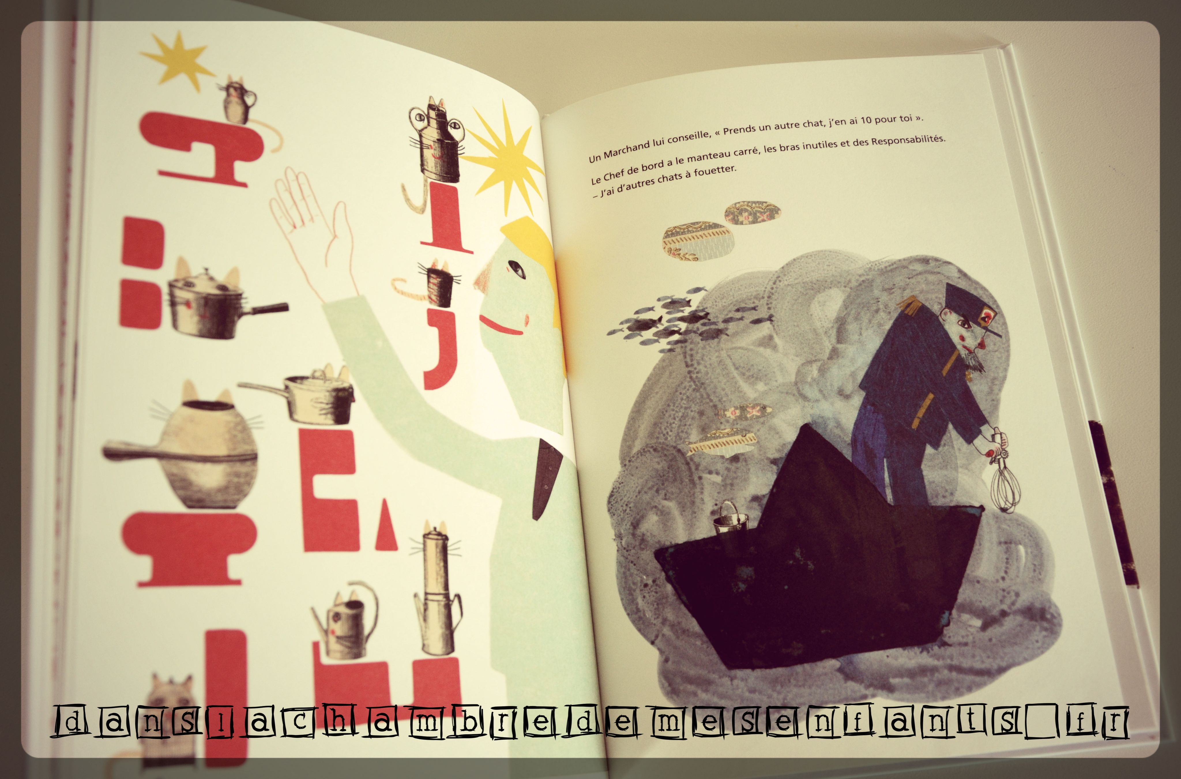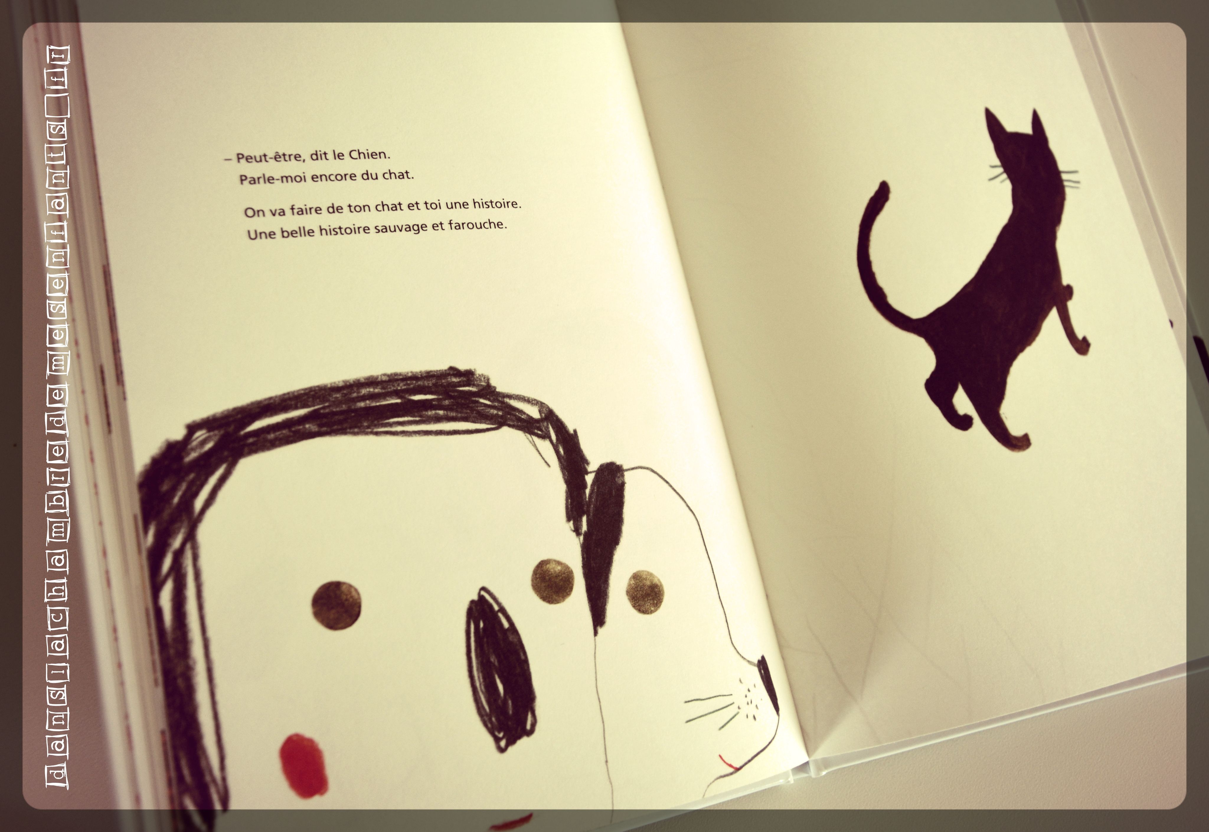 Ce livre a un style bien à lui : les illustrations surprennent d’abord, l’histoire étonne ensuite. Broutille est griffonné au feutre, la vieille Dame Dodeline couverte de collages, les bottes de l’Ogre semblent en carton… je n’aime personnellement pas beaucoup le côté artistique mais je reconnais qu’il donne de la personnalité à l’ouvrage en renforçant l’histoire. Il y est question d’un garçon nommé « Broutille » qui cherche son chat et, sur son chemin, chacun aura mieux à faire, souvent pires problèmes. Il ne les contredira pas mais c’est la rencontre avec le Chien qui changera le ton car il le questionnera sur son chat, son sujet, ajoutant une dernière phrase « On va faire de ton chat et toi une histoire. Une belle histoire sauvage et farouche. » (à l’image de son animal) ou comprendre un obstacle de la vie pour mieux avancer.