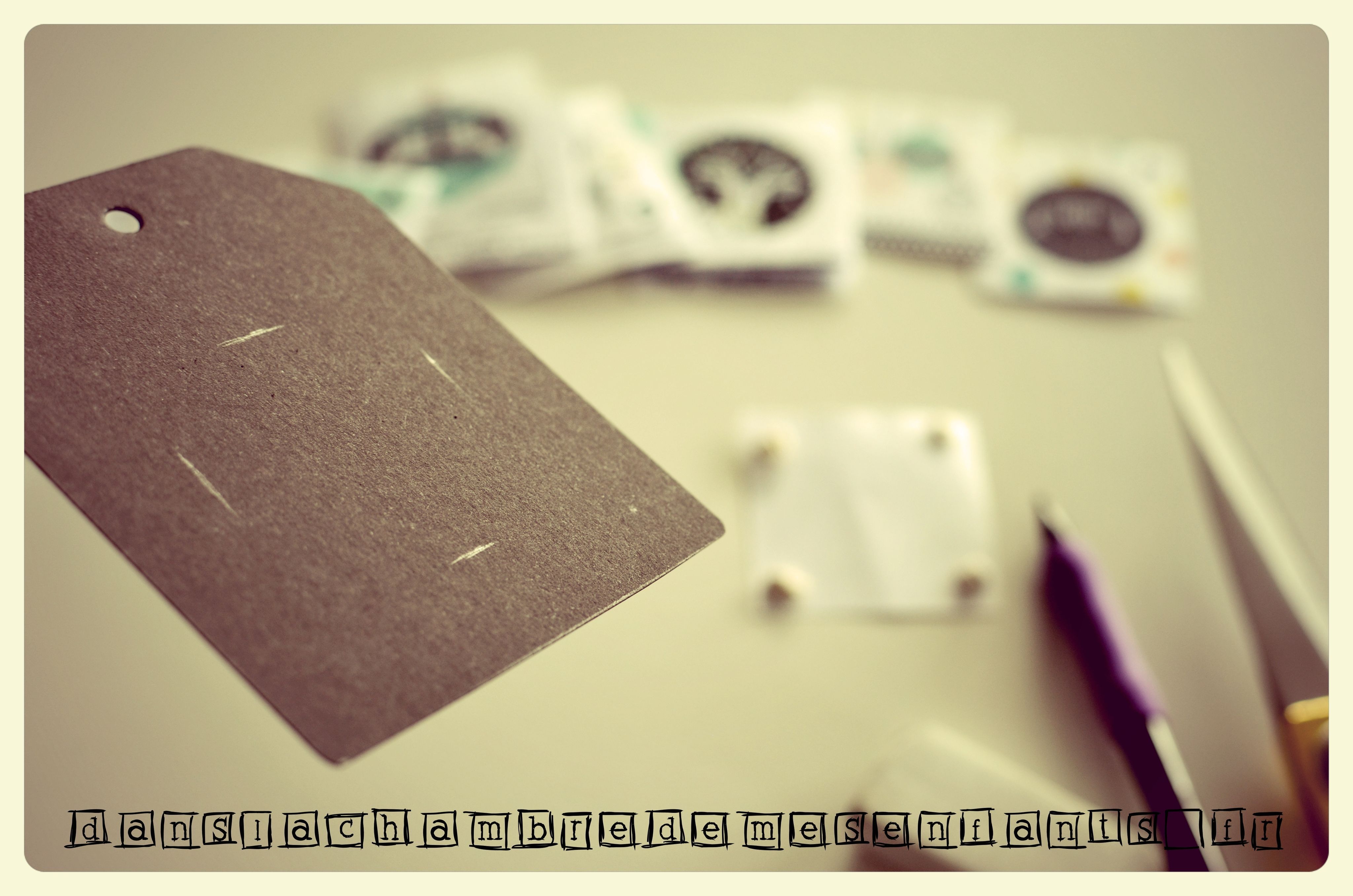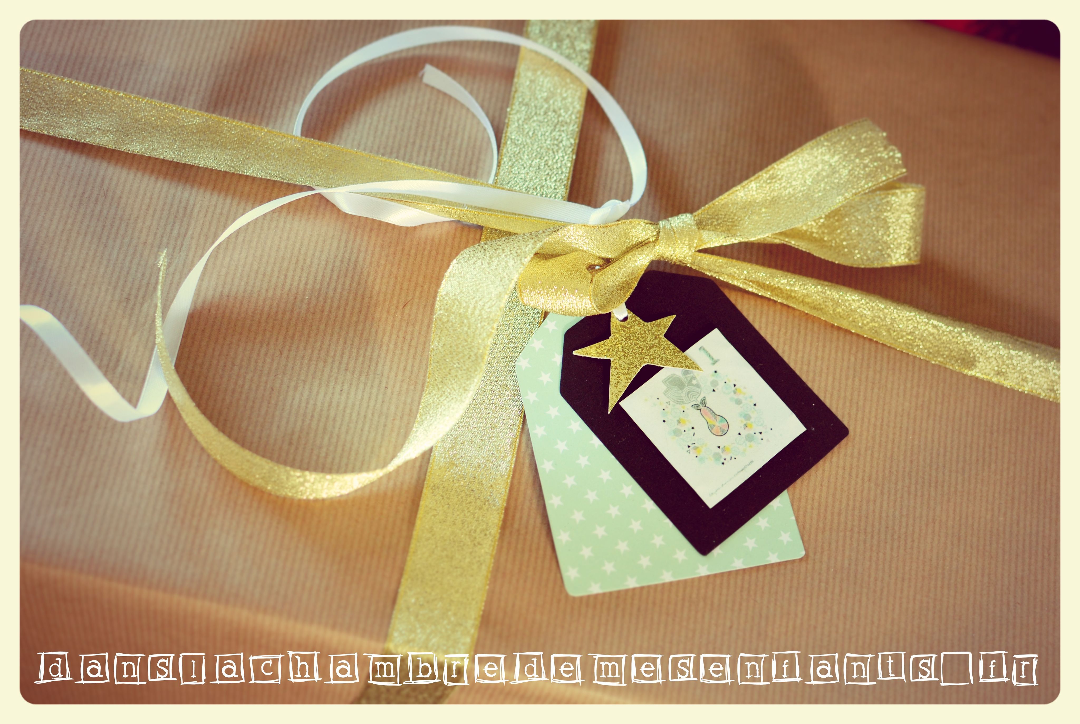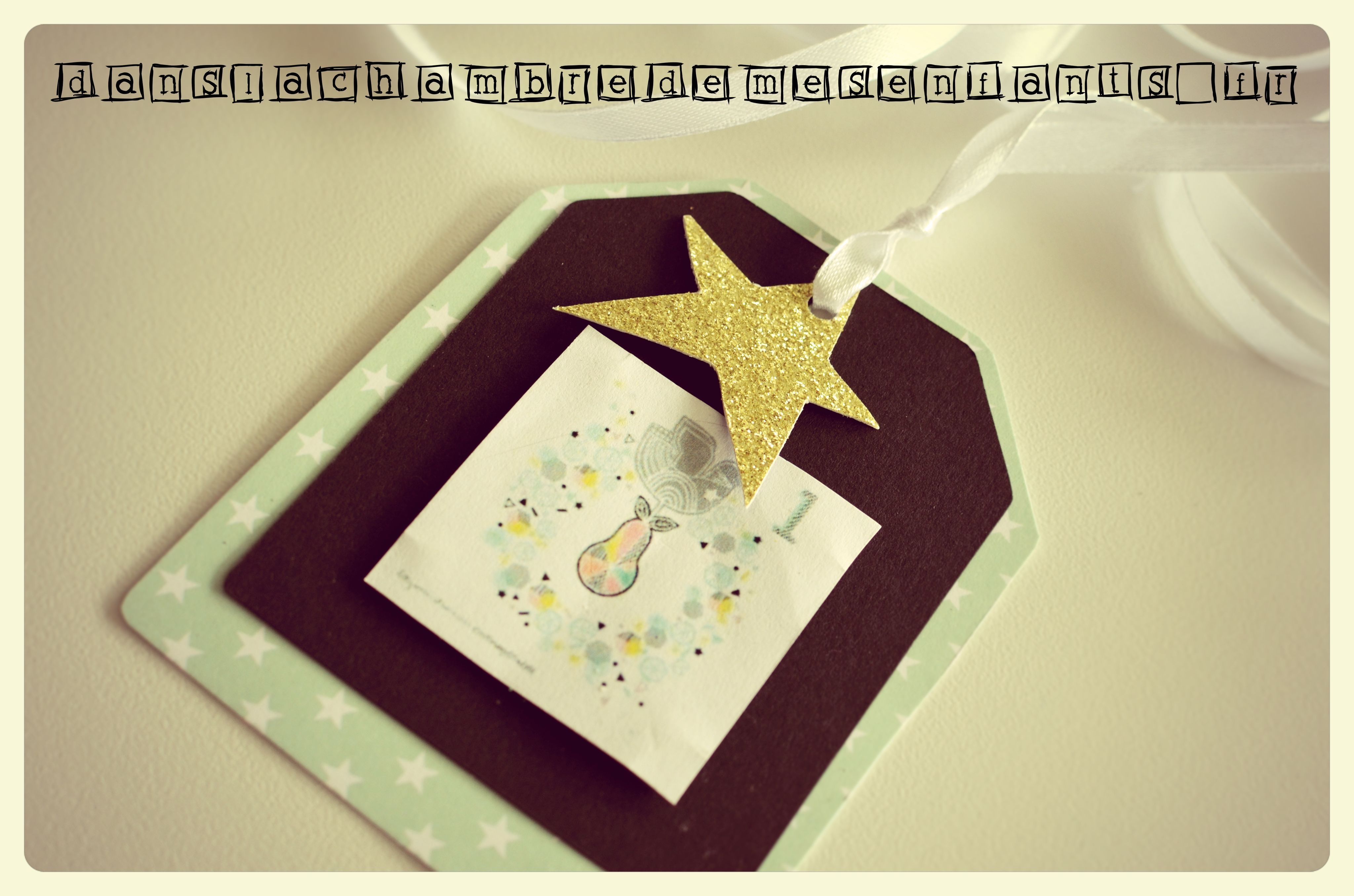 Le papier noir a été utilisé comme support aux étiquettes imprimées. Le papier doré a pris la forme d’une étoile pour améliorer le rendu. J’ai perforé les papiers cartonnés au sommet pour y glisser un ruban, les regroupant ainsi et permettant de les attacher à la ficelle fermant le cadeau.
