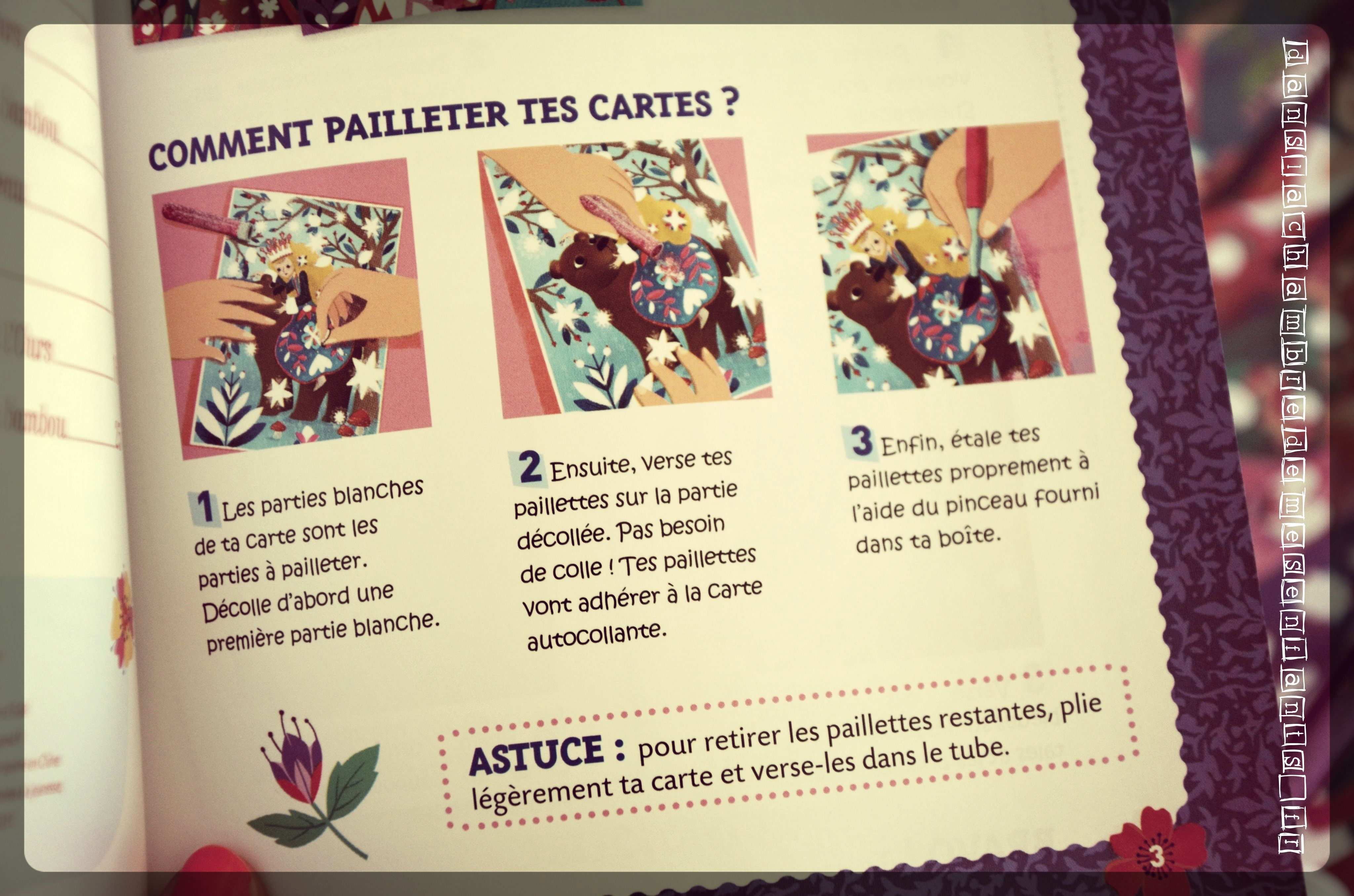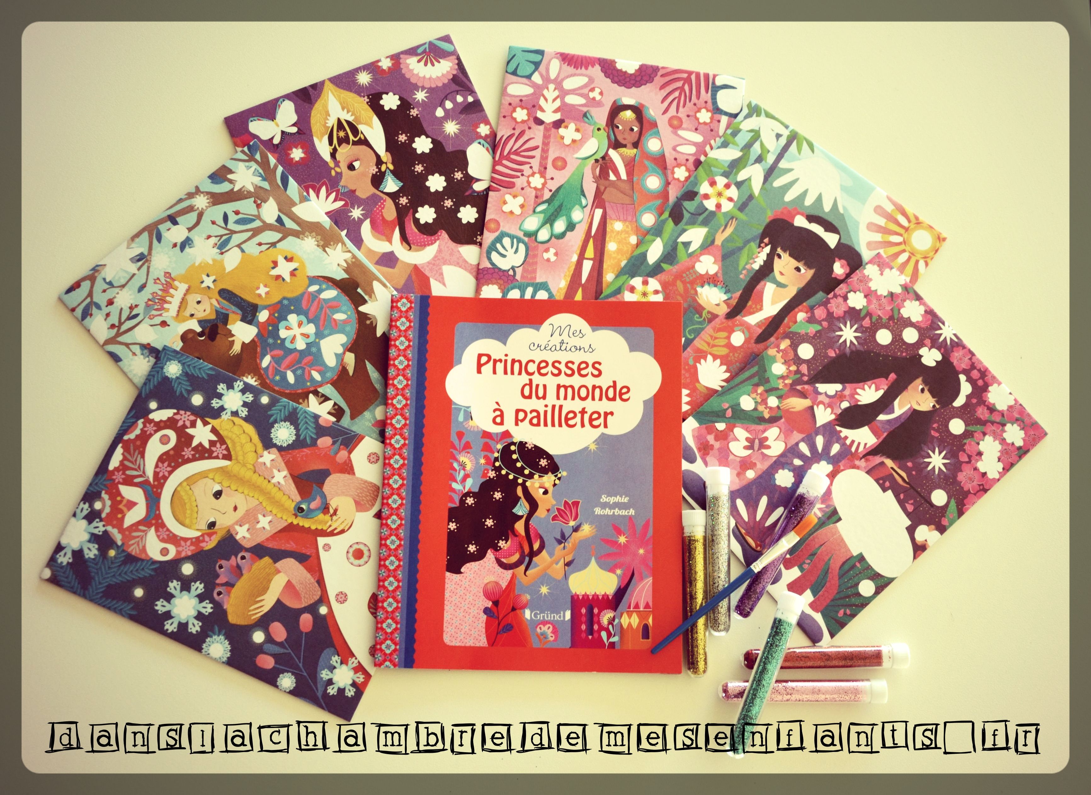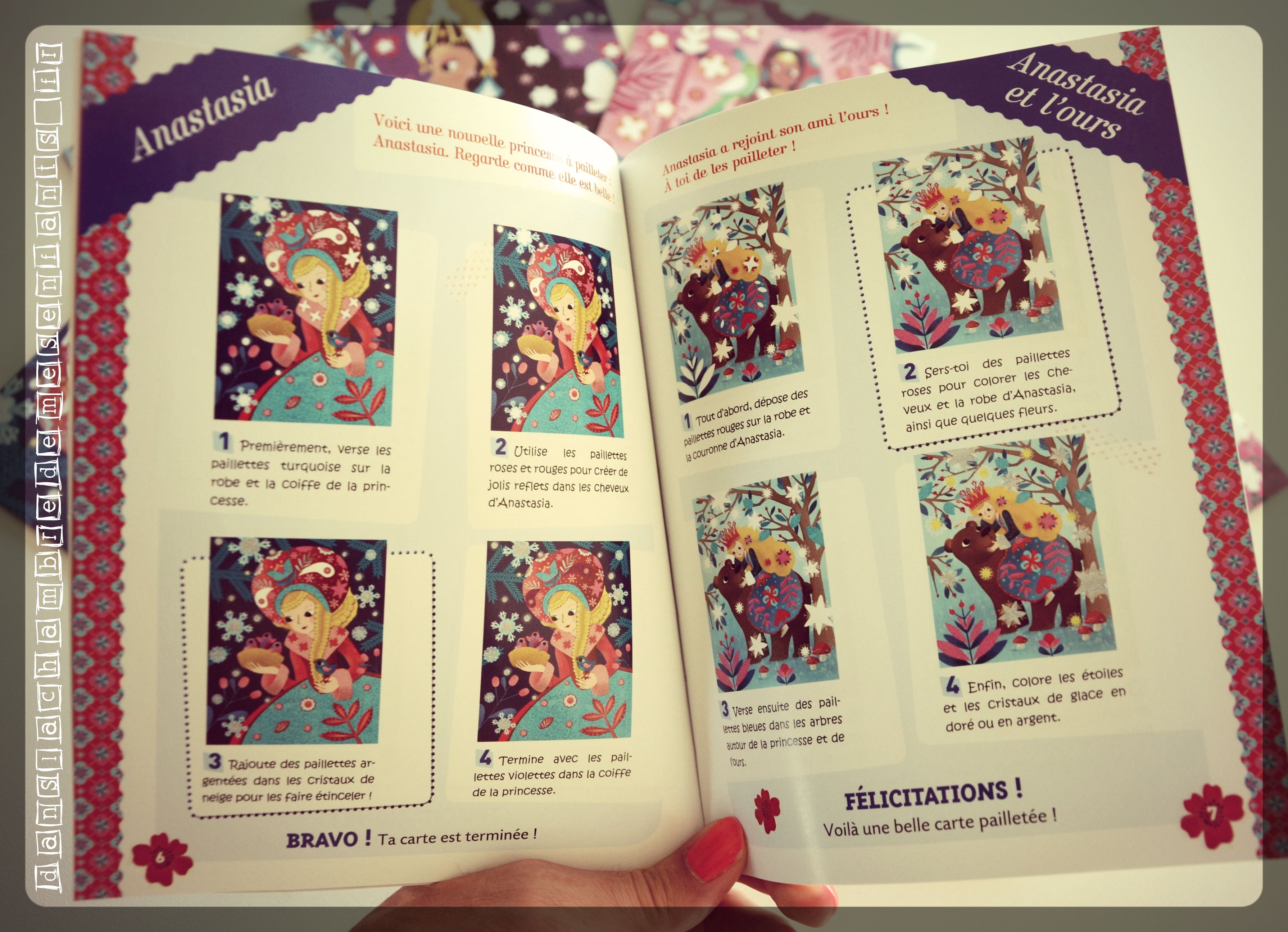 Sur le même principe que « Les cartes à métalliser », il s’agit de 6 scènes à embellir à l’aide de matière : il suffit de décoller le papier des parties non colorées des tableaux, qui dévoilent une surface autocollante sur laquelle adhèrent les paillettes (6 tubes de paillettes de couleur) à saupoudrer et étaler au pinceau. Un carnet réserve quelques pages pour accompagner l’activité (bref mode d’emploi et réalisation de chaque tableau en 4 étapes) puis il présente 3 histoires illustrées des princesses du coffret (Shéhérazade, La Princesse et l’Ours, La Princesse du bambou). Les tableaux sont imprimés sur un épais support cartonné au format de 135 x 175 mm à l’image de Shéhérazade, Jasmine, Anastasia, Anastasia et l’ours, La Princesse du bambou et Kaguya au ruisseau.