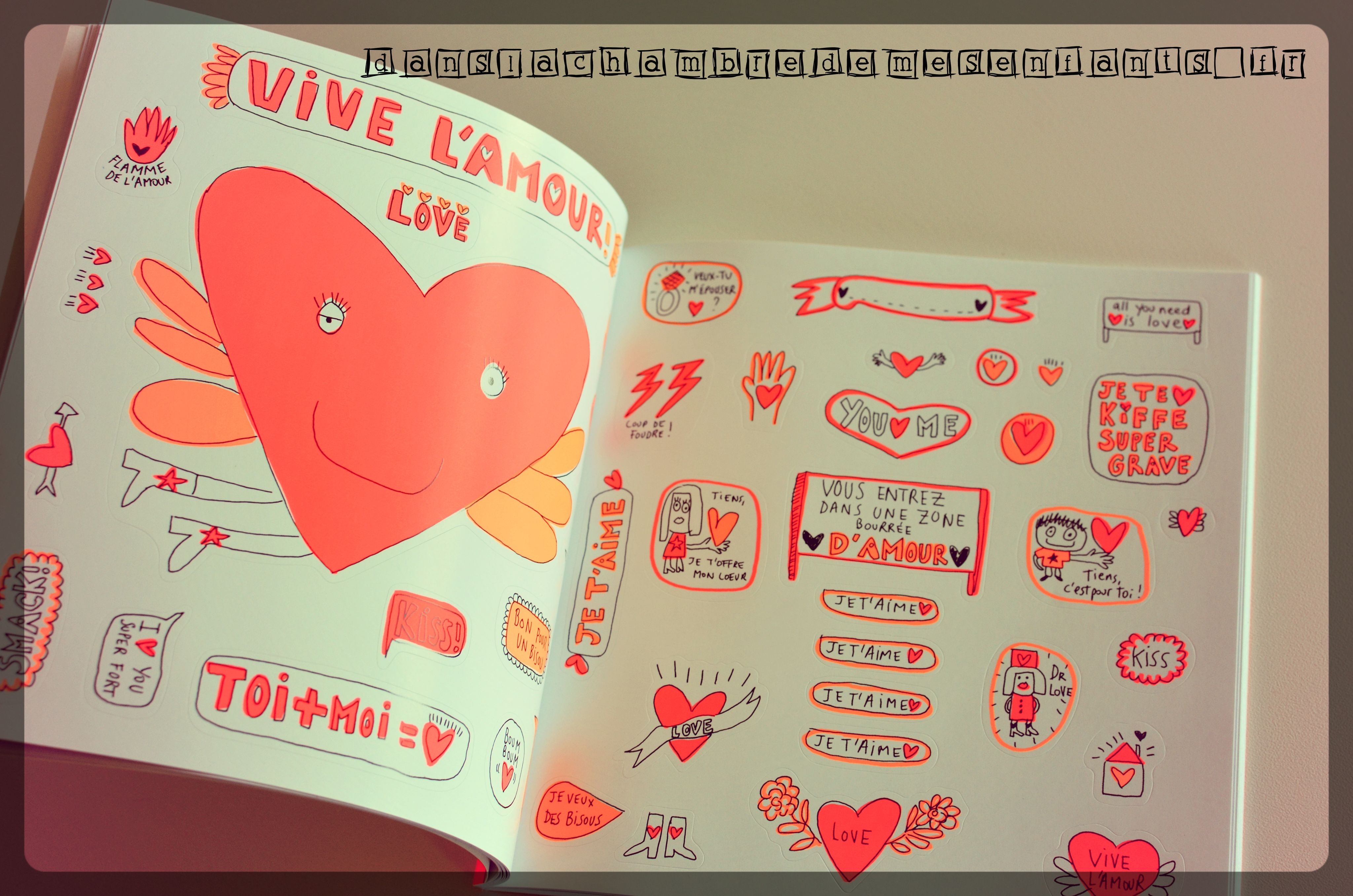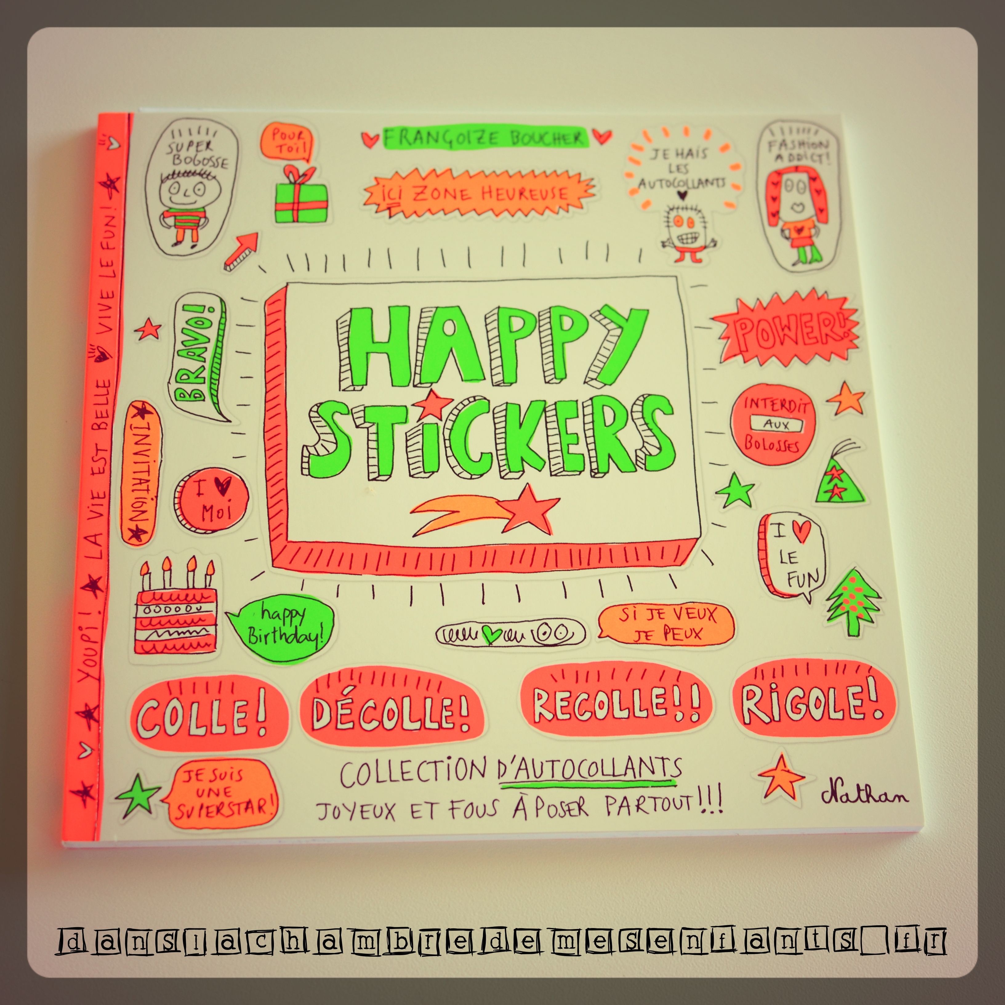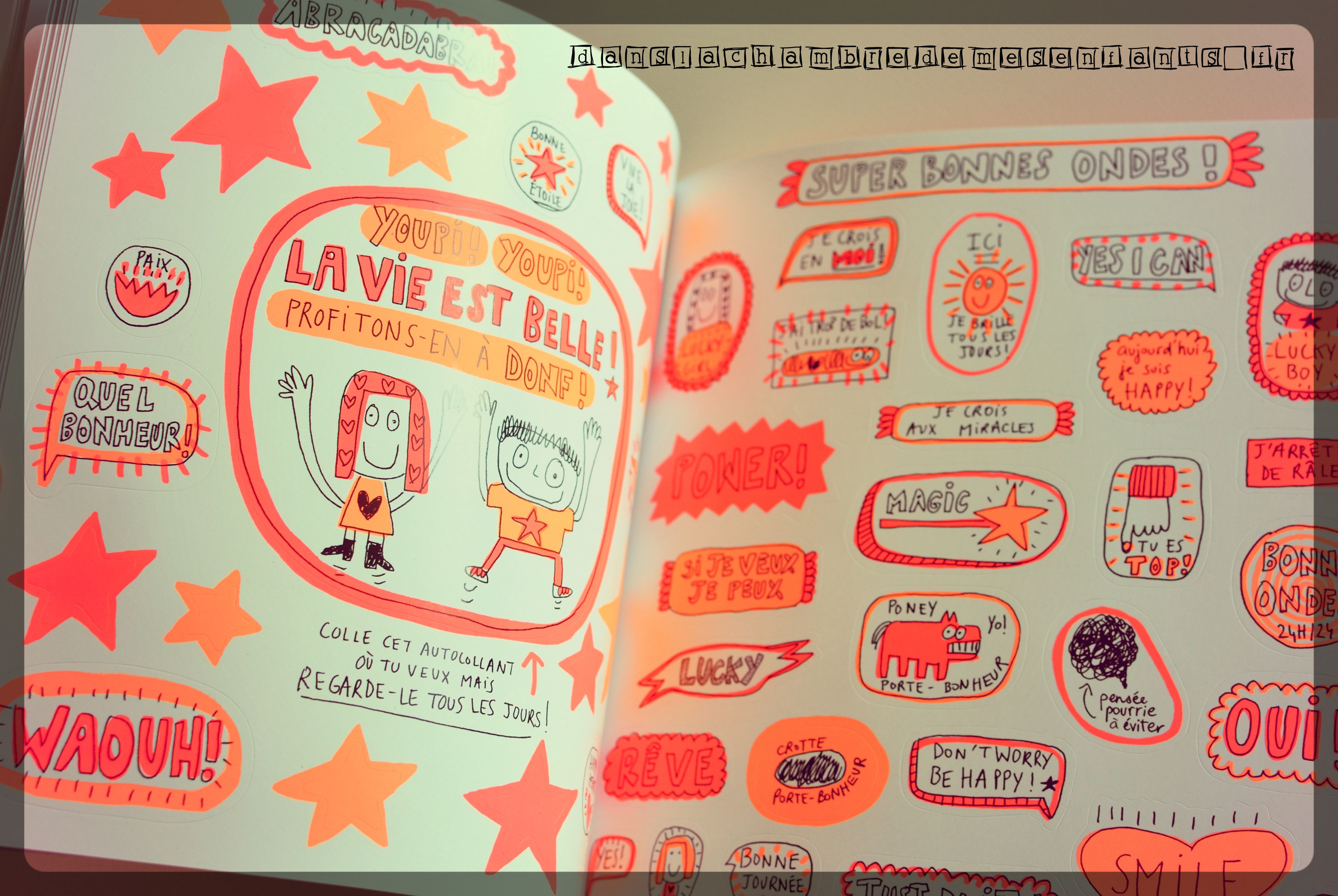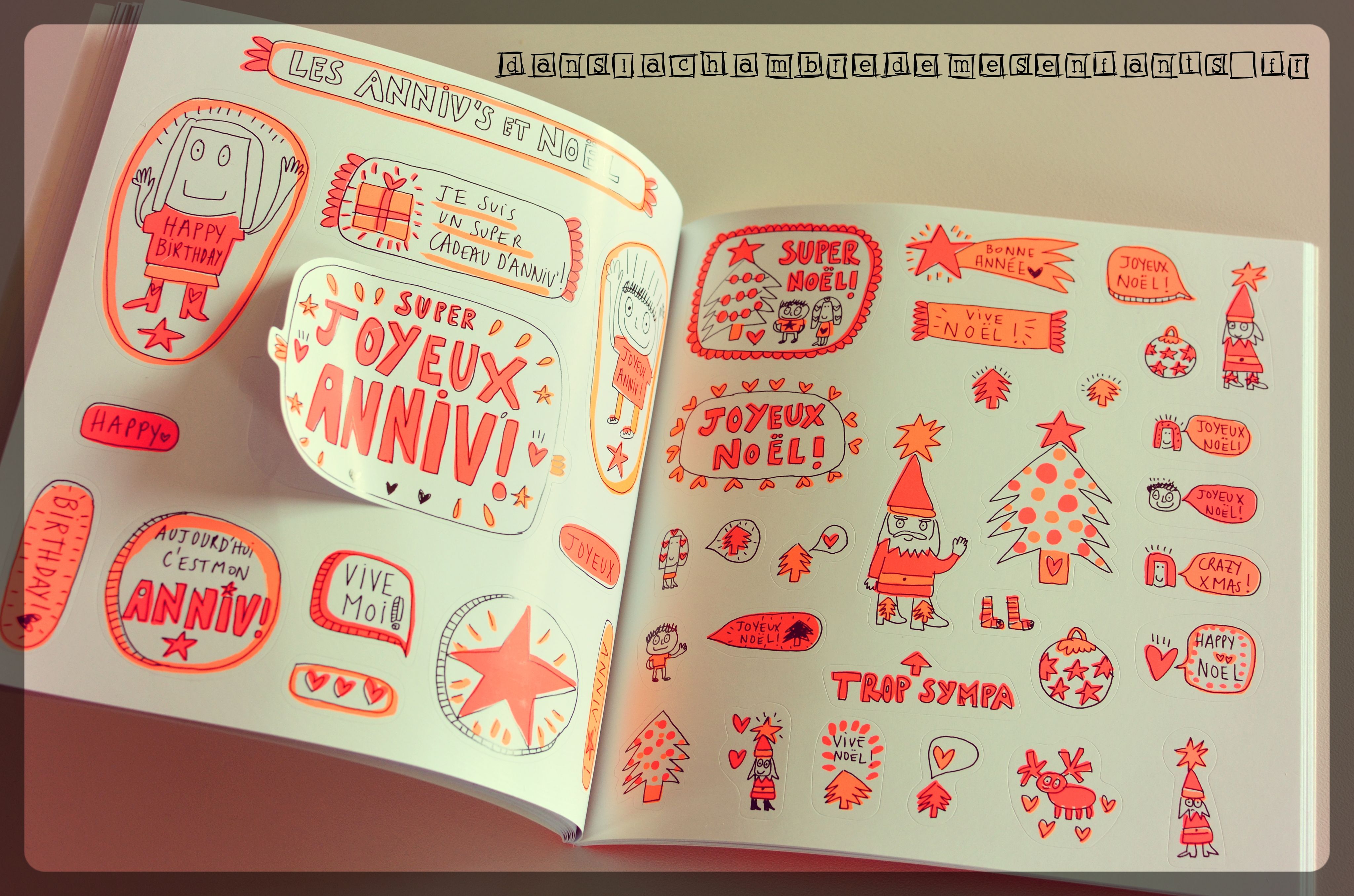 Françoize Boucher revient pour mettre de la couleur ou plutôt des stickers fluo dans la vie des enfants ! Elle conserve son style griffonné, emprunt d’humour et de spontanéité, pour traduire des sentiments, des évènements, des messages, etc (ex : des cœurs, « Vive l’amour », « Super Noël », « Top secret », « Grrr », « Pas touche ! Je mords ! »).
