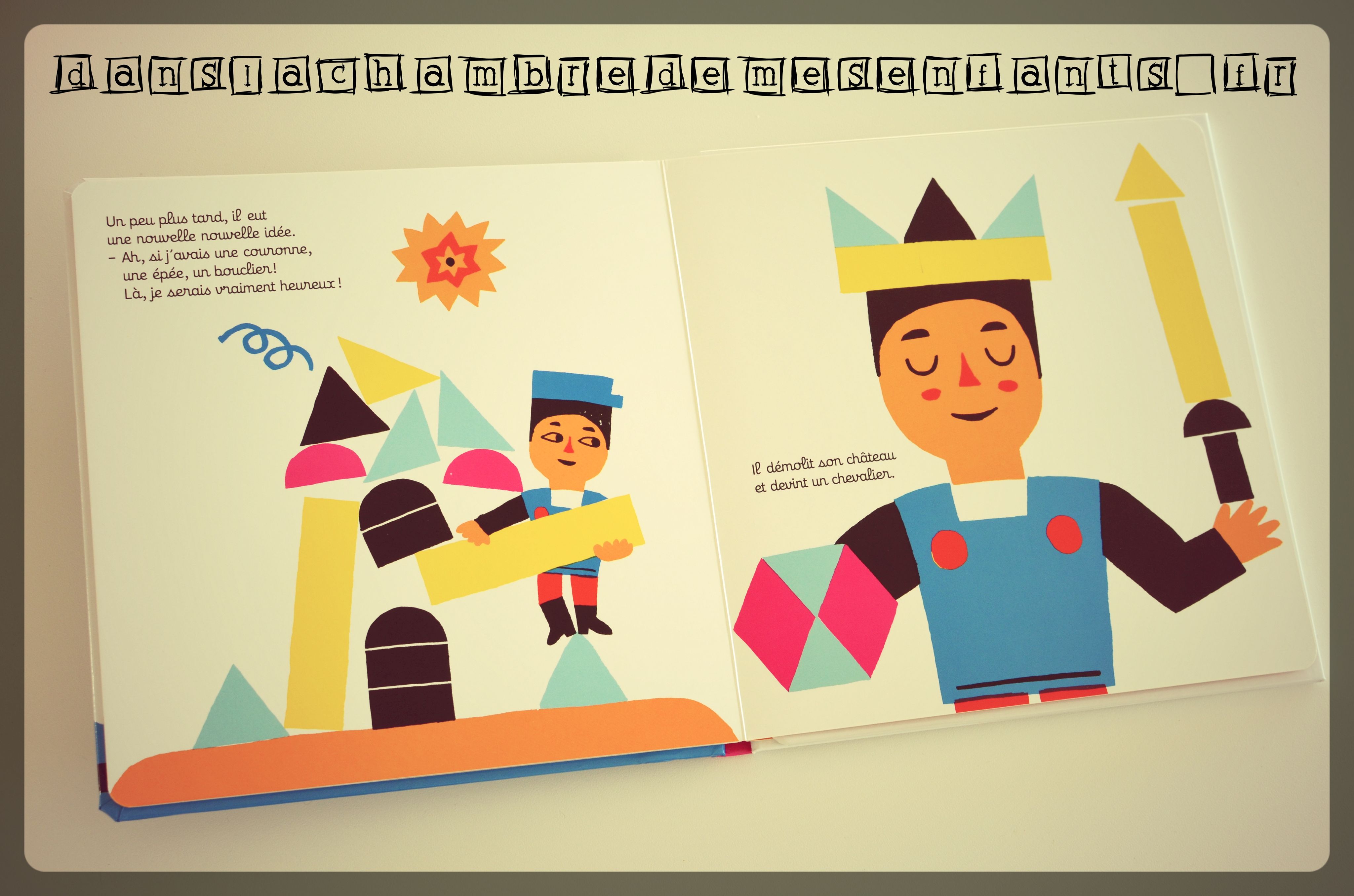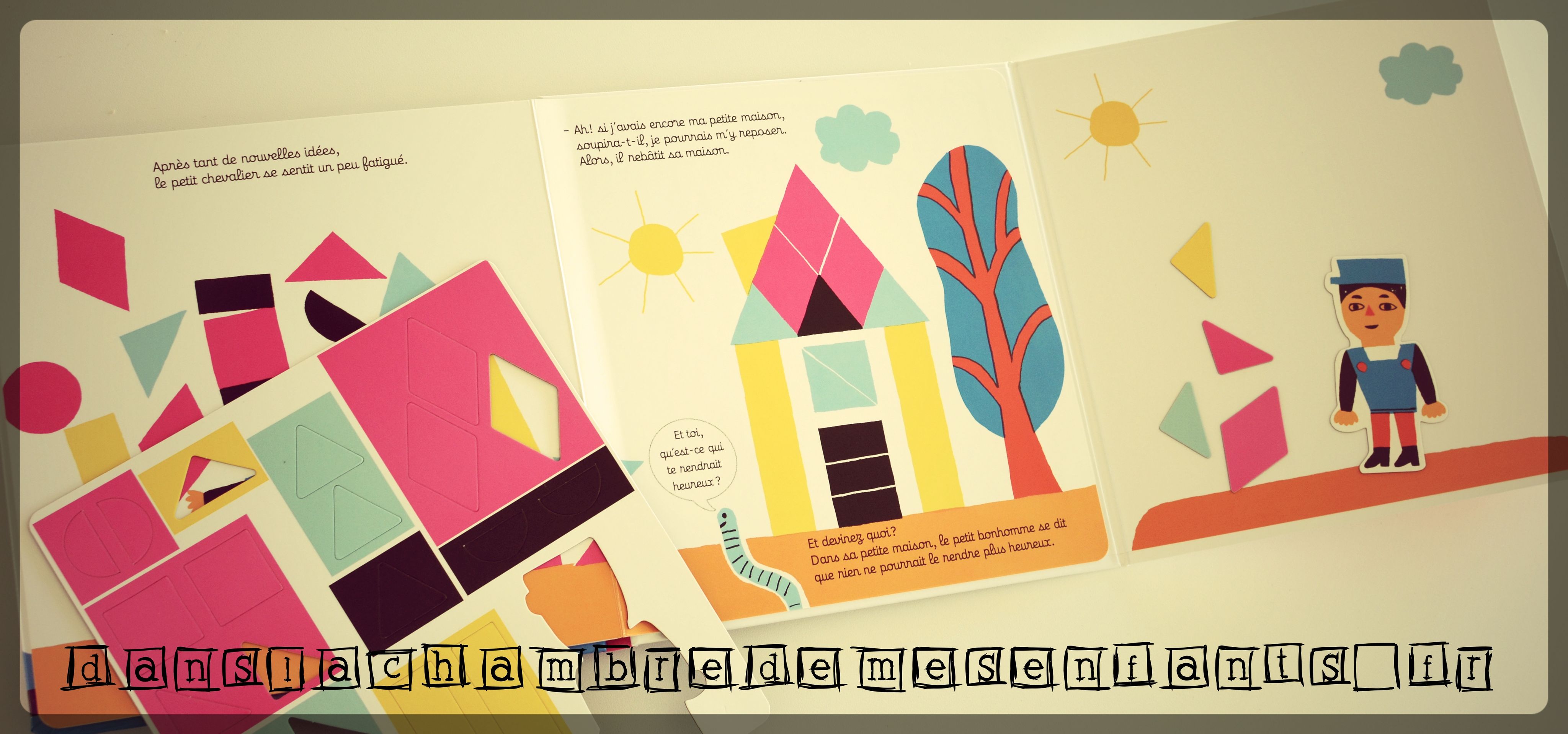 Il est ici question d’un « petit bonhomme » qui cherchait le bonheur à travers ses projets : la construction d’une maison, puis d’une voiture, d’un château… et ce à partir des formes dont il dispose, jusqu’à enfin être satisfait de sa petite maison. Les illustrations sont enfantines, simples et fortes en contraste, sur un fond blanc. Le 3ème volet est complété d’une planche de 23 magnets reprenant lesdites formes (demi-cercle, carré, triangle, rectangle, en rose, noir, bleu et jaune) et le personnage de l’histoire. L’enfant peut ainsi créer des constructions et/ou reproduire celles de l’histoires, au nombre de 6.