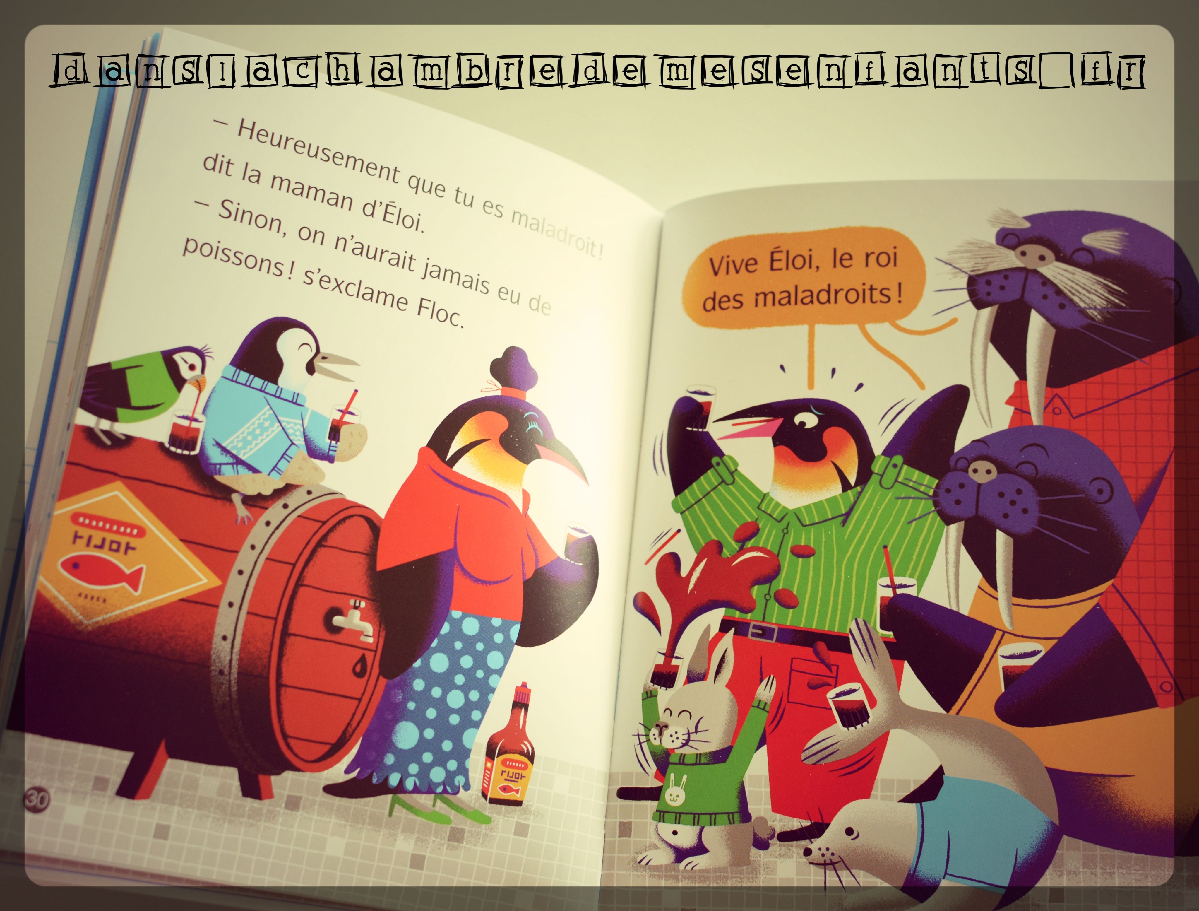 Eloi est un petit manchot qui multiplie les maladresses et, honteux, il décide de partir loin. Ses gestes ne sont pas plus maitrisés et il finit dans l’eau glacé, après être tombé dans un trou de la banquise. Mais, son défaut lui permet de trouver des poissons qu’il ramène chez lui : le voilà Roi des maladroits pour le plus grand plaisir de tous !