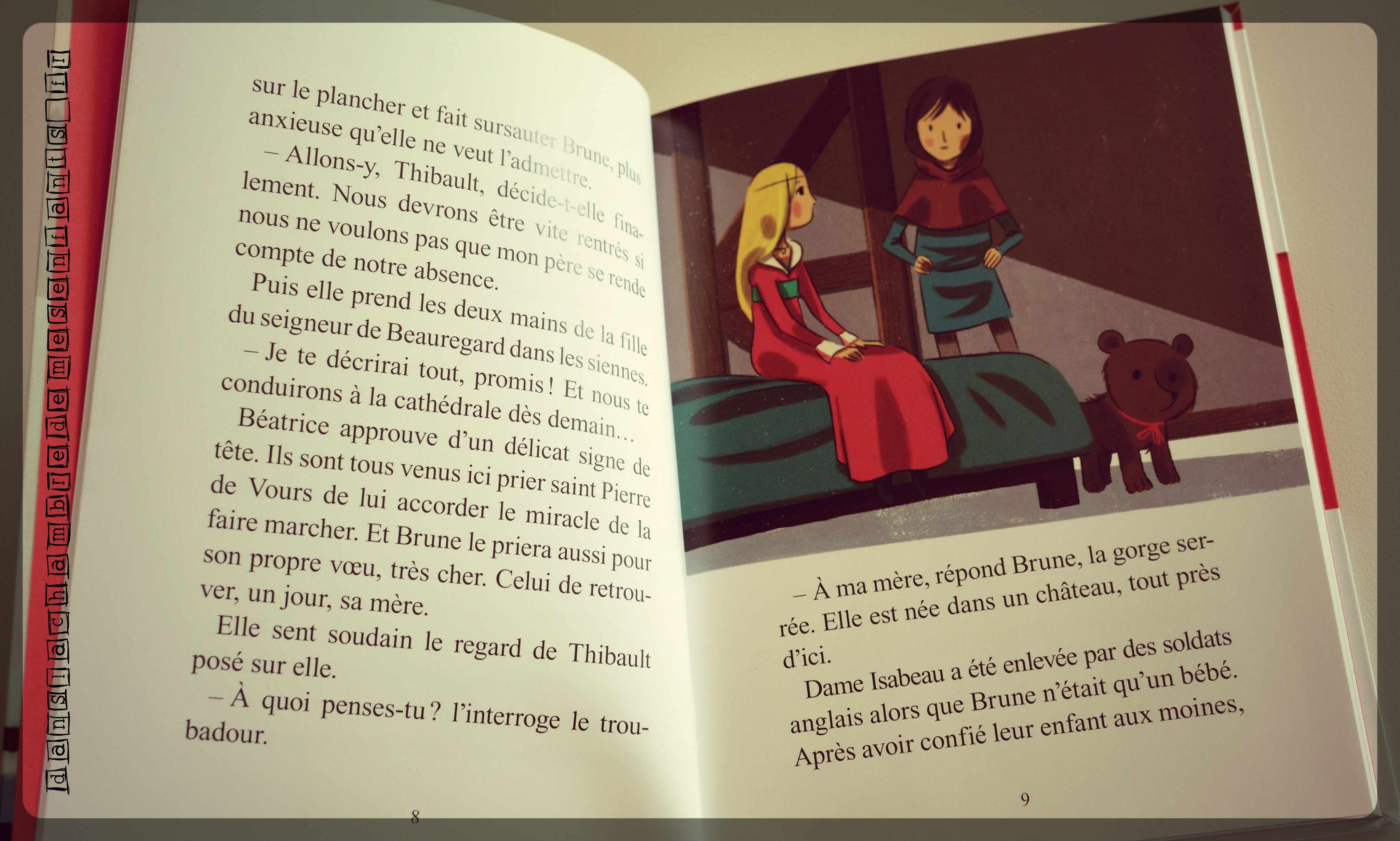 Brune du lac est un peu la « Anouk » du moyen âge, une petite fille courageuse qui mène des enquêtes, armée d’une épée de bois en se promettant d’être, un jour, chevalière. Alors qu’elle se trouve à Saint-Pierre-de-Vours, proche de la résidence natale de sa mère disparue, Brune décide de poursuivre les recherches pour la retrouver. Un bijou attire son attention et l’histoire se mêlera à la disparition de son amie Béatrice et de son ours. Ses 2 quêtes lui réservent, chacune, une bonne nouvelle…