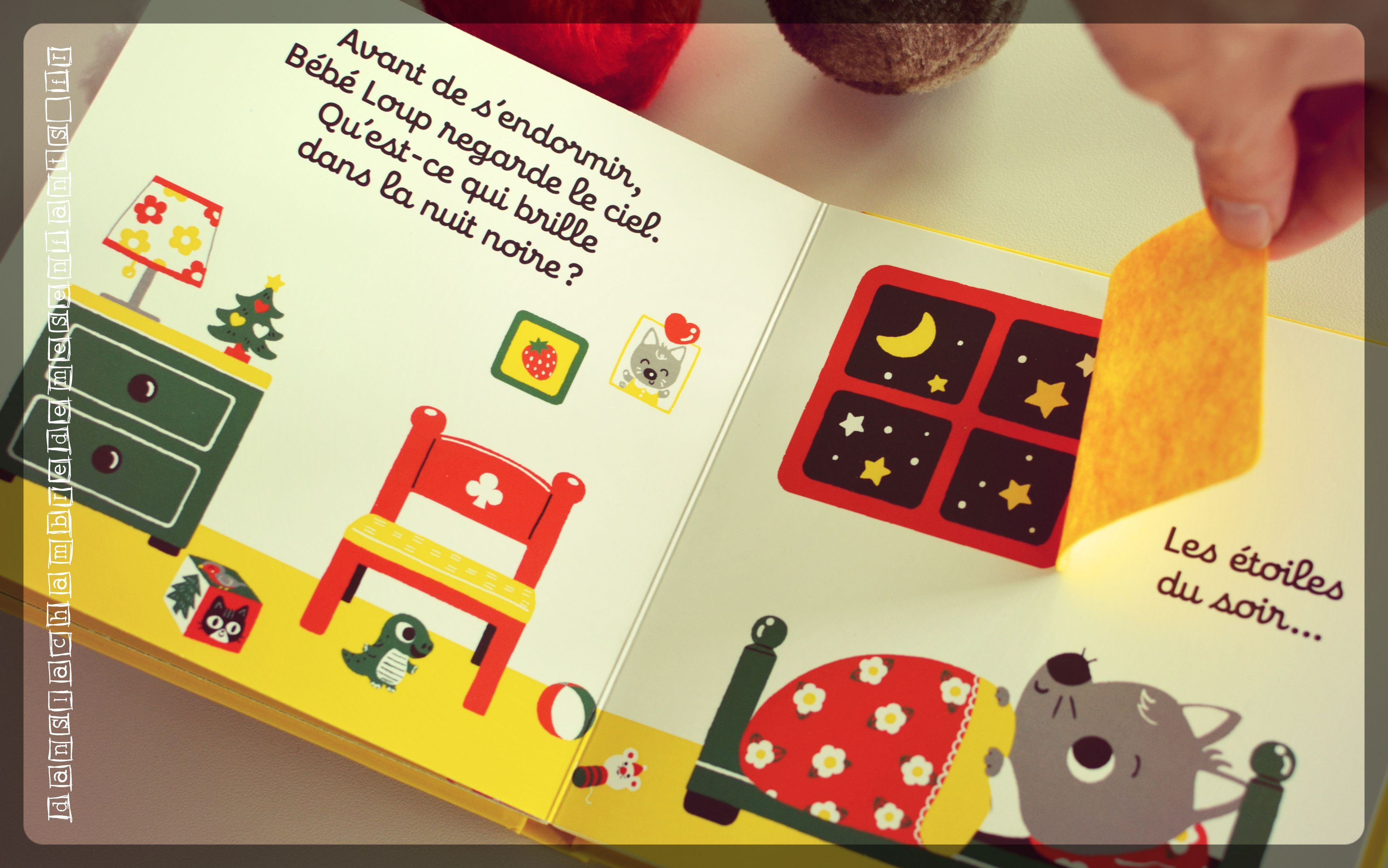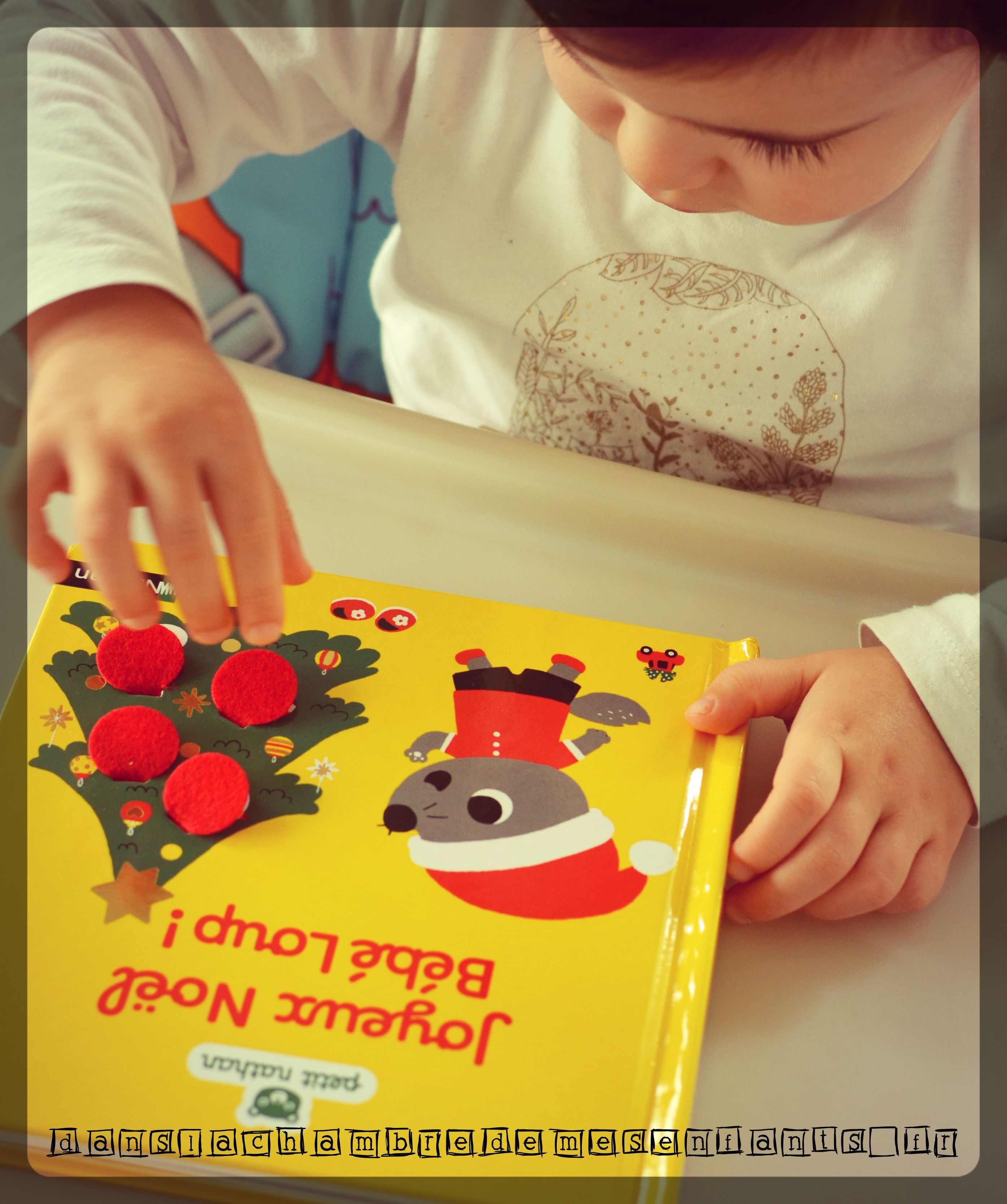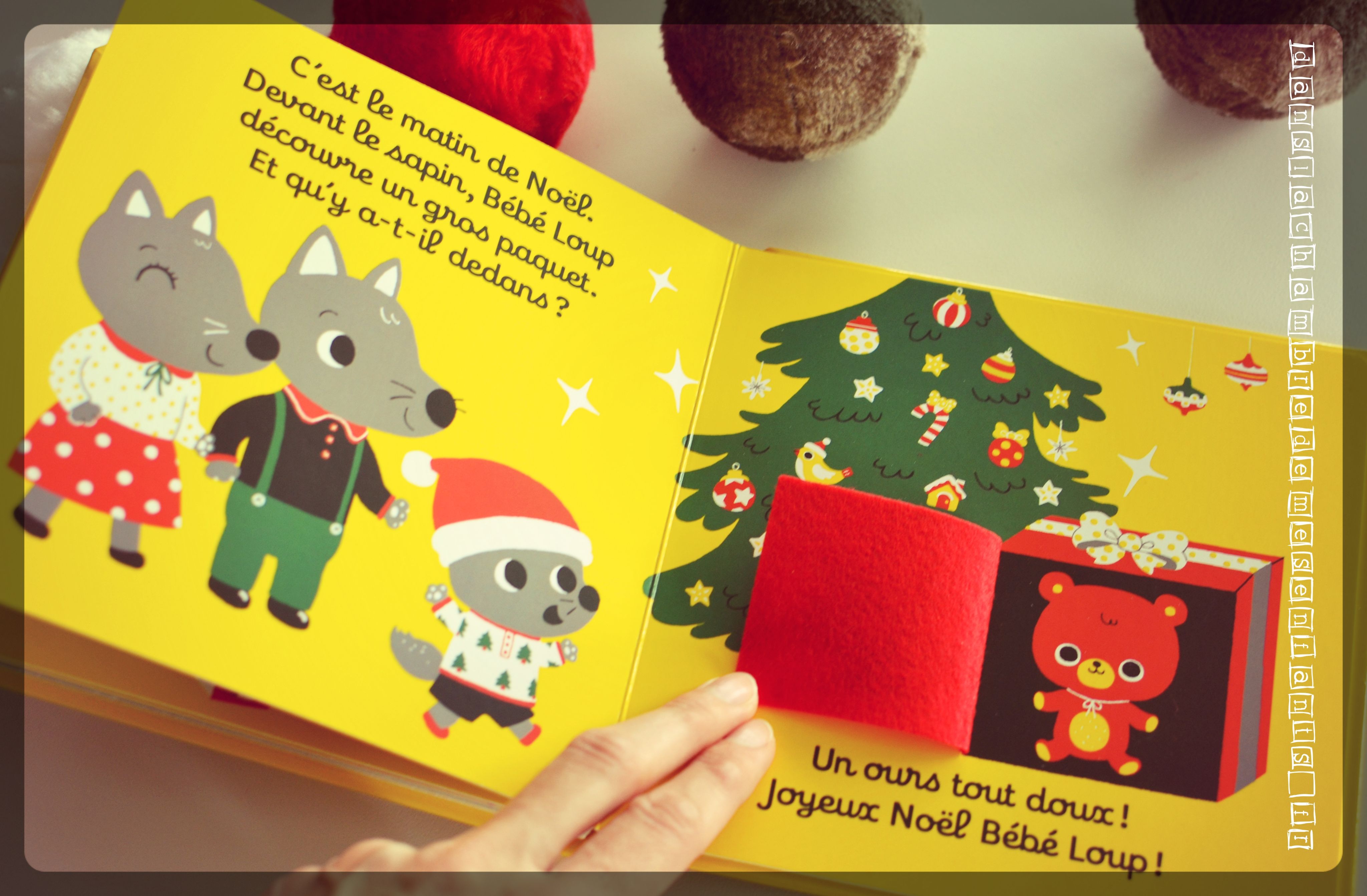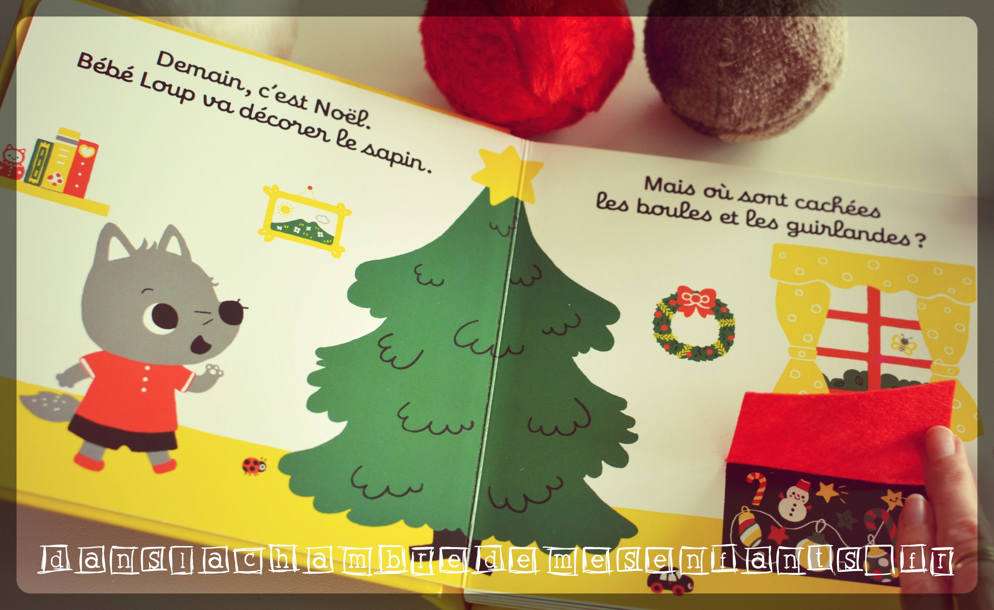 Notre cher Bébé Loup raconte sa journée du 24 décembre jusqu’au petit matin de Noël pour mettre en avant les moments marquants de cette fête : les décorations, les pâtisseries, le coin du feu avec les petits chaussons, le coucher et la découverte de son cadeau en famille. La lecture invite systématiquement à jouer à chercher ce qui se cache derrière le tissu, et ce dès la couverture (couvercle de la boîte des décorations, portes du meuble de la cuisine, rideau de sa fenêtre…).