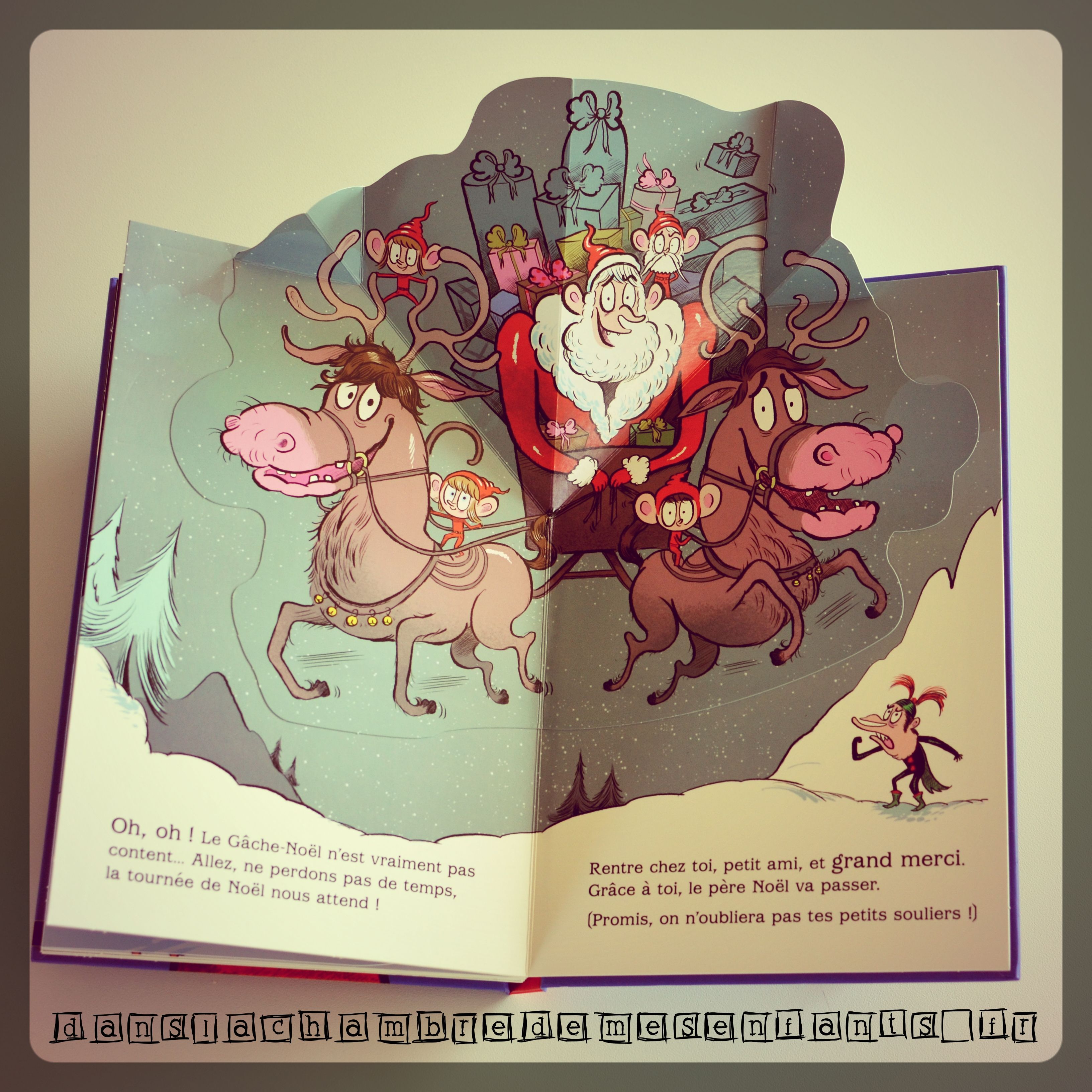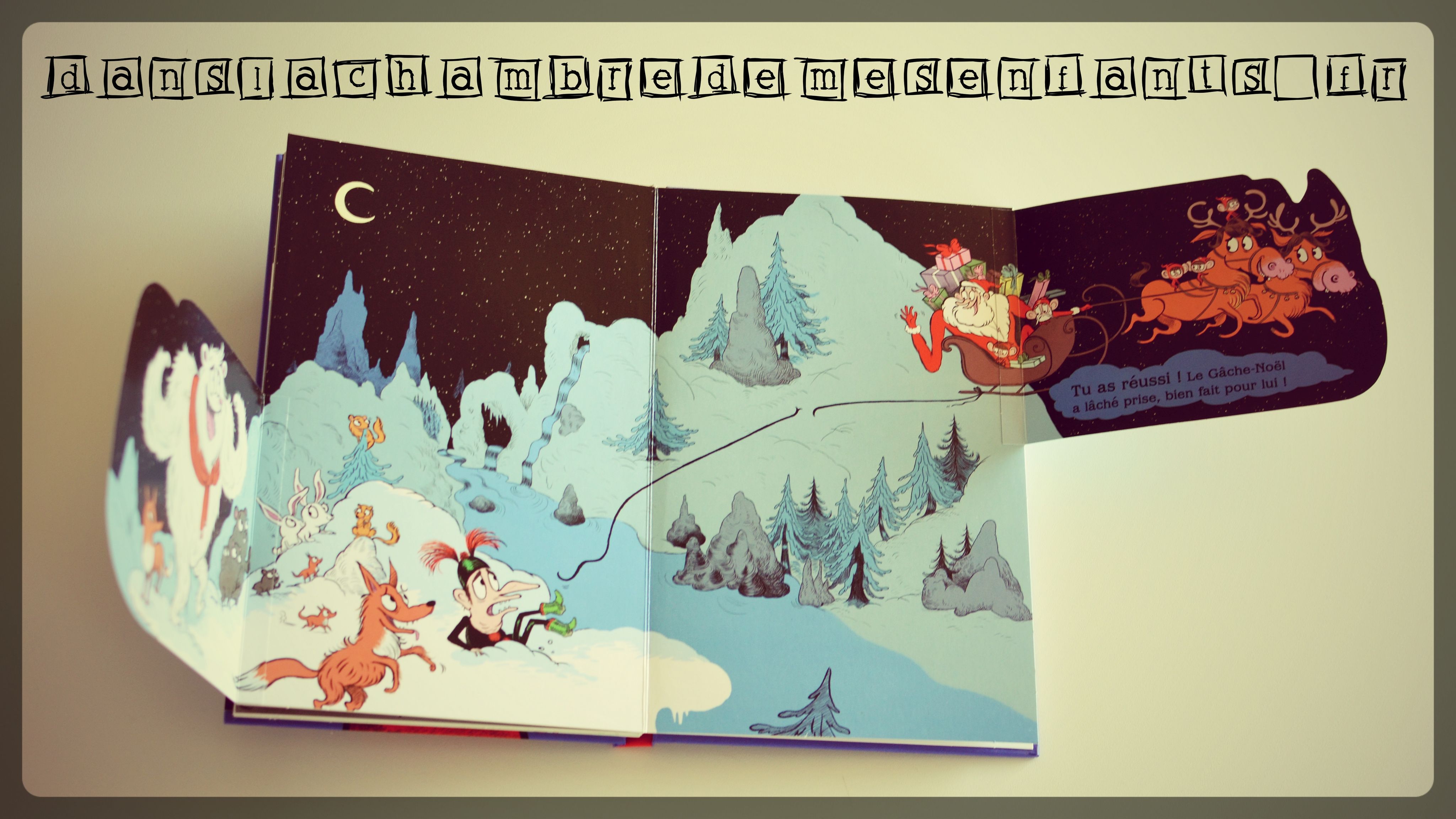 L’avis des enfants : Alex, 6 ans, le trouve amusant, comme le titre précédent. Il a eu vite fait de le partager avec sa petite sœur qui adore les livres à rabats mais mon fils comprend davantage l’humour qui ponctue l’histoire. Certes, les enfants aiment les douces histoires de Noël mais un peu d’aventure ne fait pas de mal (au contraire).
