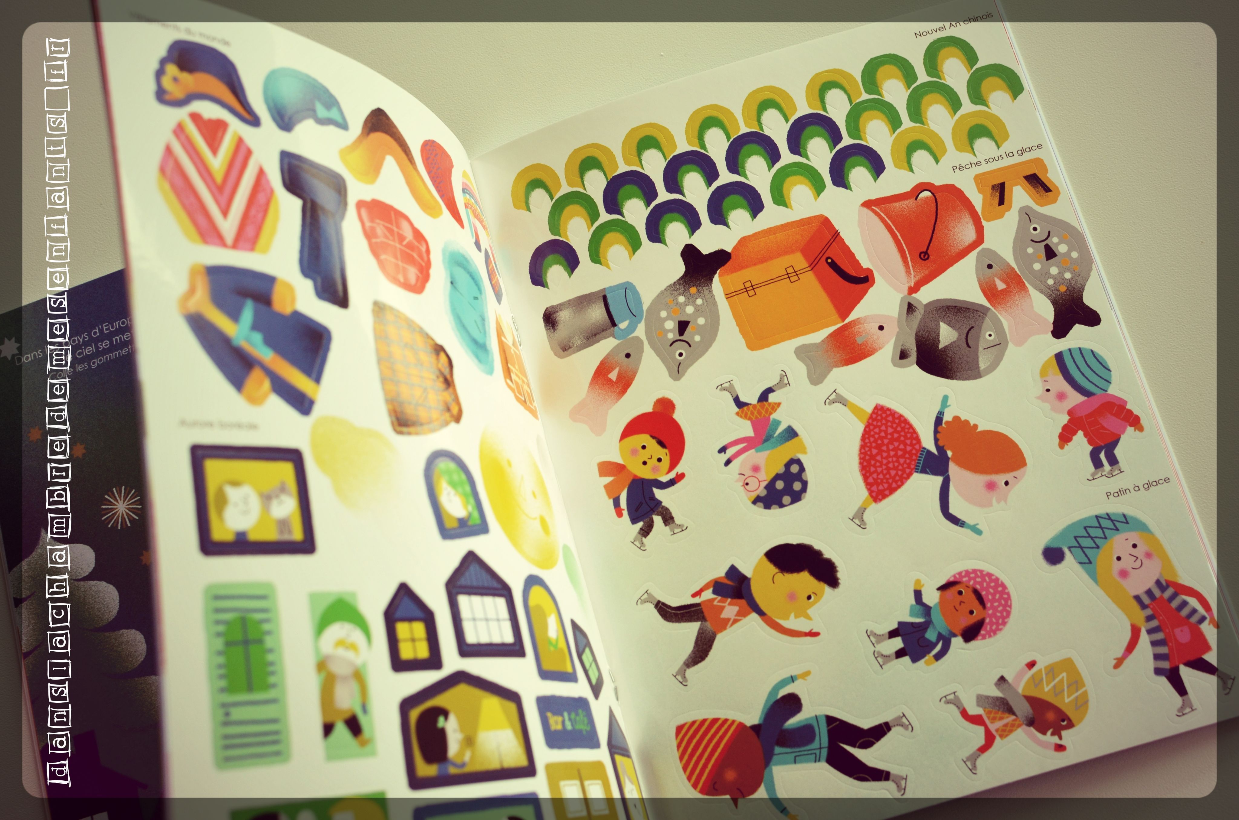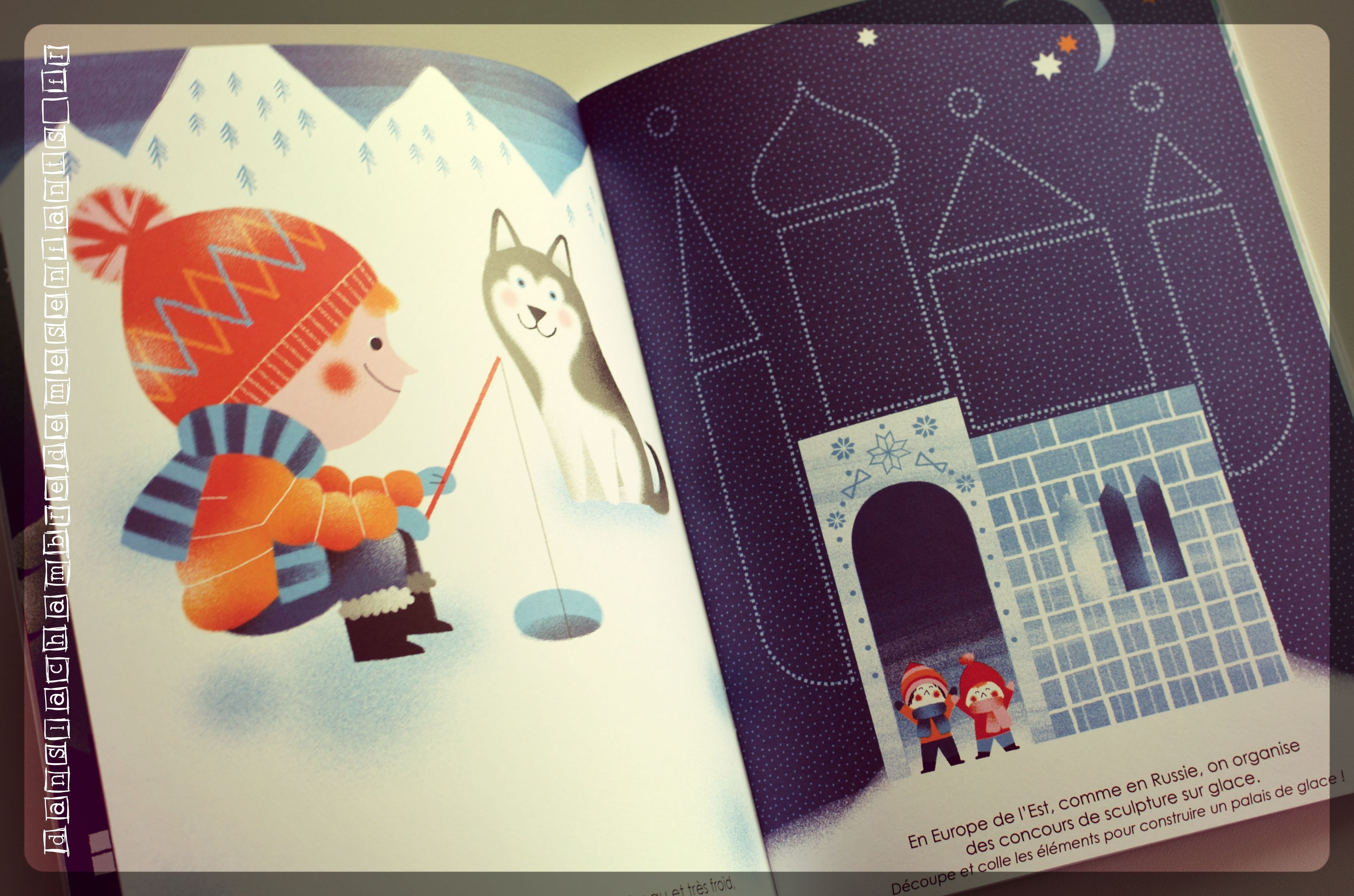 Cet ouvrage, aux pages cartonnées, présente des scènes diverses accompagnées d’un bref commentaire instructif (ex : « Dans les pays d’Europe du Nord, il se produit parfois des aurores boréales : le ciel se met à scintiller de mille couleurs, c’est féérique ! ») et d’une instruction pour une activité ludique (ex : « Colle les gommettes pour animer le village, car tout le monde est réveillé ! »). On y trouve notamment des animaux en hibernation dont le dessin est à terminer et à colorier, un jeune pêcheur sur la banquise ou encore une sculpture sur glace à terminer à l’aide de stickers, des plats de Noël traditionnels à détacher et coller. En effet, 2 pages de stickers colorés et 3 pages de formes sont comprises dans ce cahier.