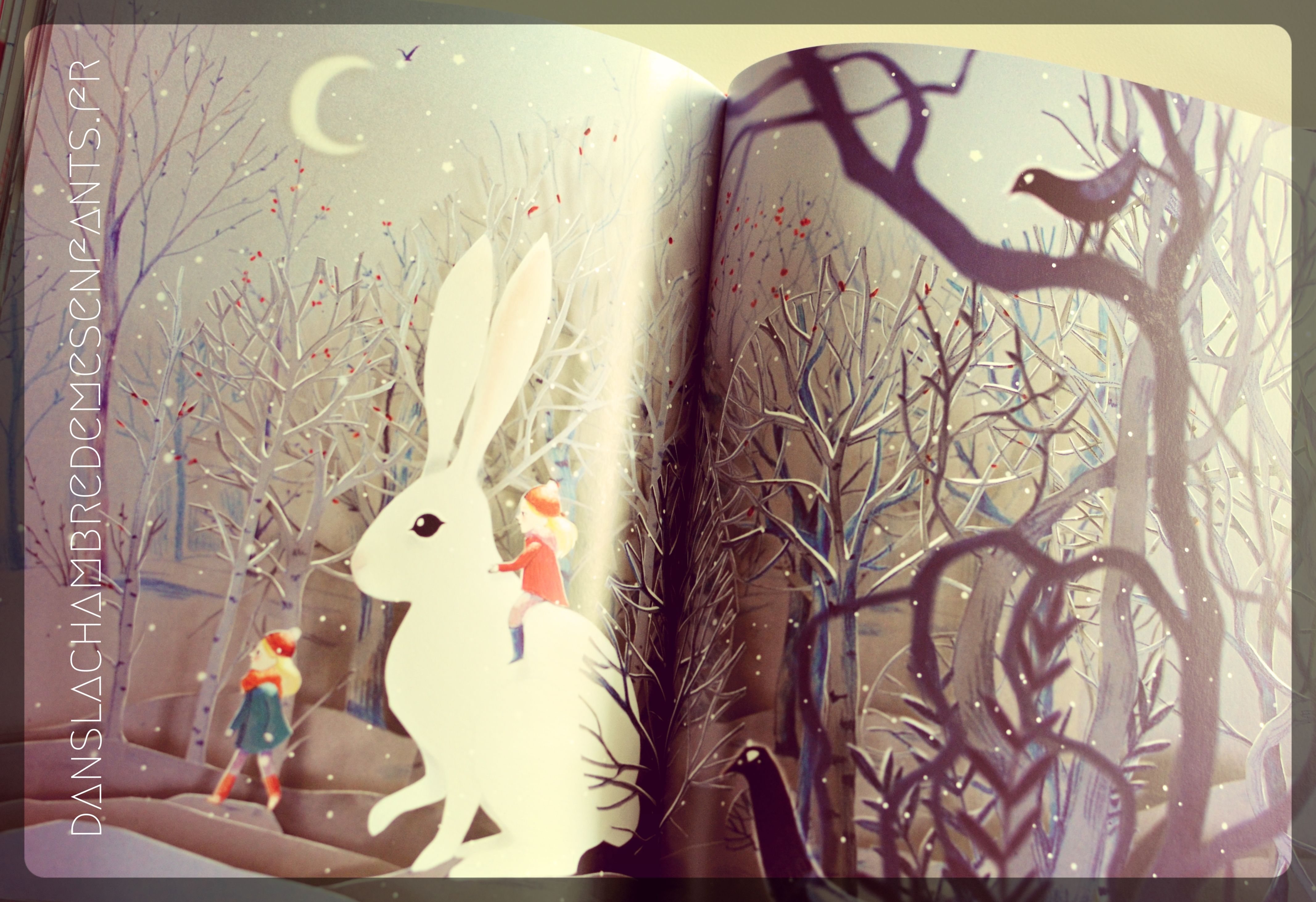 Cela est très personnel mais c’est bien sur cette corde sensible que repose cet ouvrage : l’expression des illustrations est l’unique narration du livre. Ainsi, ce sont les images qui vous transporte en hiver, un hiver enneigé, plus exactement devant la fenêtre d’un chalet. L’une des deux enfants sort pour fabriquer un lapin de neige et l’apporter à sa sœur paraplégique. Elles décident de lui rendre sa liberté et il prendra vie pour les secourir dans la forêt.