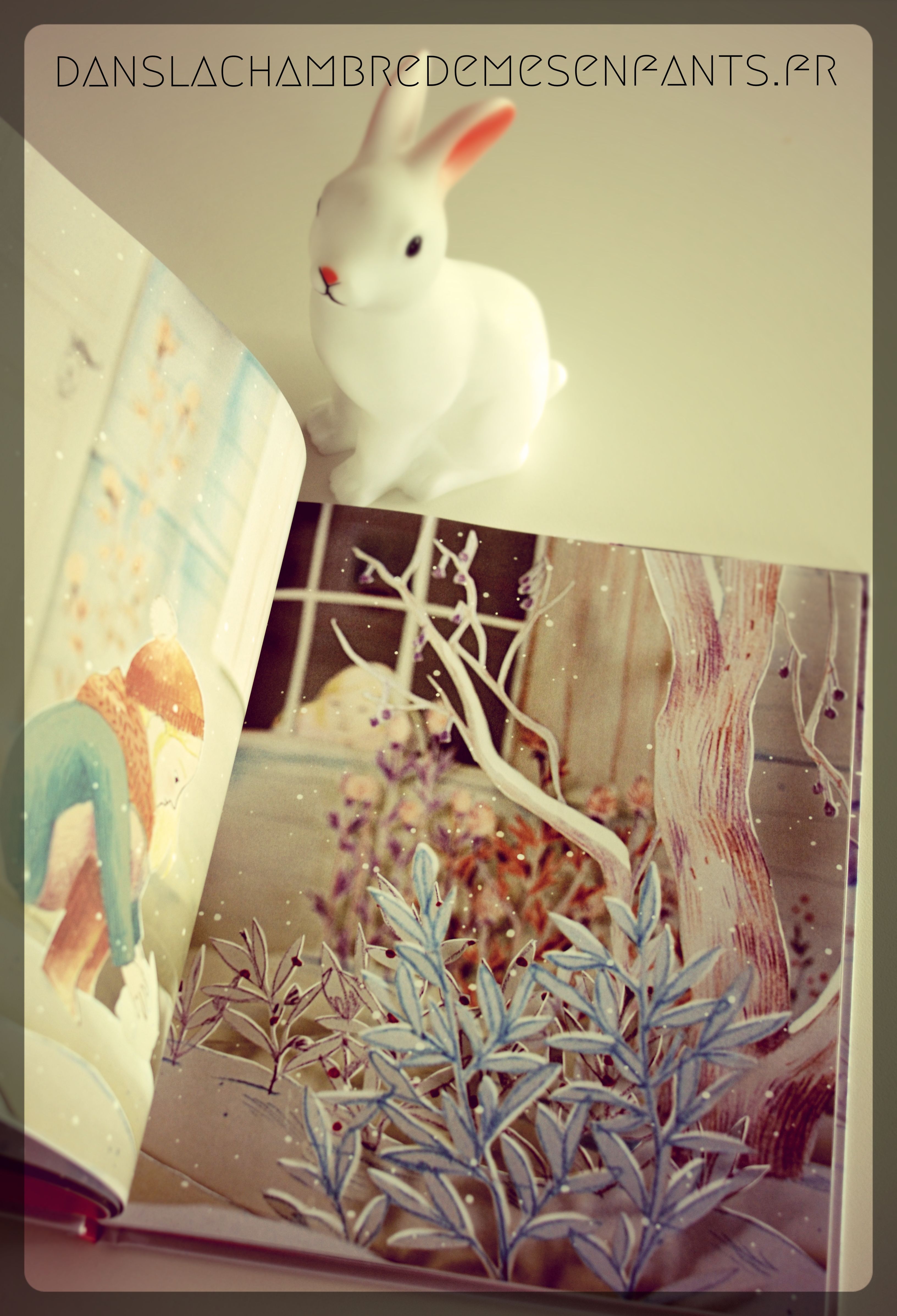 La 1ère chose qui m’a marquée c’est cette figure centrale, le lapin blanc (c’est que le titre a bien été trouvé dis donc ! lol) car il me rappelle une petite veilleuse à la mode que vous retrouvez souvent sur les clichés du site. Je l’affectionne tout particulièrement et c’est donc avec plaisir que j’ai découvert ce « lapin de neige » tout aussi gracieux en couverture.