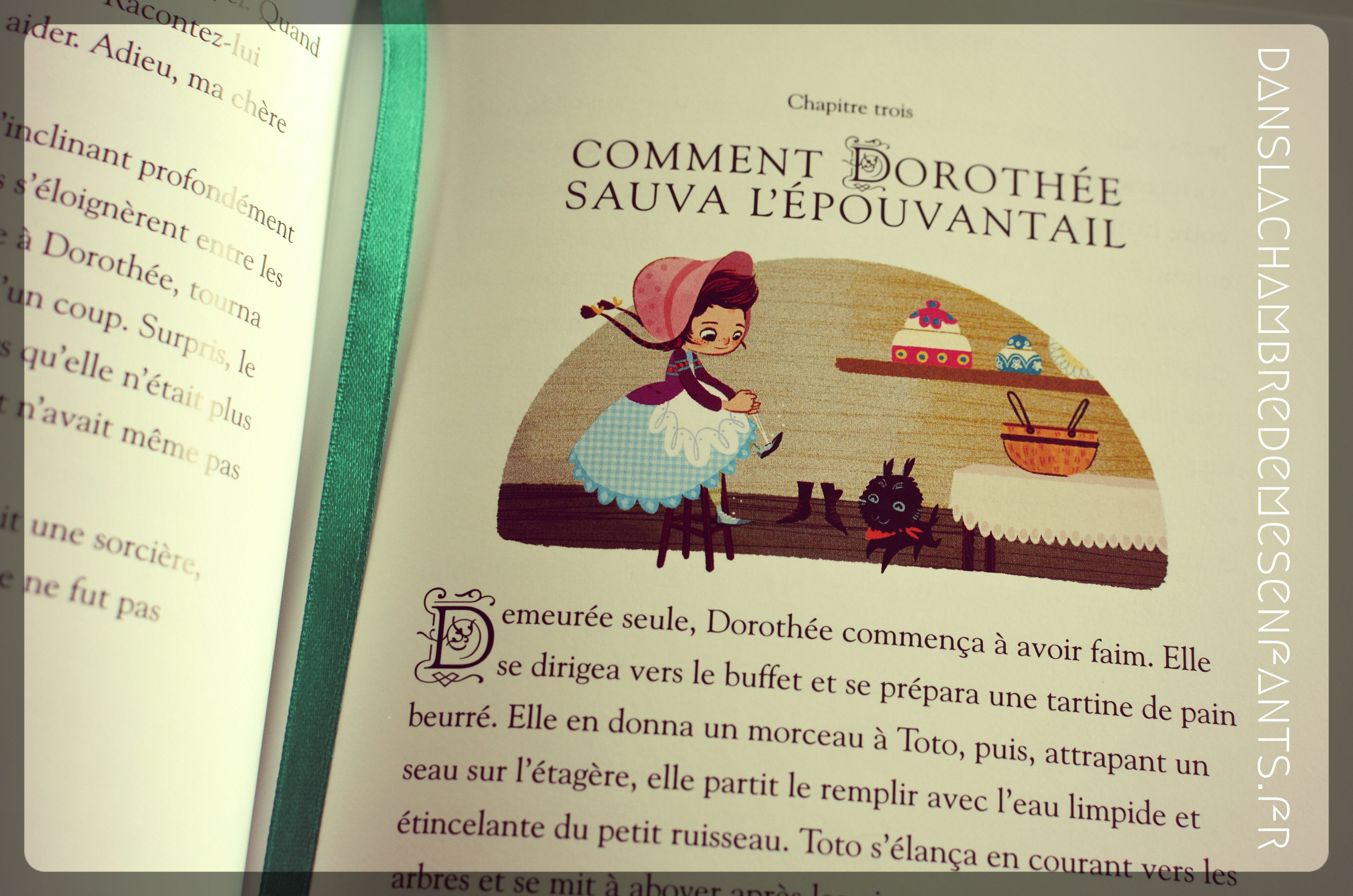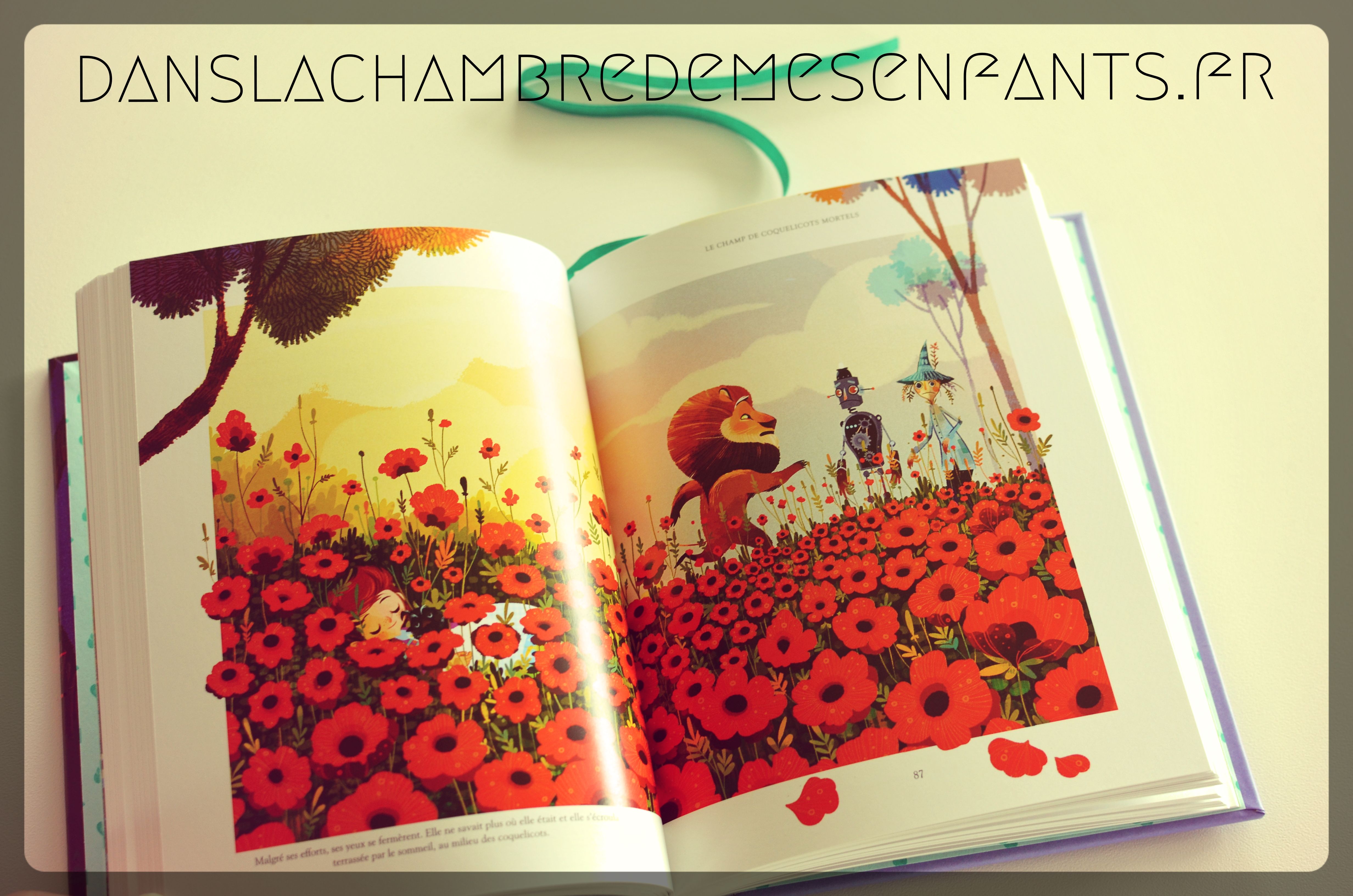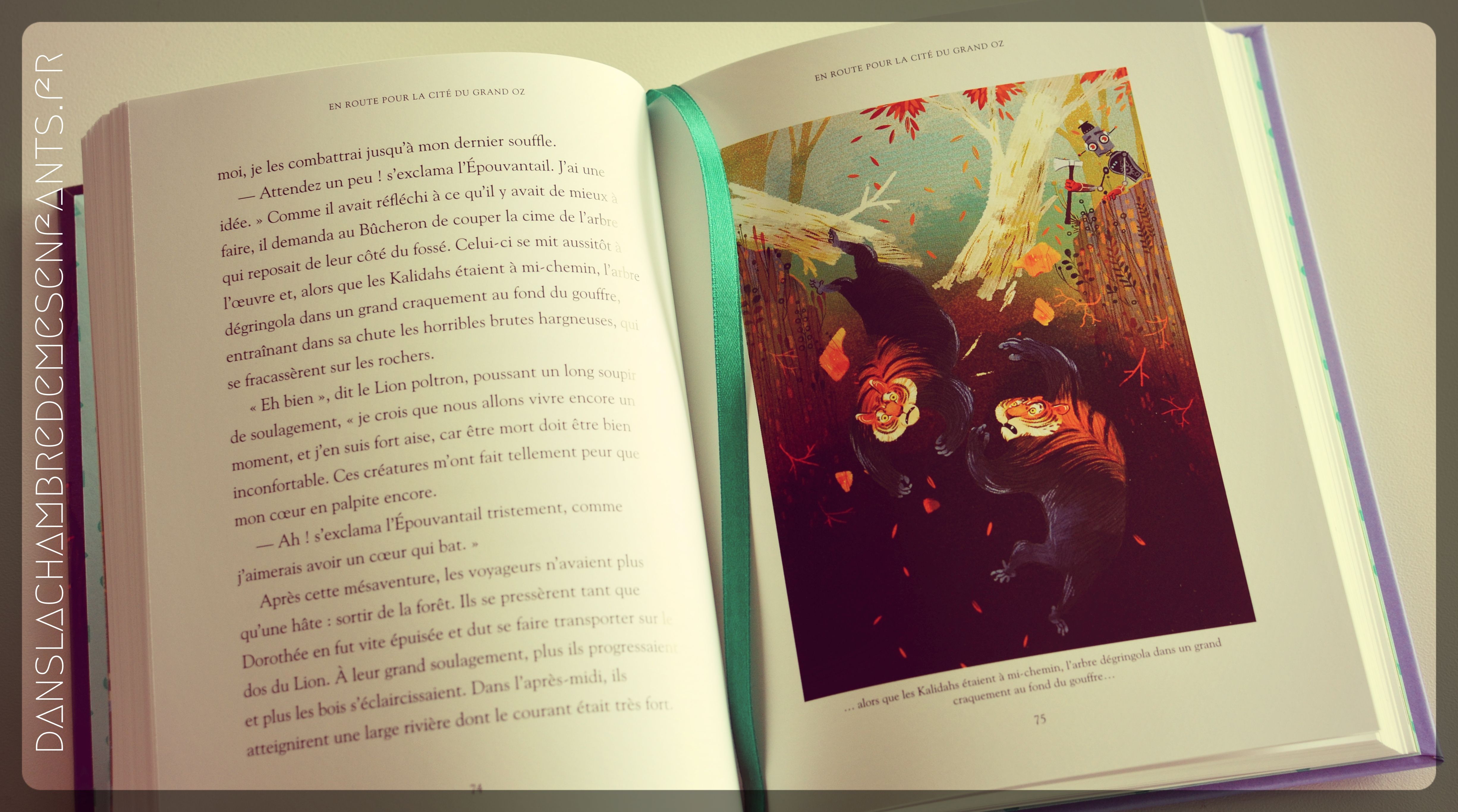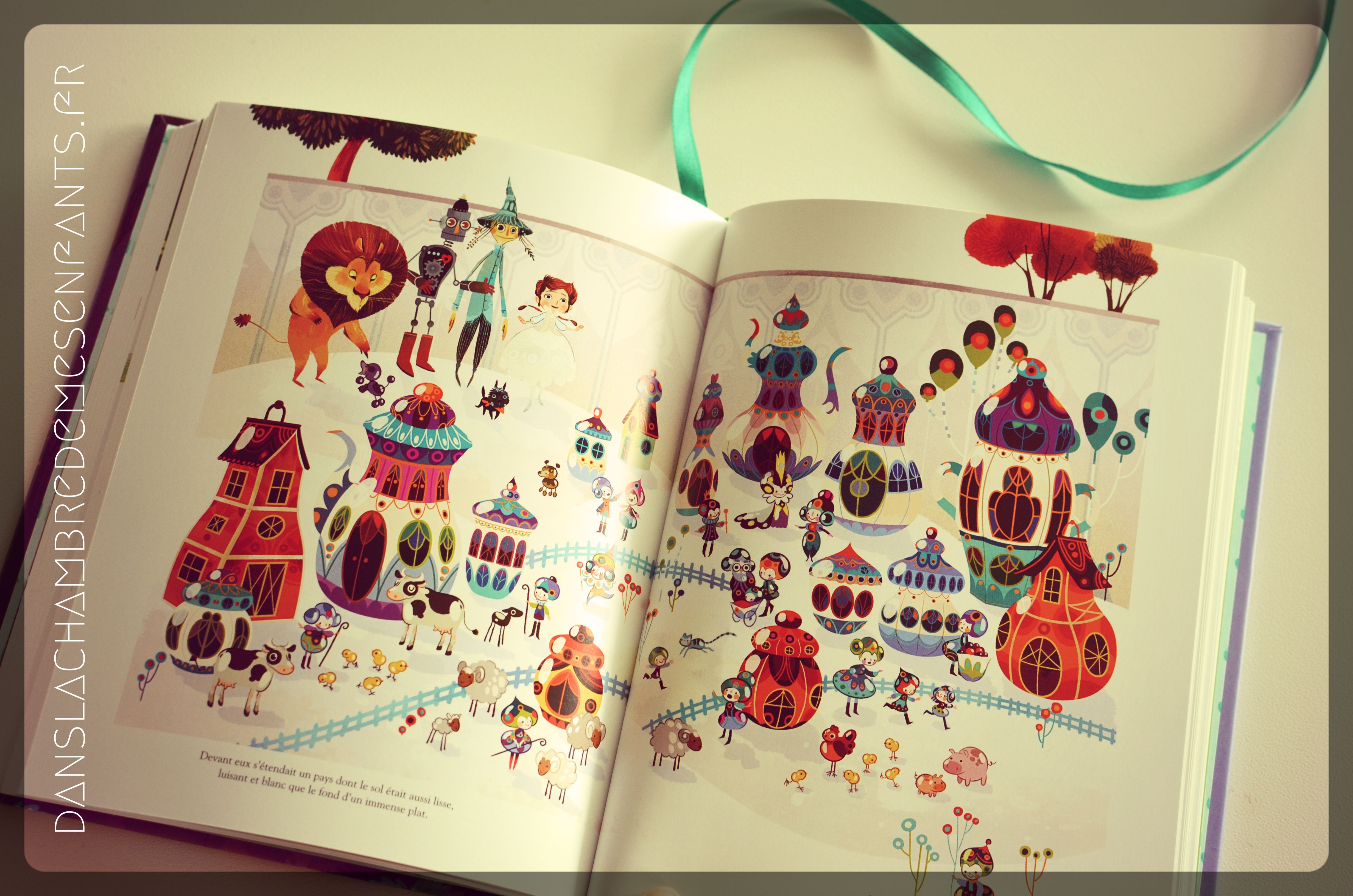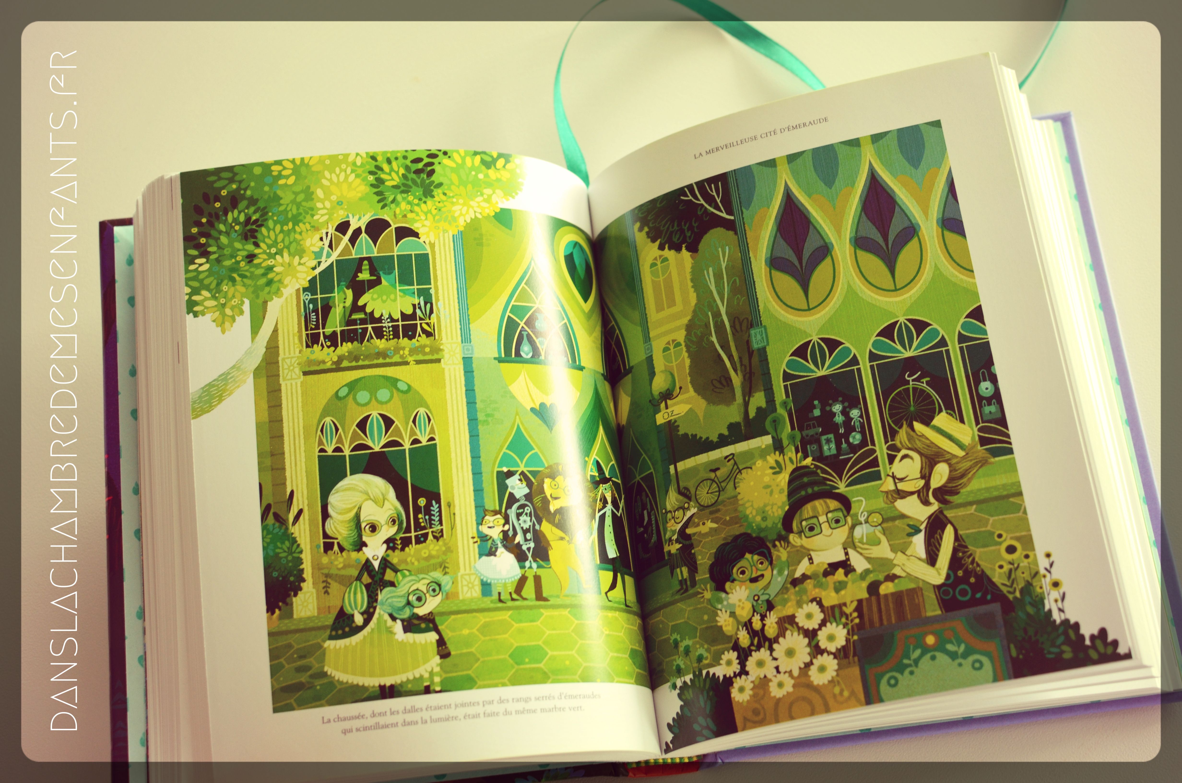La couverture de cet ouvrage résume assez bien ce qui se trouve derrière : un style soigné avec une doublure en mousse et un marque-page ruban, une magnifique illustration annonçant le long chemin vers la cité d’émeraude, le tout sous lecture du texte intégral du Magicien d’Oz.