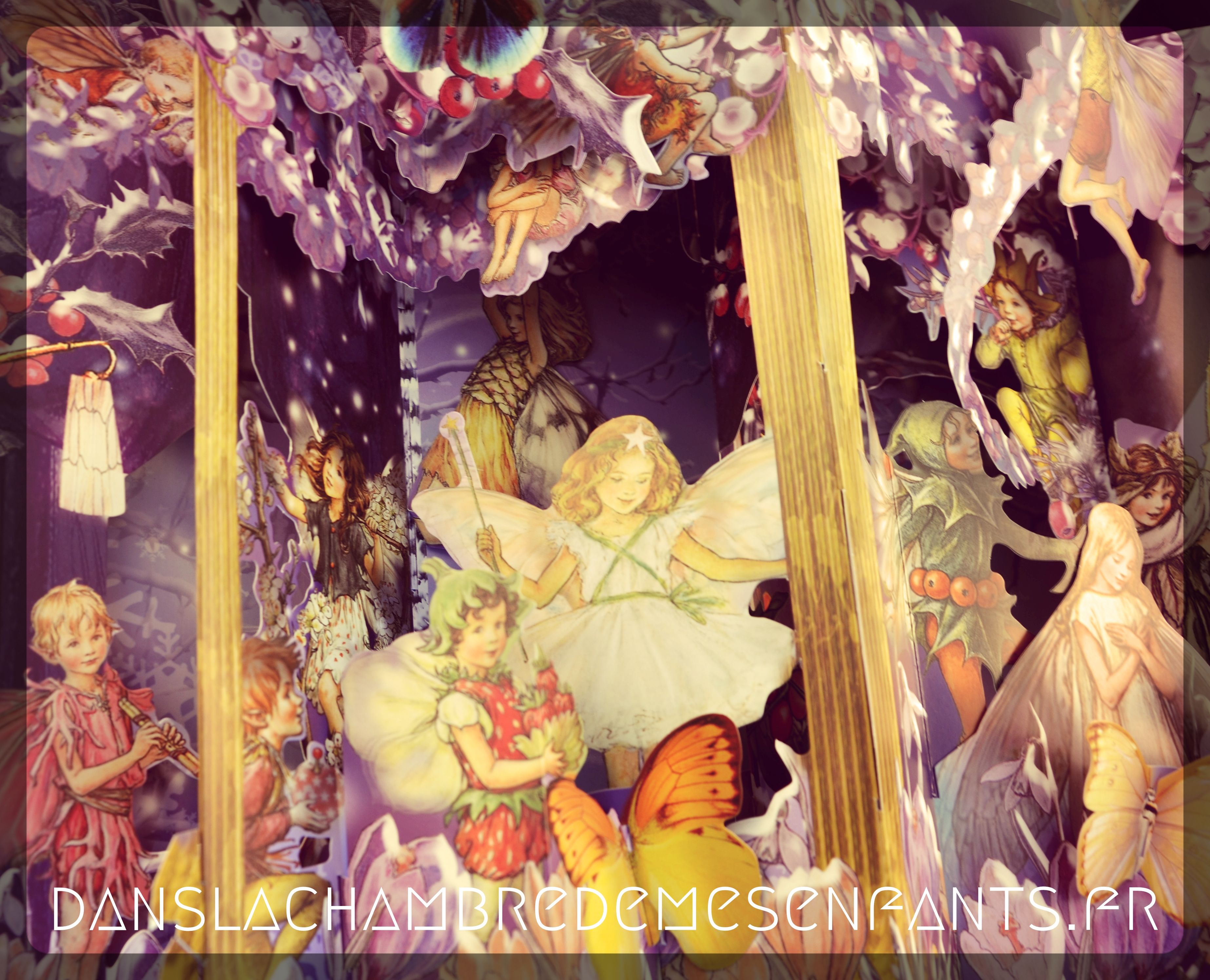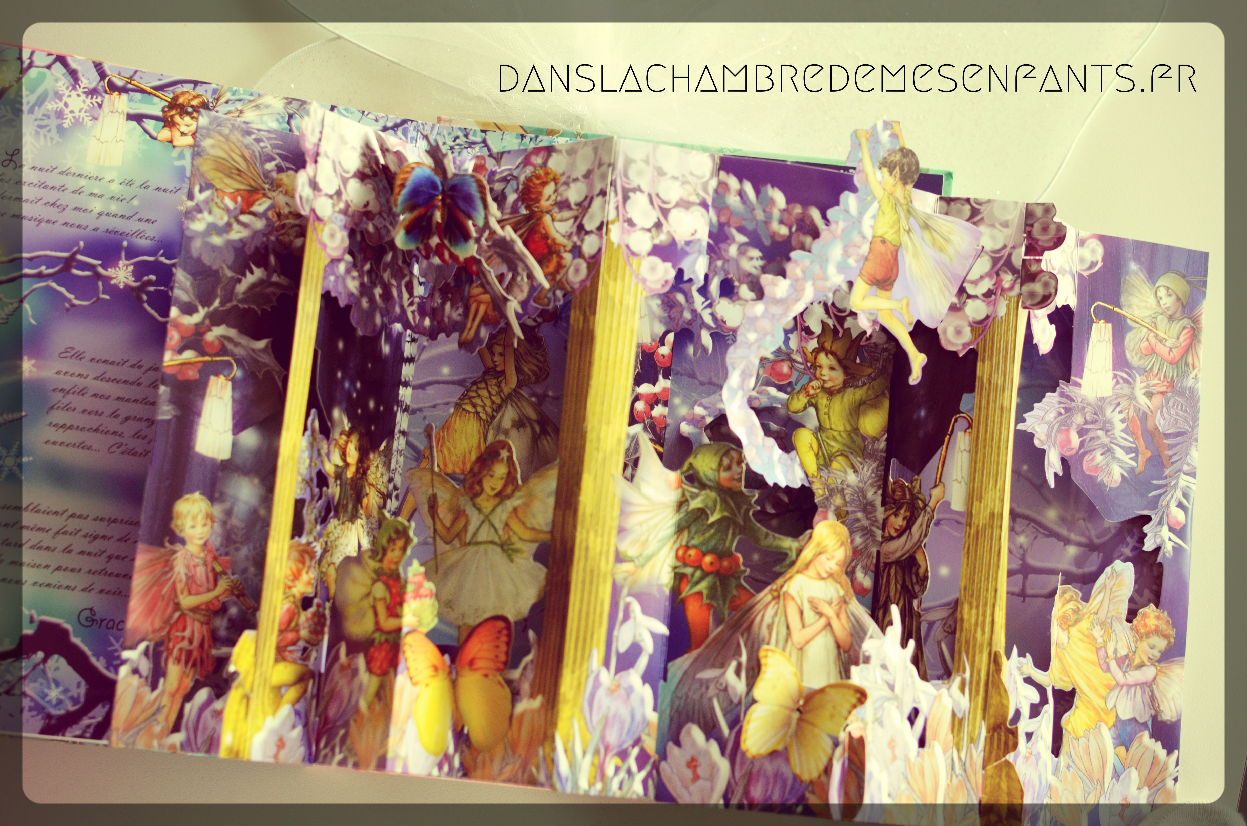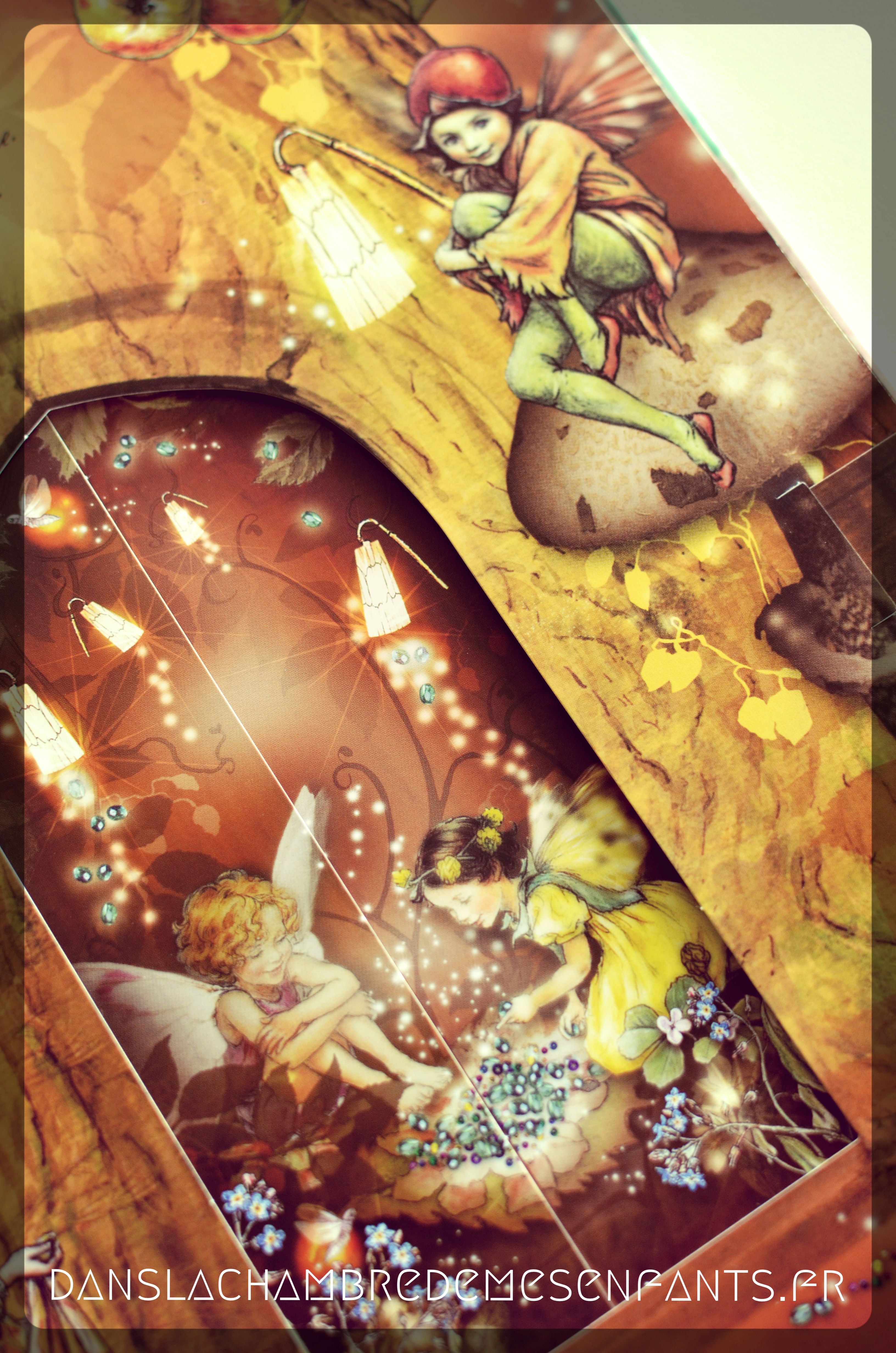 L’interaction avec le lecteur est provoquée à chaque double page car les scènes présentent les portes découvertes, animées par un ou plusieurs volets, accompagnées d’un personnage en mouvement, un dépliant, une image en 3D… jusqu’à la grande scène finale : le bal des fées en pop-up. Certes, ce beau livre est fragile mais le travail de mise en scène en vaut la peine. Les illustrations occupent le premier plan, dans des couleurs tendres rehaussées par de petites étincelles, attirant le regard vers le détail des scènes où se cachent de nombreuses fées.
