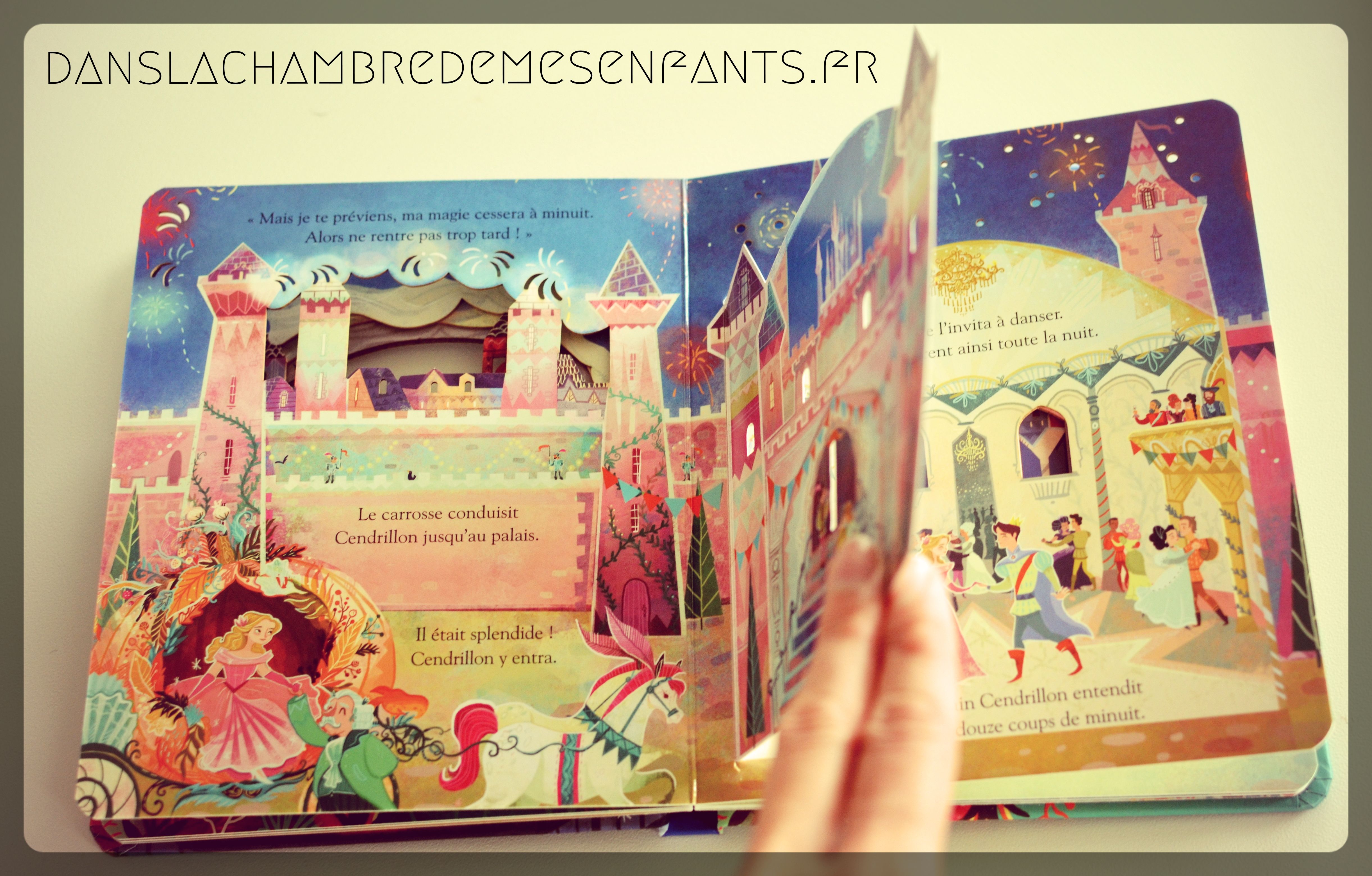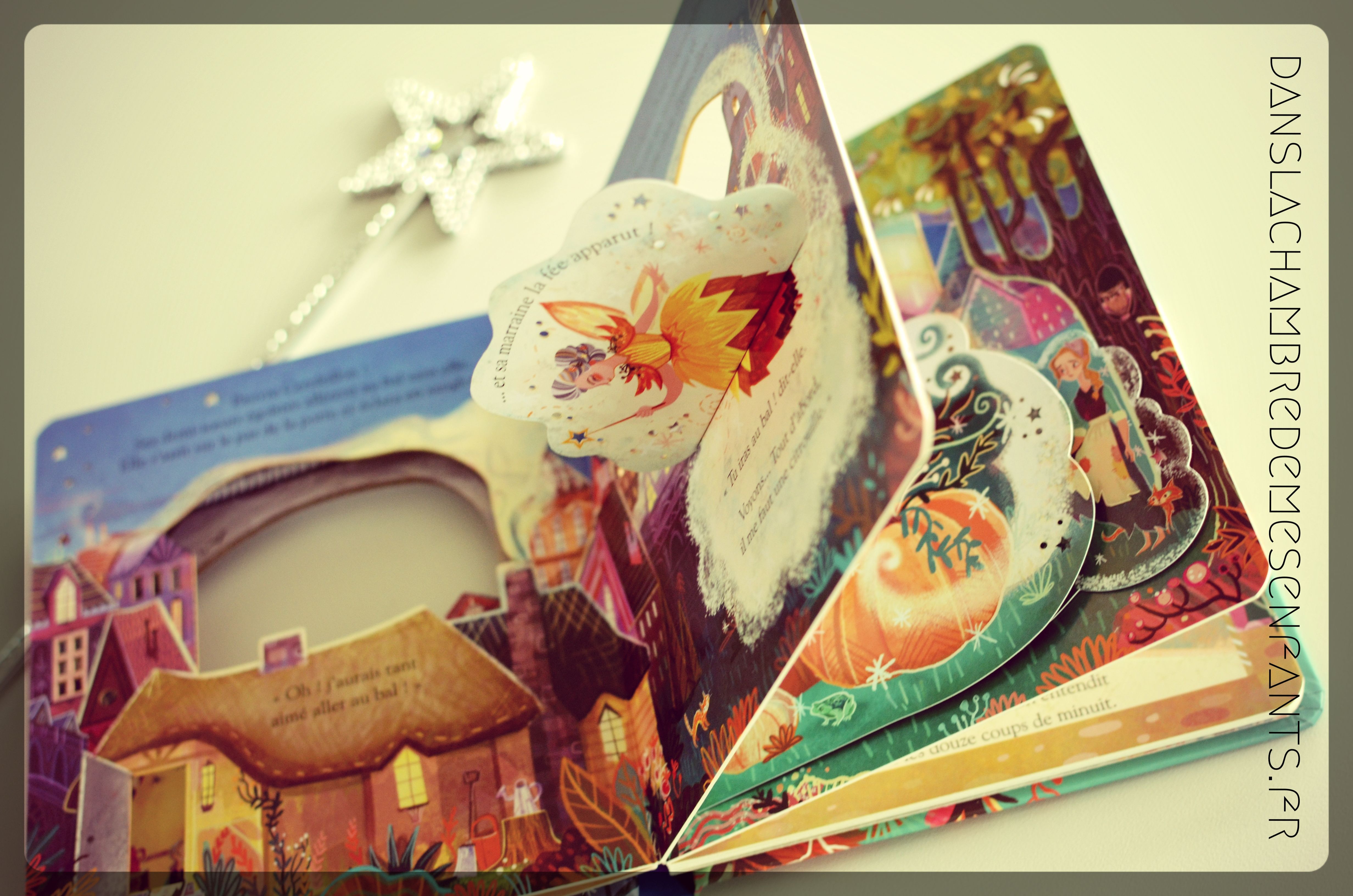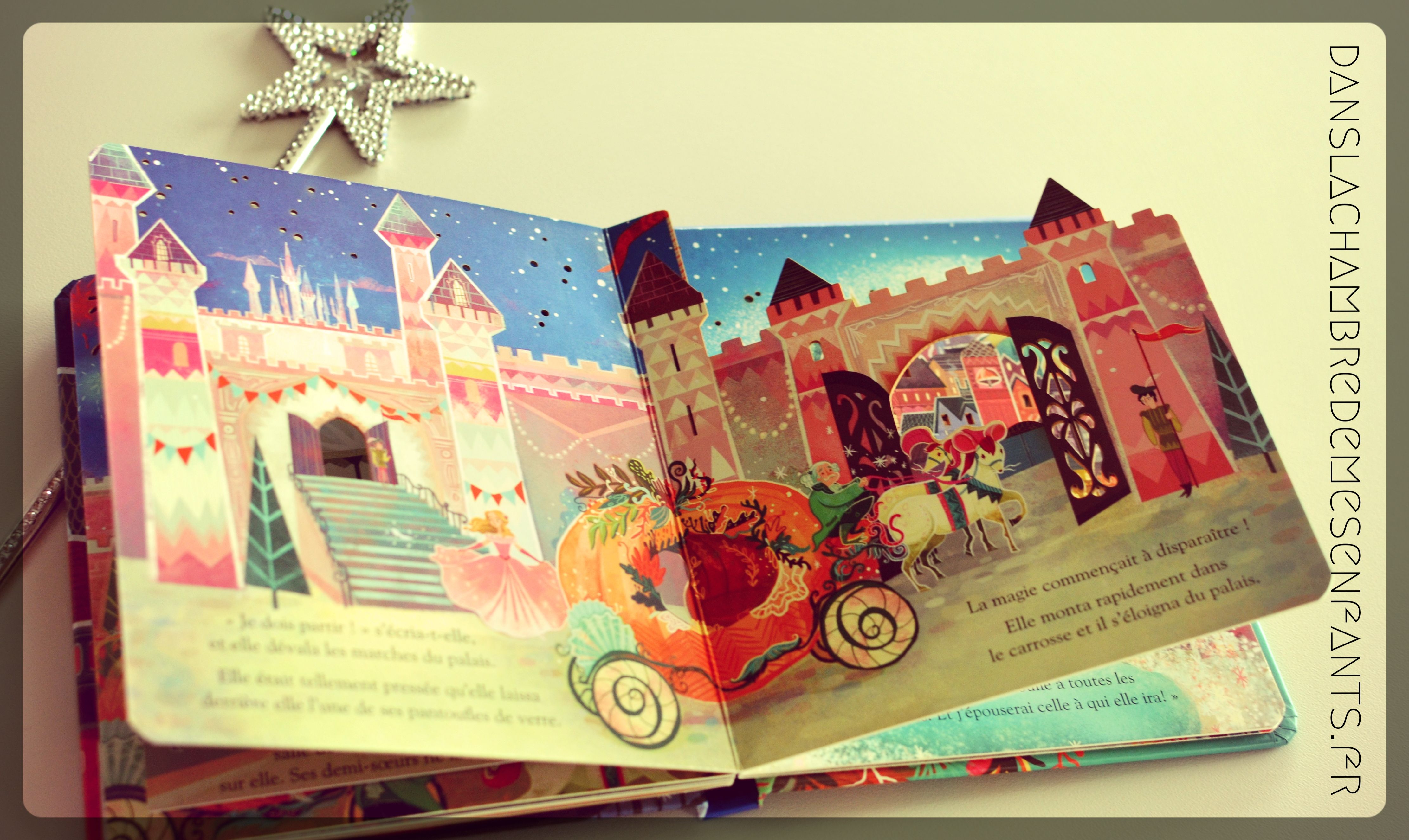 Si l’histoire n’a nul besoin d’être présentée, cet ouvrage mérite tout de même de l’intérêt pour sa forme réussie qui ne manque pas de charme. En effet, il s’agit d’un petit ouvrage aux pages cartonnées qui fait succéder les scènes par un découpage (au laser) donnant de la profondeur au cadre. Ainsi, dès les premières pages, on distingue, au loin, le château qui sera dévoilé plus tard dans la lecture et les détails, tels que le travail de ferronnerie du grand portail, le feu d’artifice ou les étoiles, sont mis en valeur. Une animation s’ajoute à cette mise en forme grâce à des volets, parfois superposés, pour suivre l’avancement de l’histoire sur un même tableau (ex : l’intérieur de la maison de Cendrillon, l’apparition de la fée, la transformation de Cendrillon…).