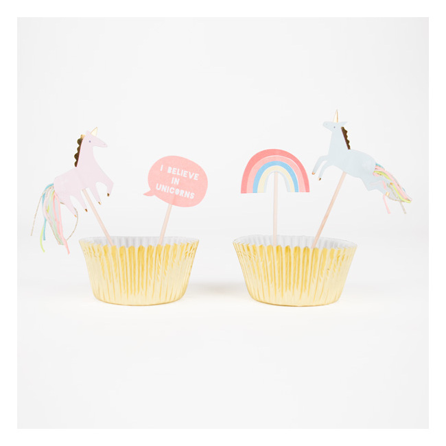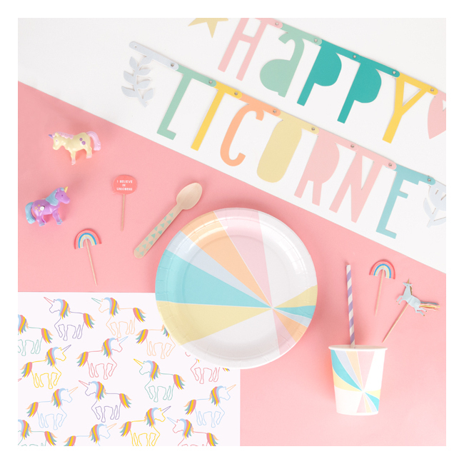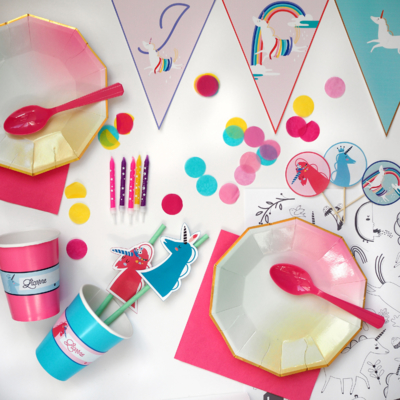 Pour que les enfants s’amusent autour de la thématique, notamment avec des cadeaux invités : le lot de 8 marionnettes de doigt de Trendseller à 4,85 €, le lot de 6 bagues scintillantes de Trendseller à 1,85 €, le kit de 4 baguettes licorne en mosaïque de Baker Ross à 6,75 €, le lot de 8 crayons licorne de Baker Ross à 3,35 €, les chapeaux cônes de Meri Meri à 13,60 €, le kit de 6 coussins licorne à peindre d’Avenue Mandarine à 19,01 €, le kit de 10 aimants licornes à décorer à 4,49 €, des stickers licorne pour nail art de NPW à 5,28 €, le lot de 8 planeurs licornes de Baker Ross à 3,99 €, le serre-tête et la queue licorne chez H&M (le modèle vient de changer mais il n’est pas impossible qu’il revienne en boutique), le lot de 6 mini ressorts arc-en-ciel phosphorescents de Yellow Moon à 2,99 €, le kit de 4 ballons à décorer de Meri Meri à 14,99 € et le lot de 8 sac à bonbons de Meri Meri à 12,99 €.