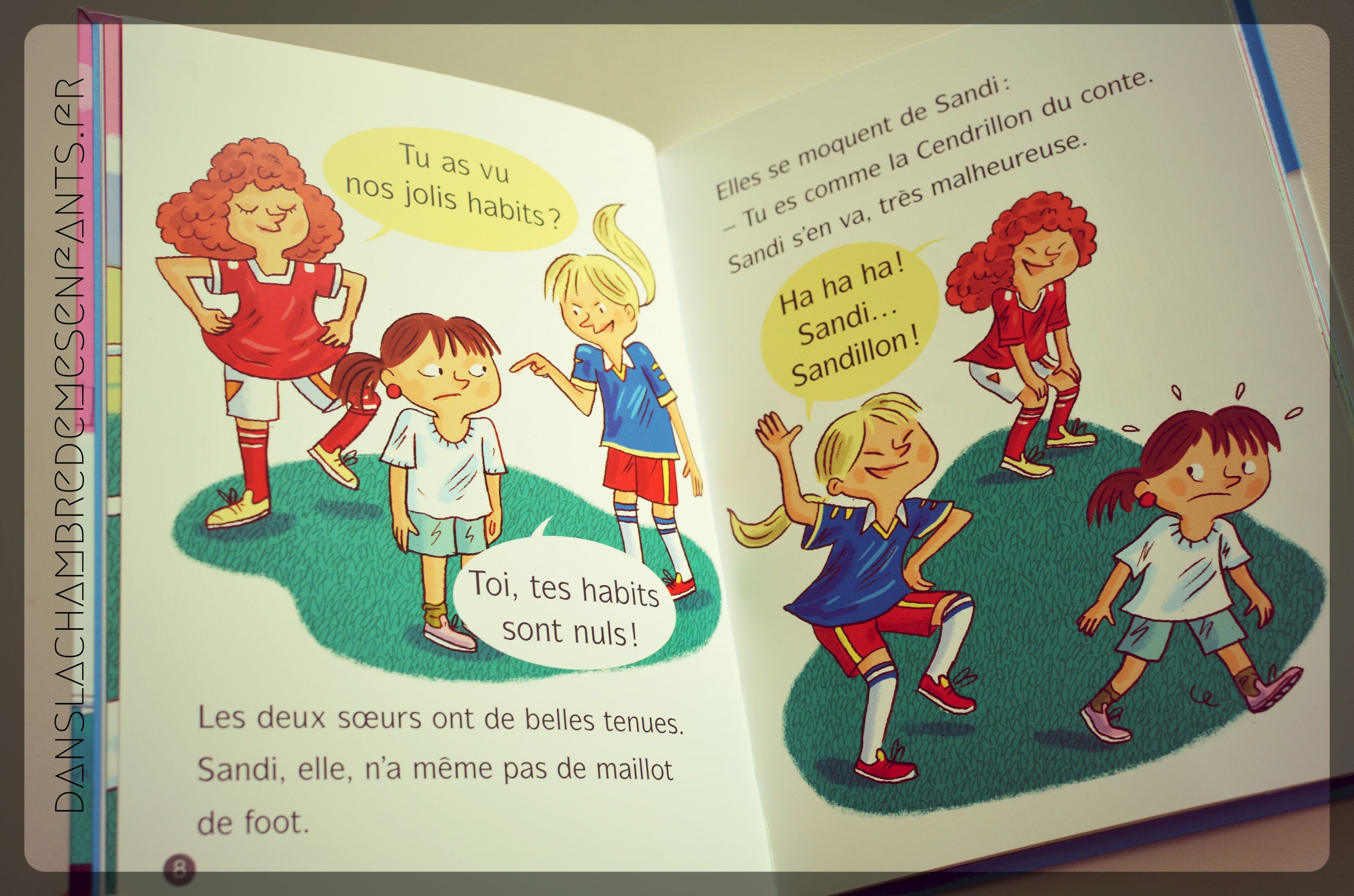 Sandi est une talentueuse petite fille qui brille sur les terrains de foot. Malheureusement pour elle, (dans cette version aussi) il y a deux sœurs assez jalouses pour tenter de l’empêcher de participer au grand concours de l’académie de foot du département. Bien sûr, sa marraine l’aide comme une bonne fée mais (les pantoufles de vair ne sont pas autorisées sur le terrain) elle perdra quelque chose de précieux dans sa fuite précipitée…