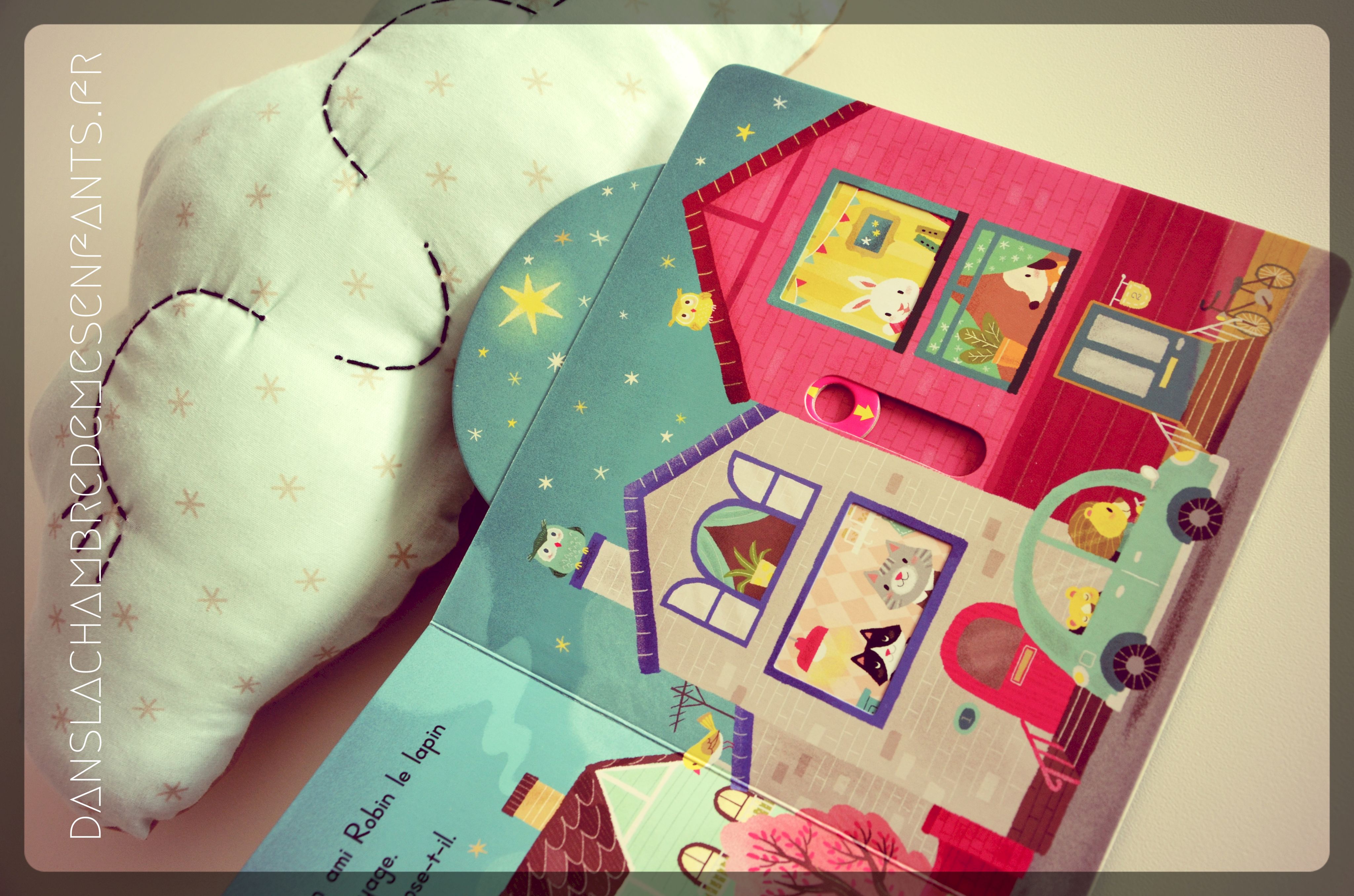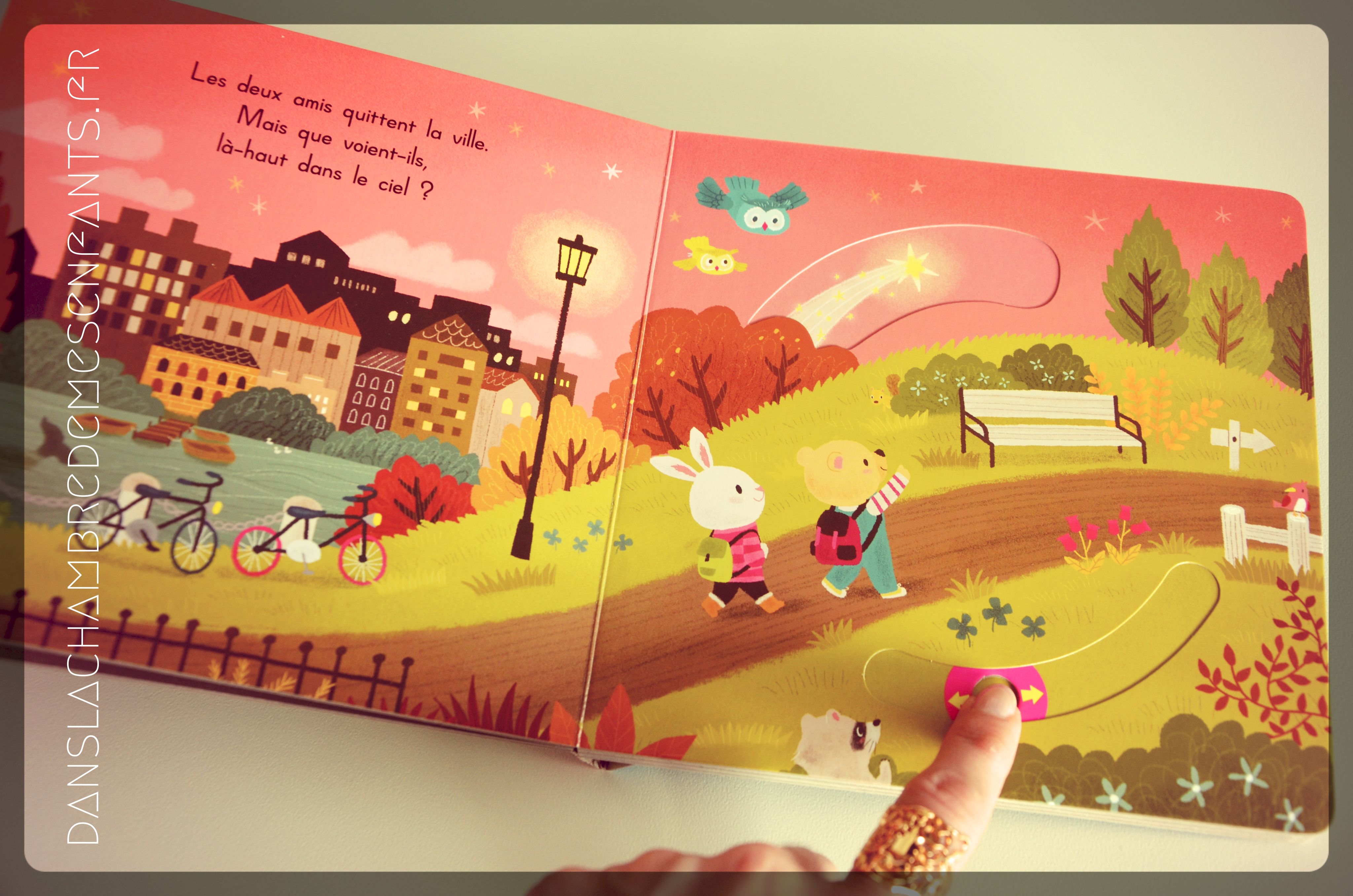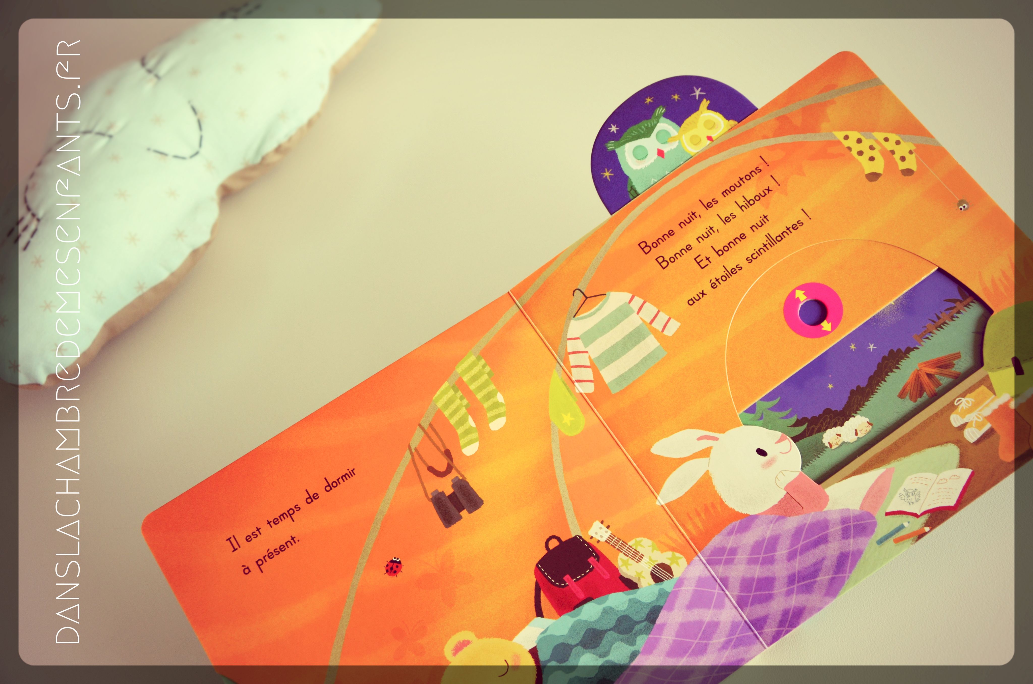 Cela faisait longtemps que nous n’avions pas regardé un livre le soir qui annonce l’heure du coucher ! C’est bien agréable 🙂 Timon l’ourson amène son ami Robin le lapin camper et c’est l’occasion de découvrir les merveilles de la nuit : l’heure du hibou, une étoile filante, les animaux (écureuil, chauve-souris…) qui filent se cacher près de leur feu de camp, et la fermeture de la tente au moment du coucher. Simplement et gentiment, on découvre une aventure toujours aussi intéressante qui fait participer l’enfant. Et, personnellement, j’ai beaucoup aimé le choix des couleurs qui mettent en valeur les illustrations.