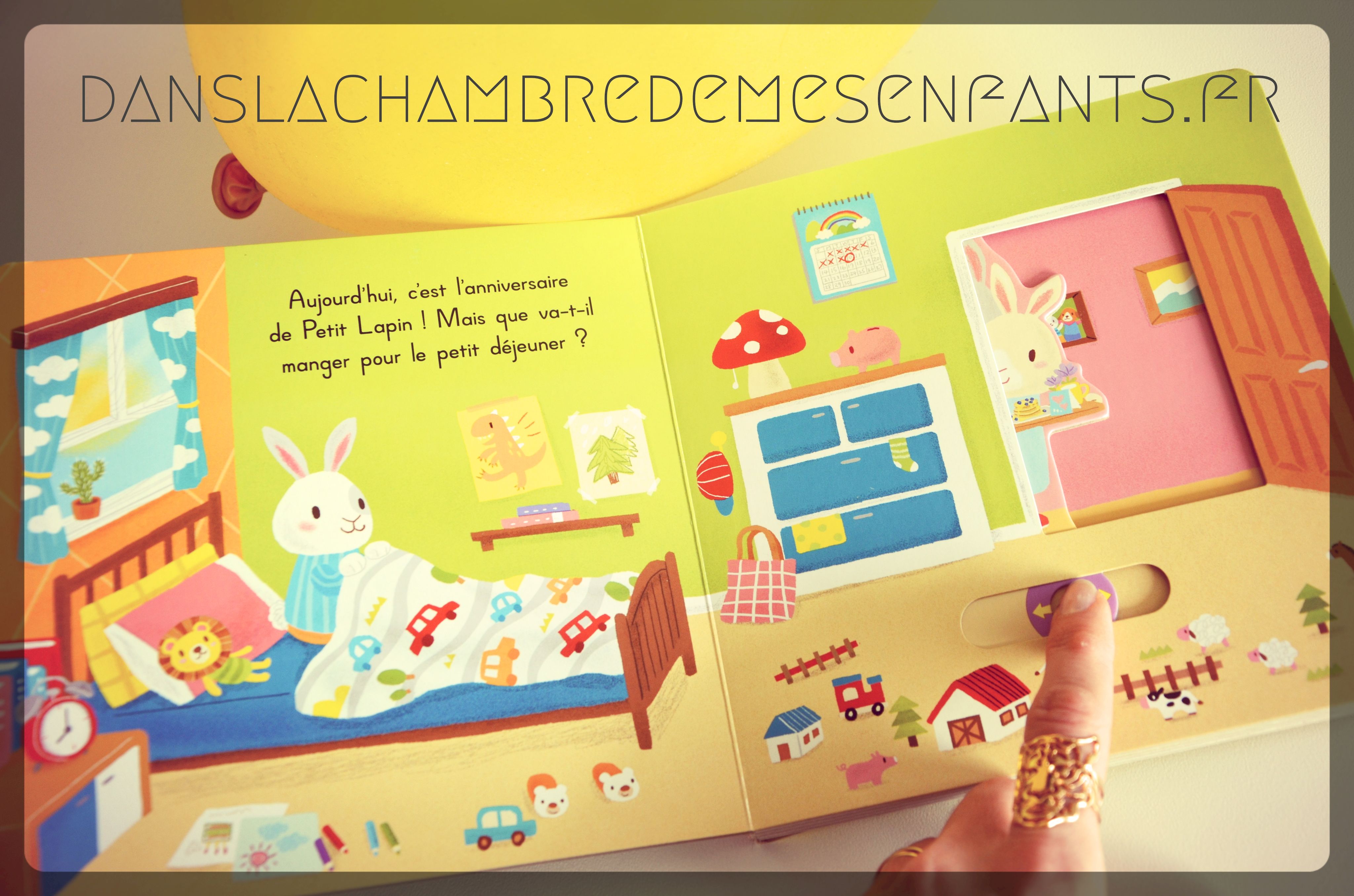 Les illustrations sont toujours aussi belles, rondes et agréables. L’éveil des sens commence d’ailleurs ici, avec de très nombreuses couleurs pour leur donner vie. Un court texte présente chaque scène (par double page), avec le plus souvent une interrogation, renvoyant à l’animation (ex : Aujourd’hui, c’est l’anniversaire de Petit Lapin ! Mais que va-t-il manger pour le petit déjeuner ? » avant de découvrir ses parents et un plateau de crêpes). De quoi ravir les enfants à partir de 2 ans, et même un peu moins !