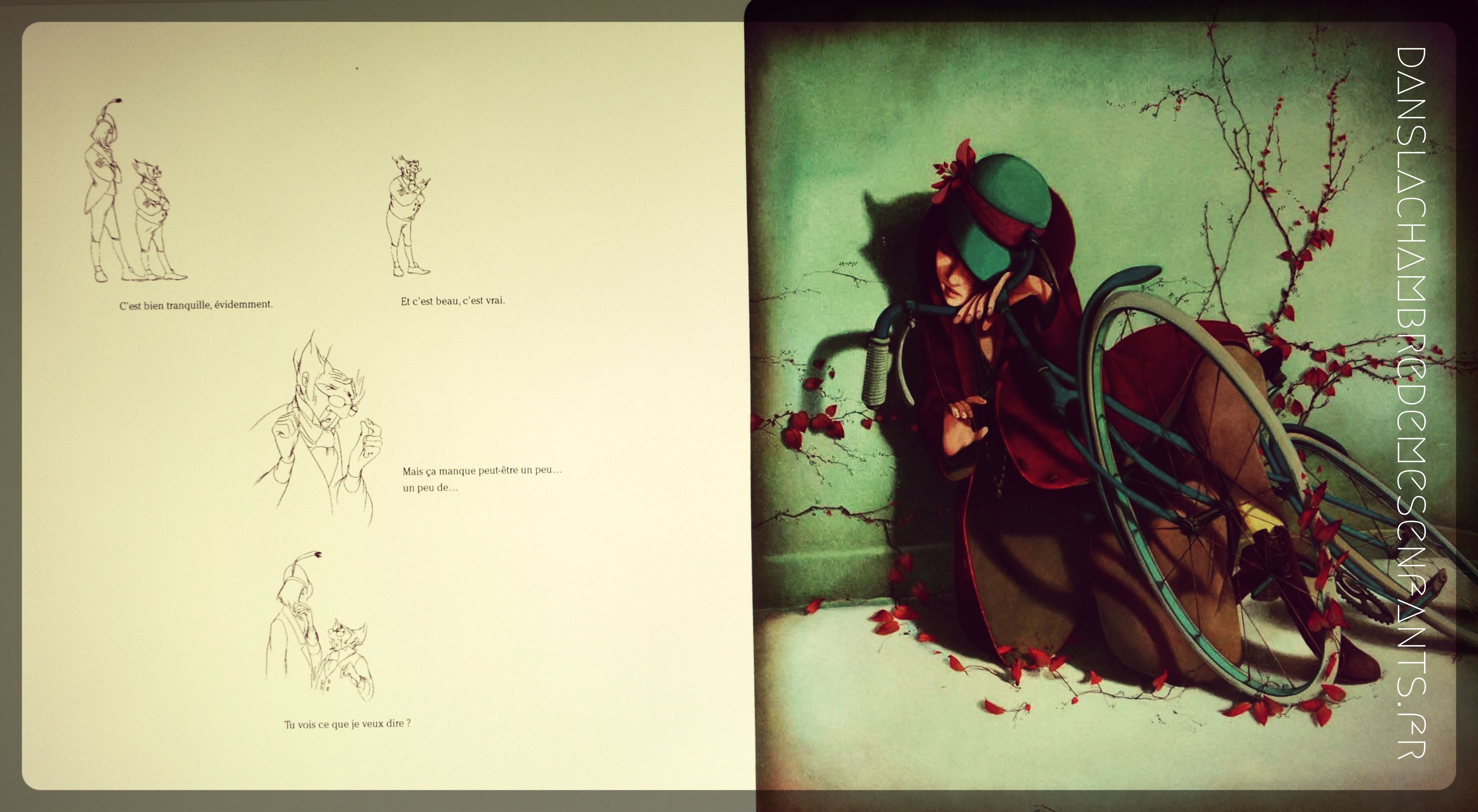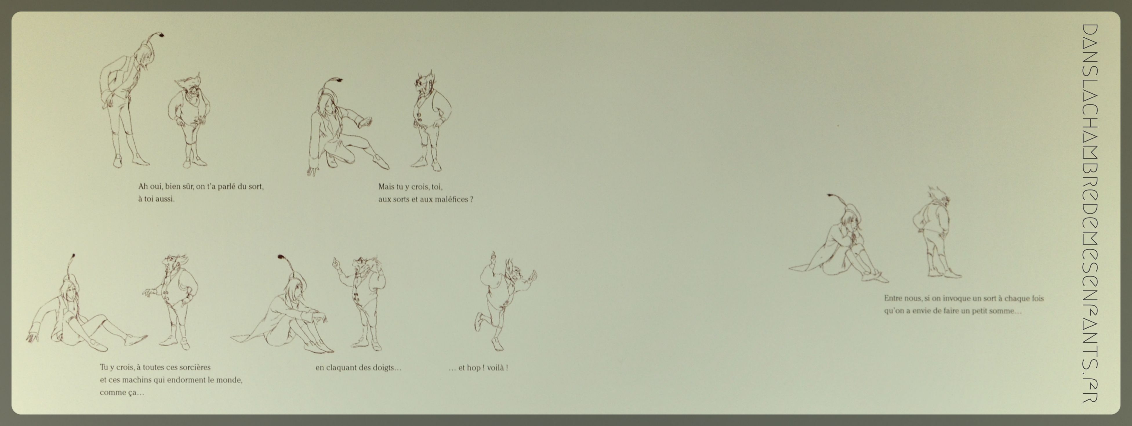 C’est un ouvrage qui ne ressemble pas à un autre : l’histoire de la Belle au bois dormant est connue mais elle se lit à travers les traits des personnages et leur environnement et les observateurs sont sur un autre plan, bien marqué, qui apporte un autre point de vue plein d’interrogations. Ils semblent même avancer comme dans le déroulement d’une pellicule. Les contrastes visuels marquent vraiment une rythmique dans la lecture.