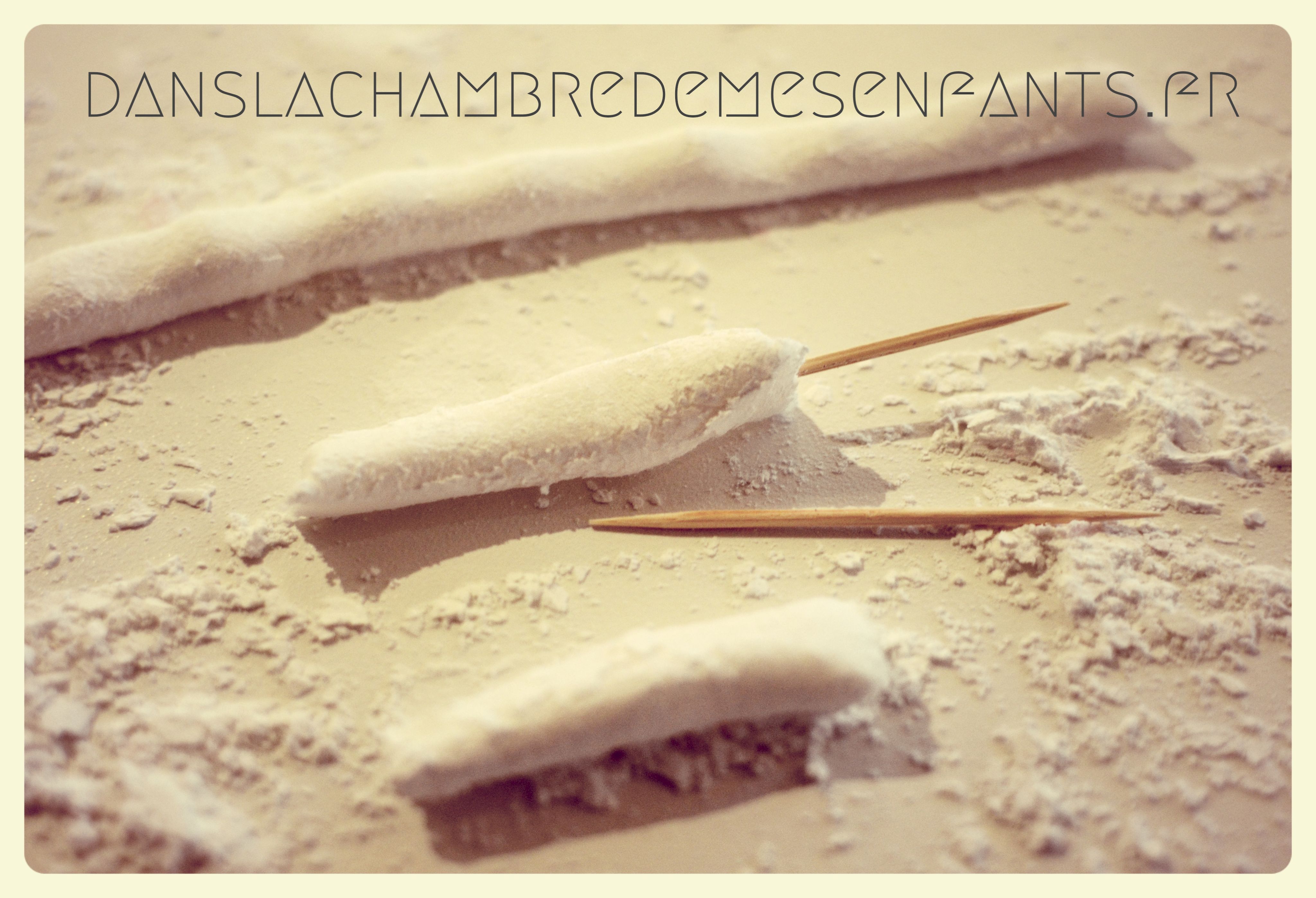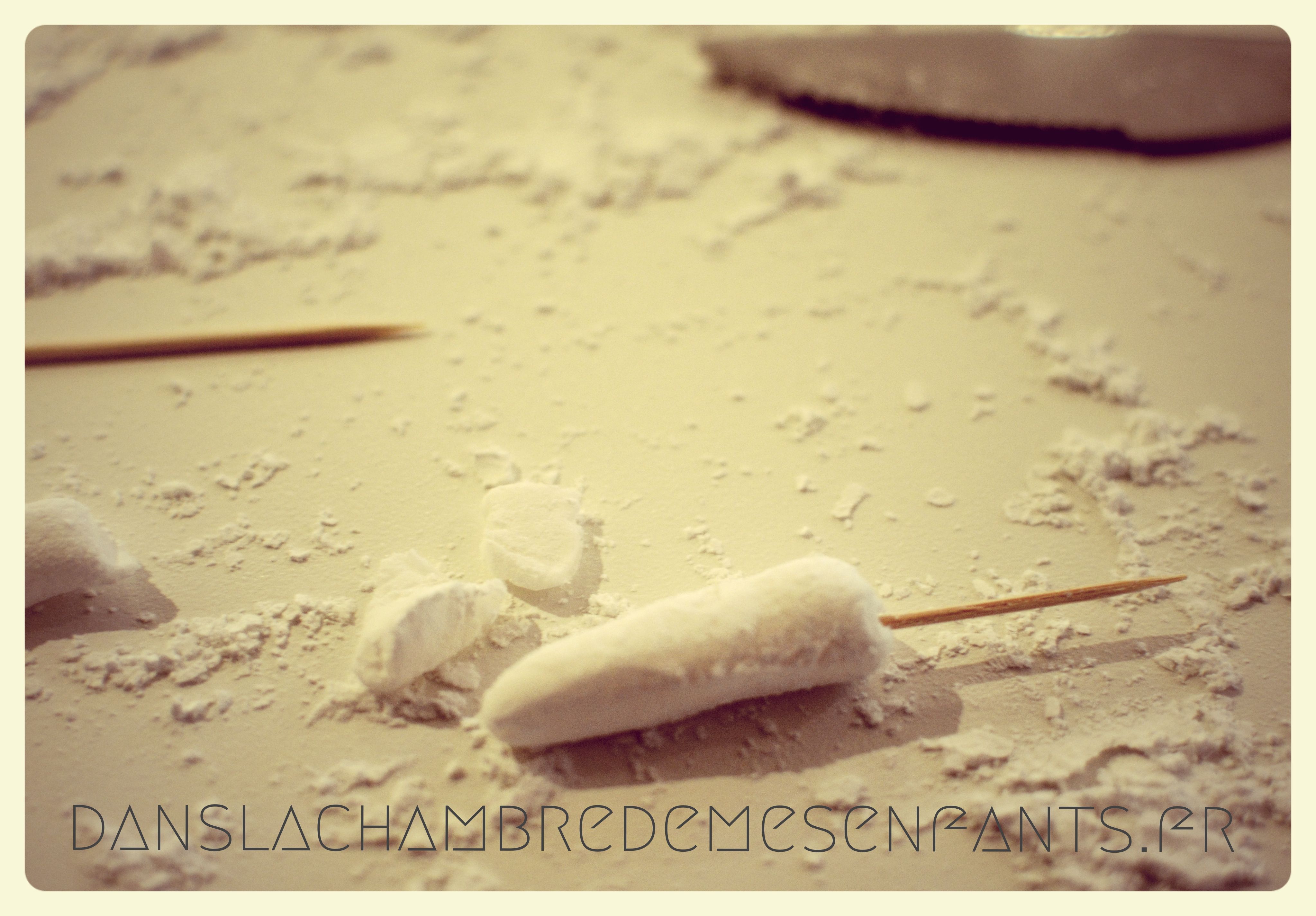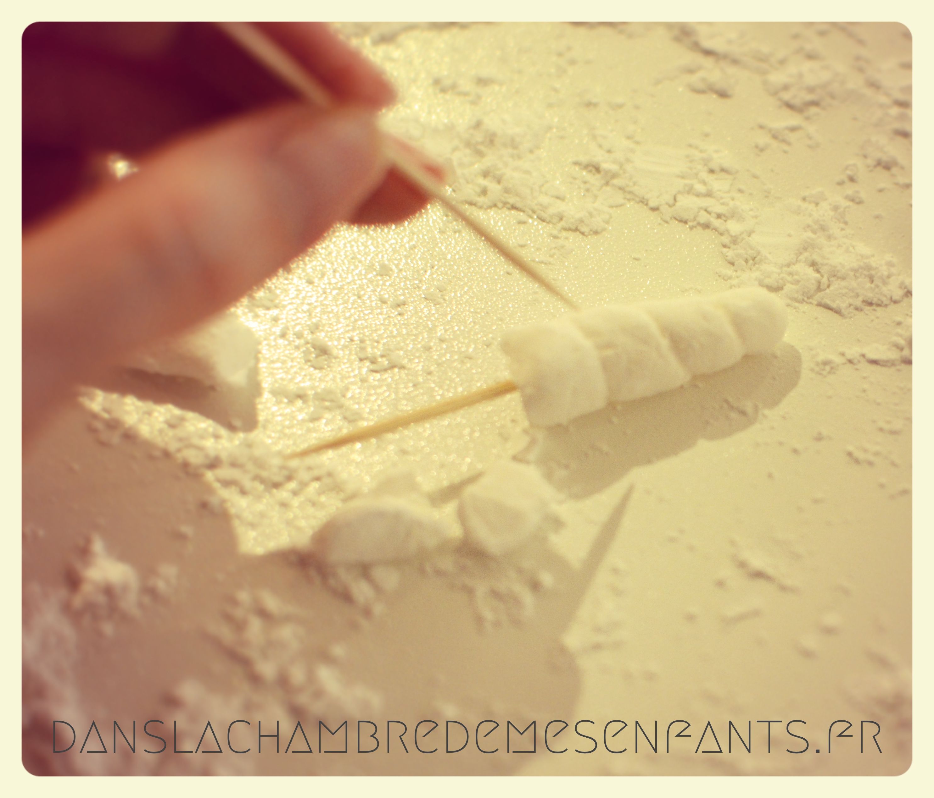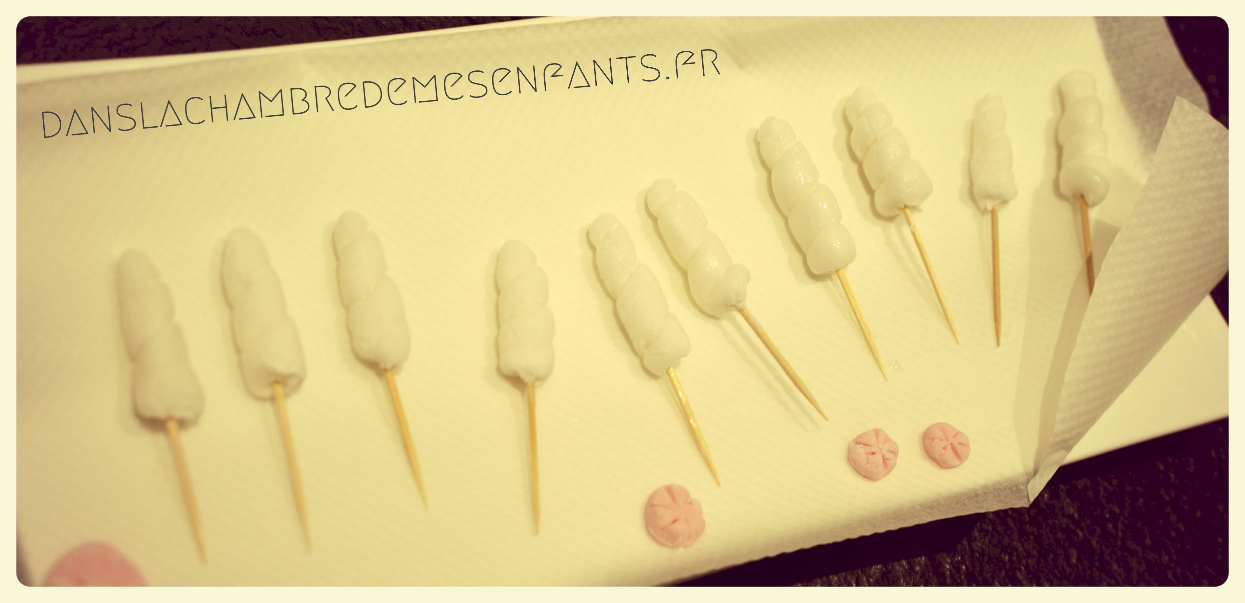 Les cornes de licorne ont été réalisées à partir de pâte à sucre blanche : j’ai formé un boudin, d’environ 1,5 cm de largeur, sur un plan couvert de sucre glace puis je l’ai découpé en morceaux de 3,5 cm de longueur. Je les ai piqués sur des cure-dents et je les ai retravaillés en cônes de 4 cm chacun. J’ai dessiné les marques de la spirale de la corne en appuyant la tranche du cure-dent de biais jusqu’au sommet (ne pas gratter la pâte à sucre). J’ai laissé sécher les cornes sur un plat couvert de papier sulfurisé.