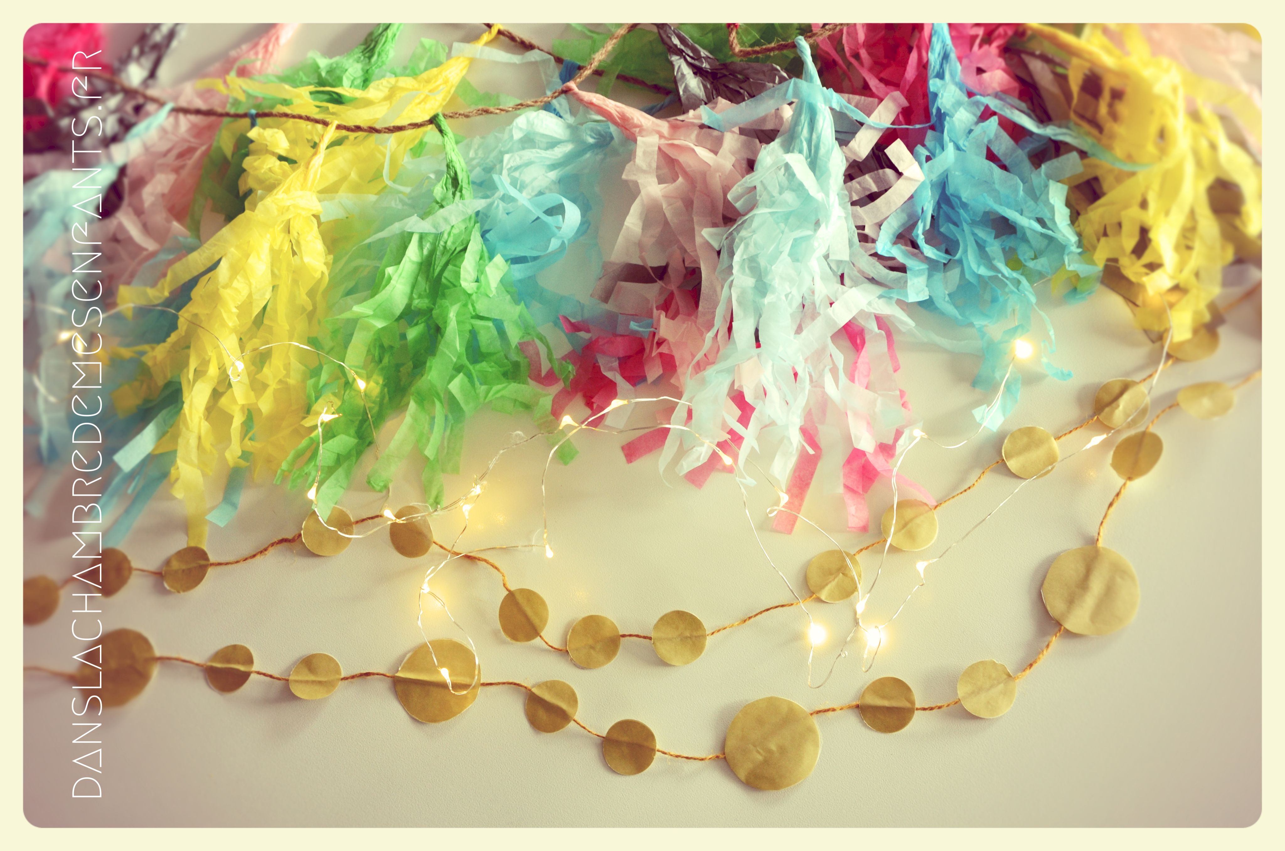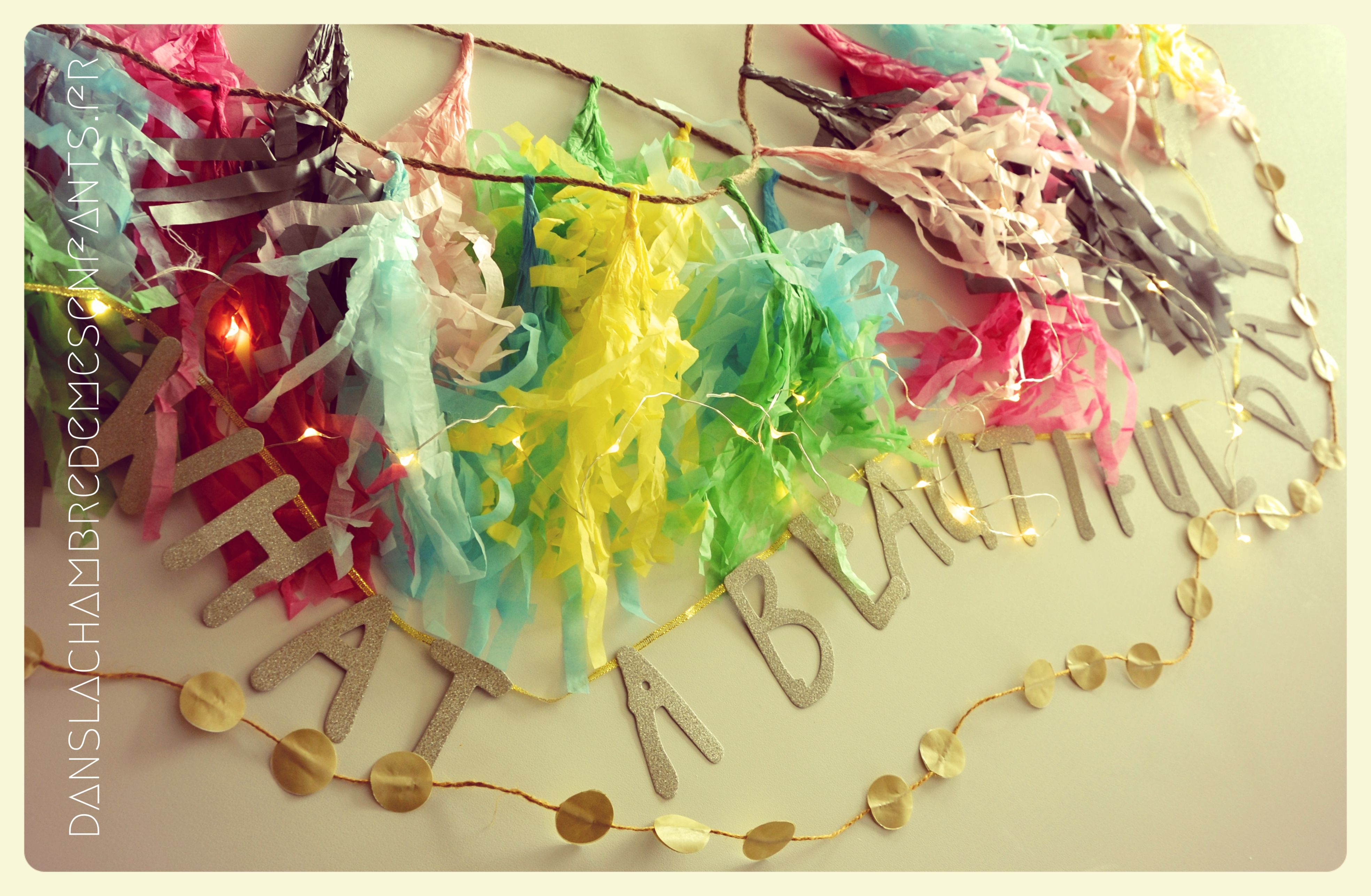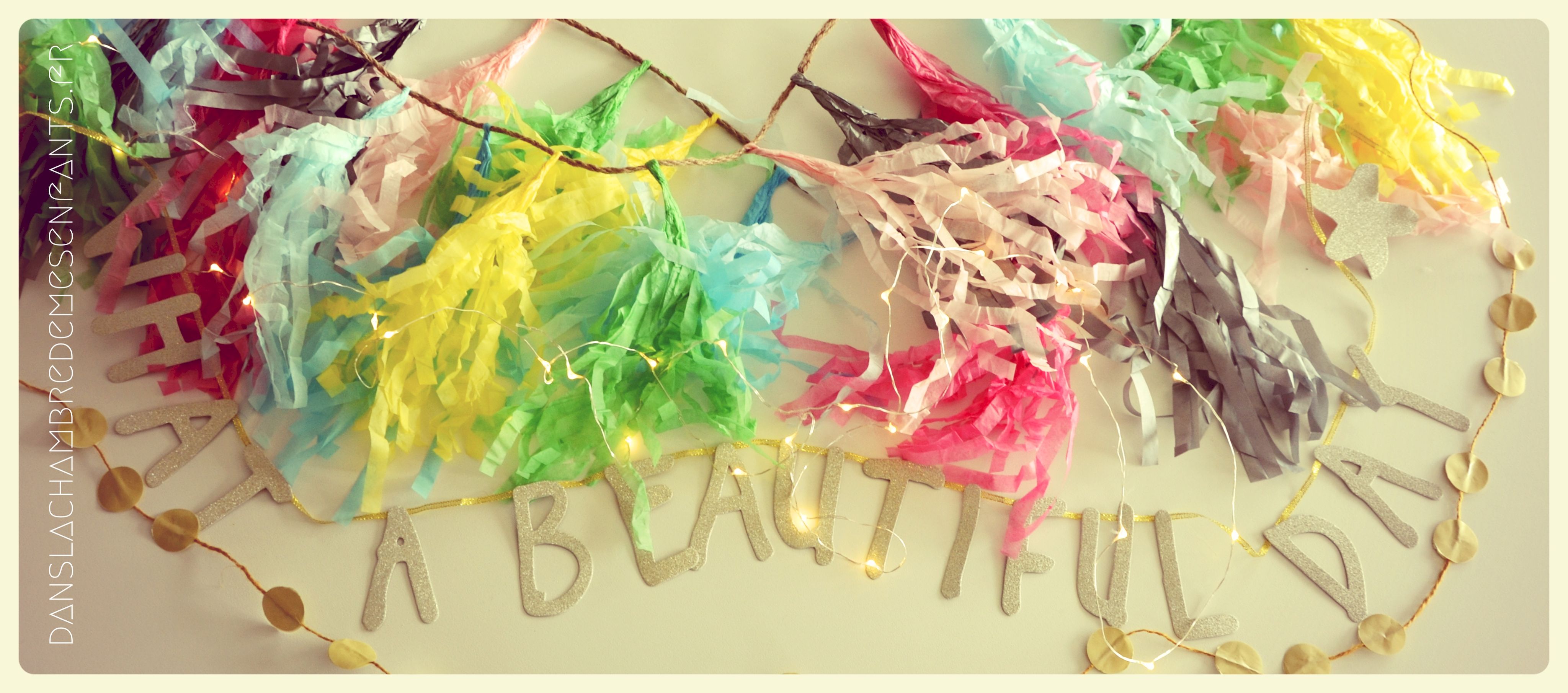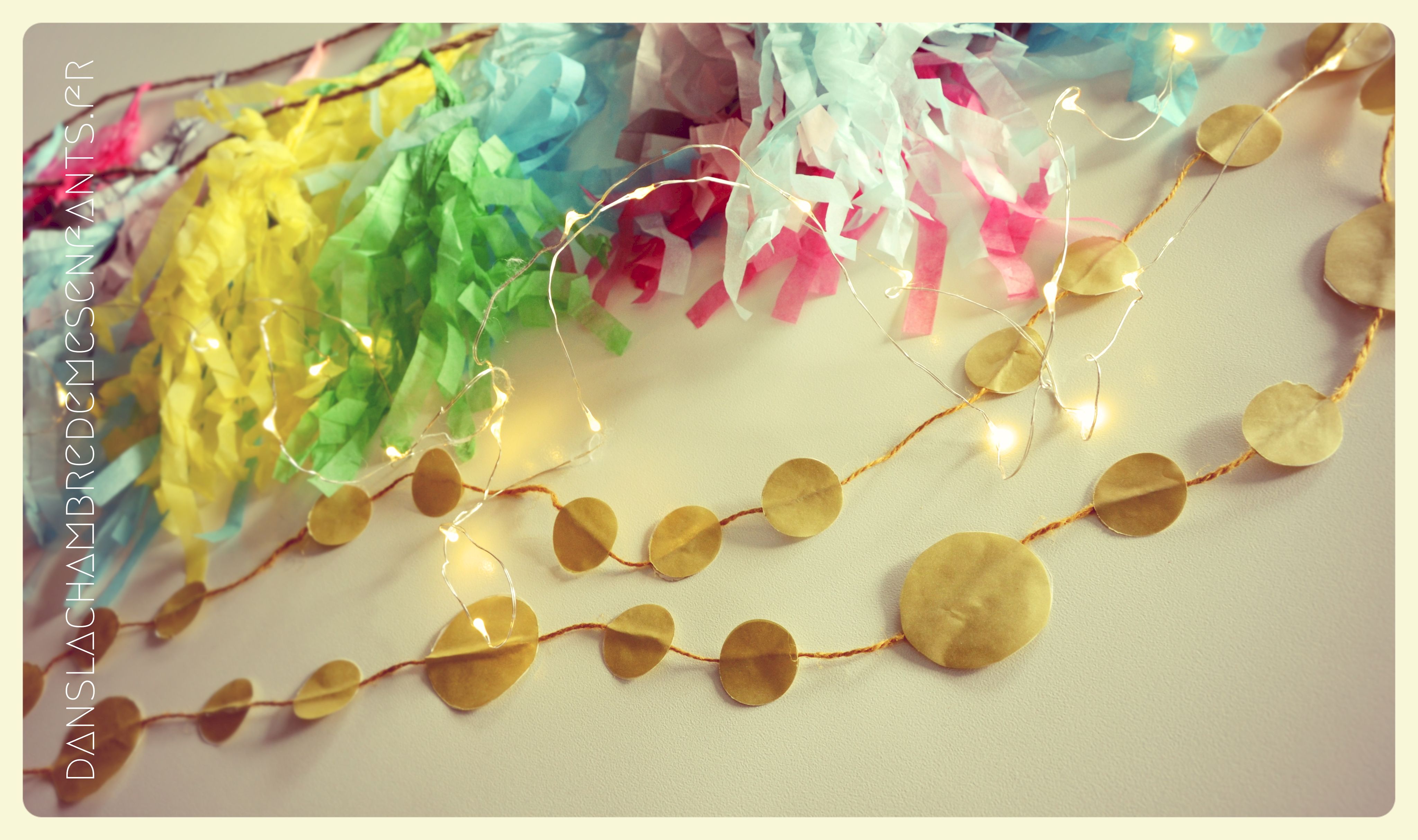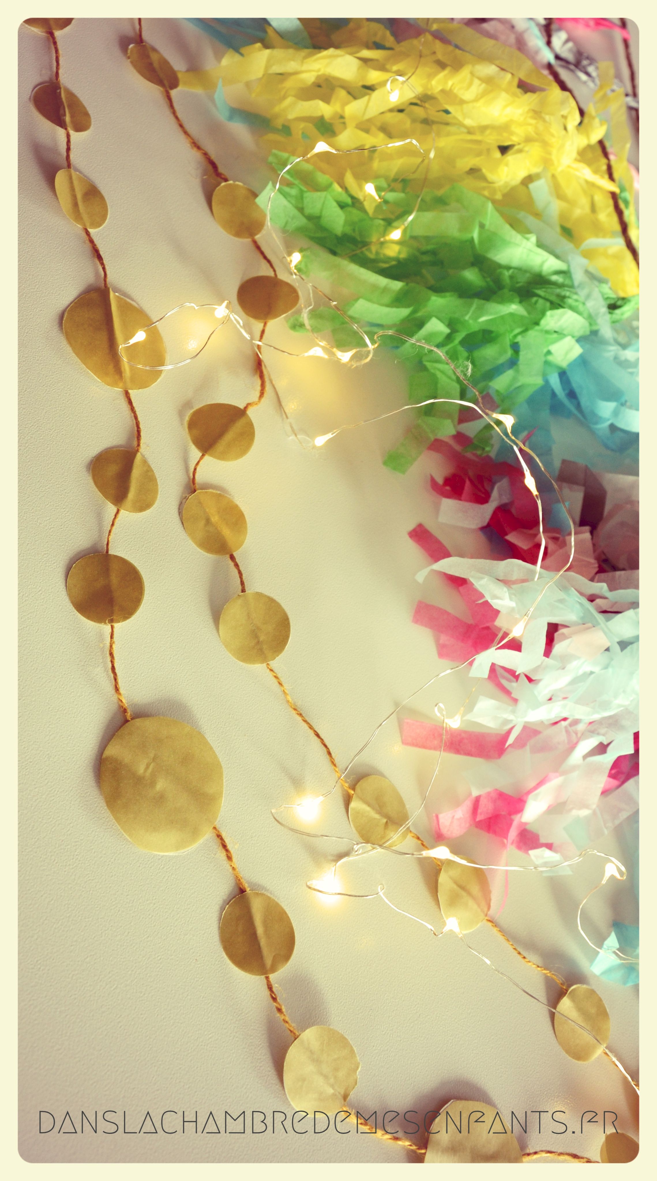 J’ai jouée avec les tailles et les espacements, prenant comme base un cercle de 2,5 cm de diamètre réalisé avec un perforateur (loisirs créatif). J’ai collé les disques ensembles le long d’un fil épais doré (Gifi). J’ai aussi réutilisé la guirlande à message « What a beautiful day » (Hema) de la chambre de ma fille.