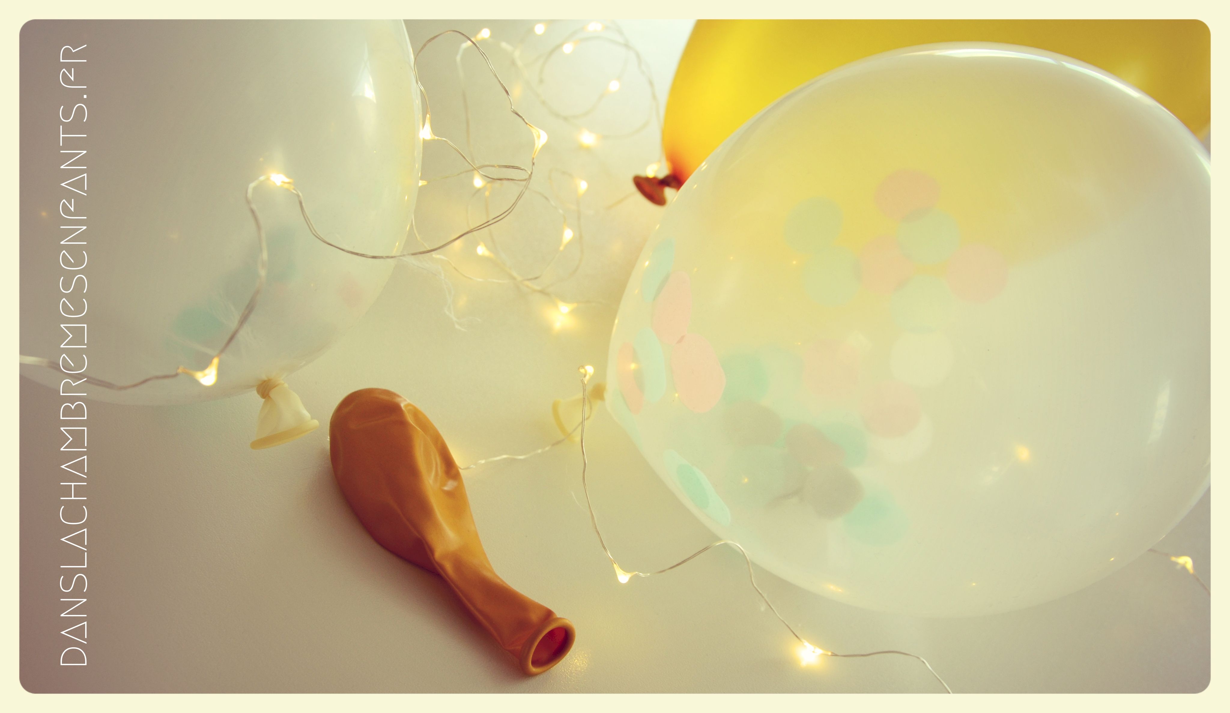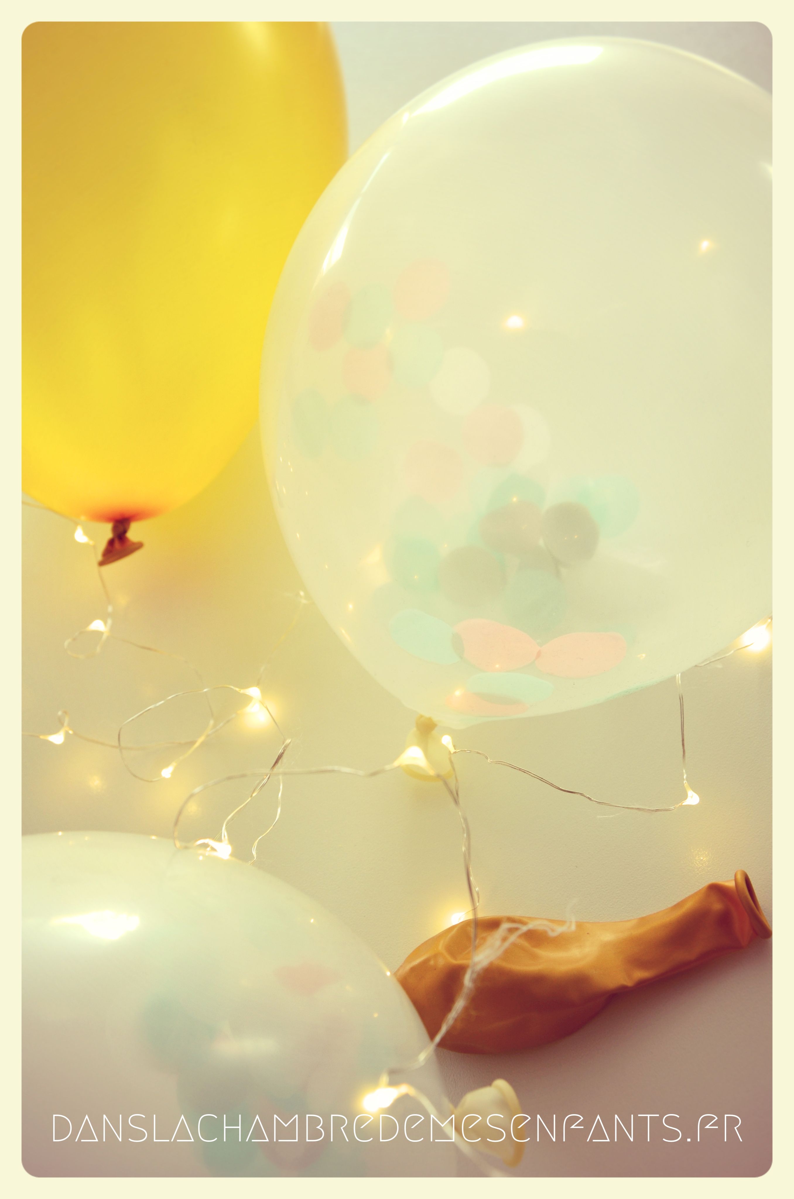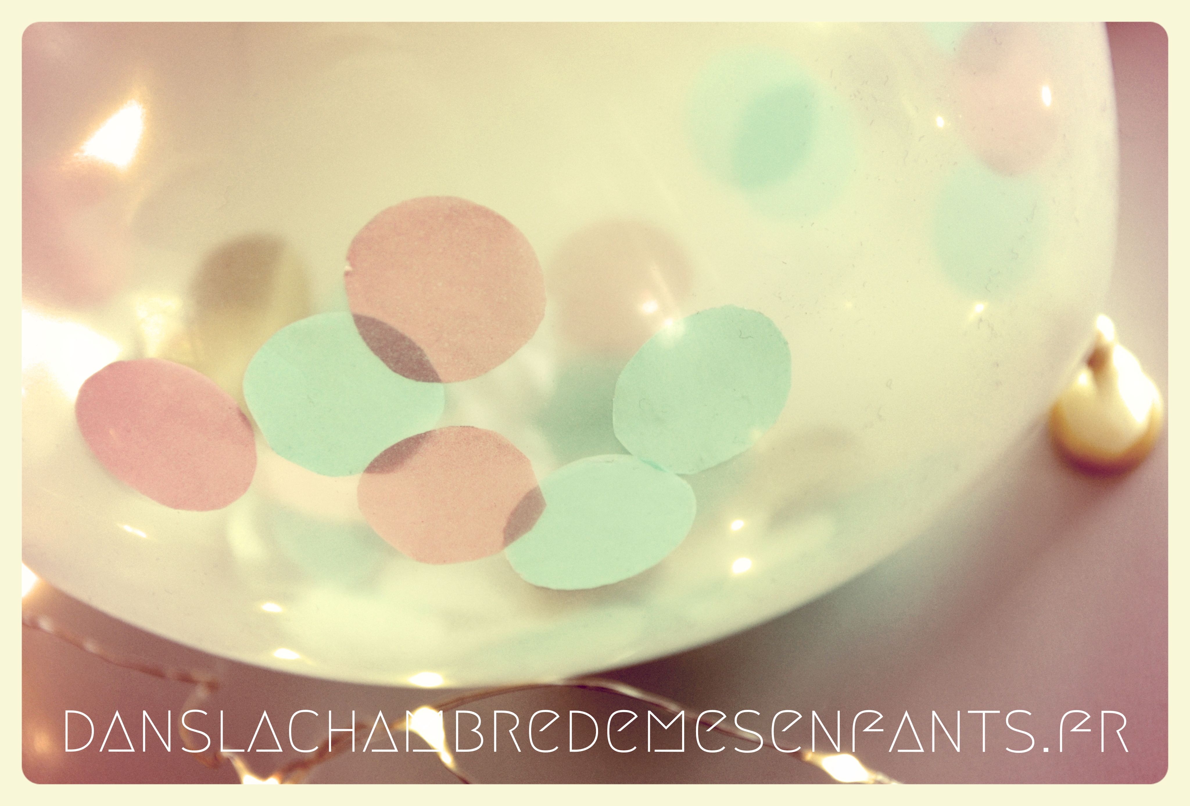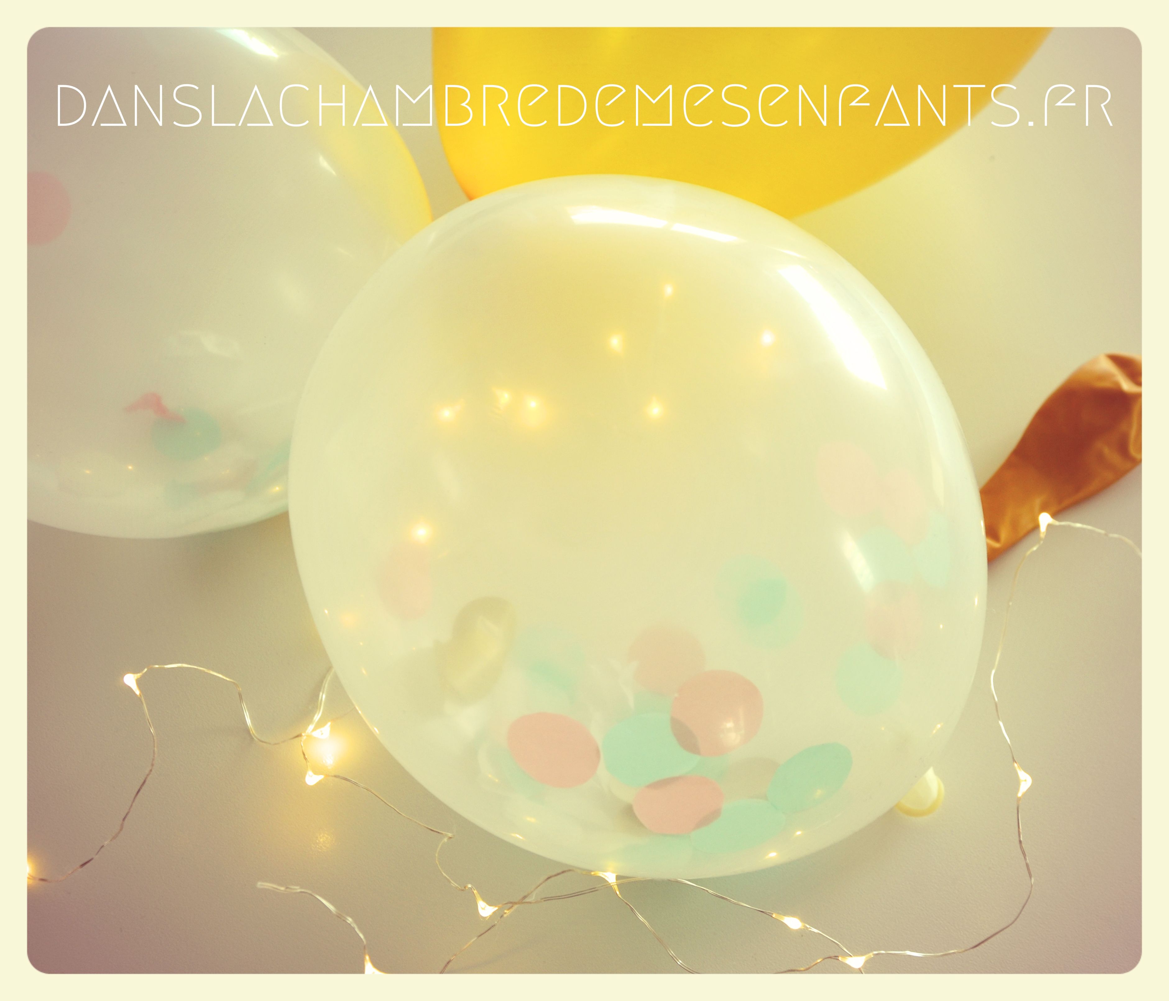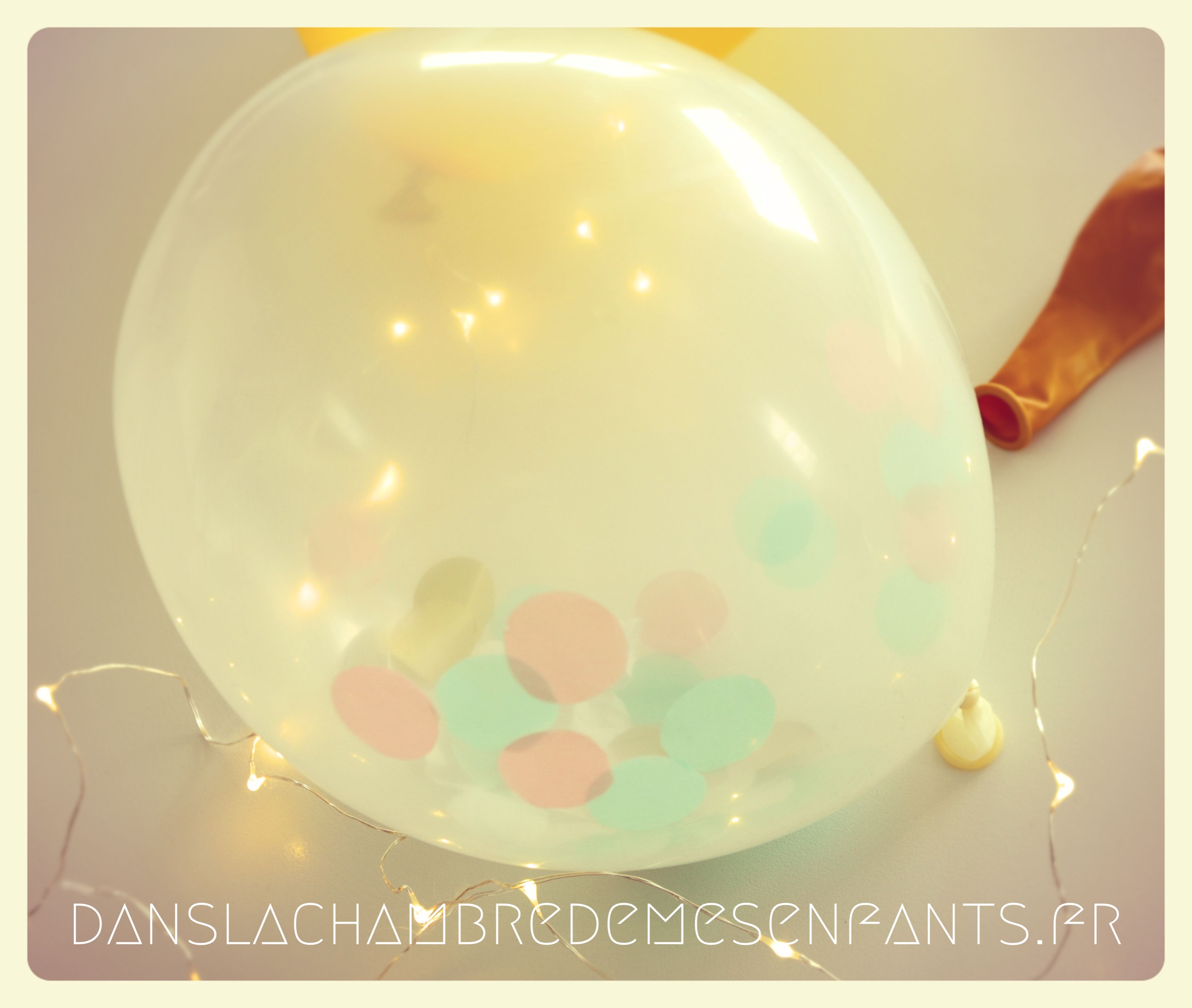 Avant le gonflage (à la bombe d’hélium ou à la pompe), les ballons transparents ont été remplis de 2 poignées de confettis.