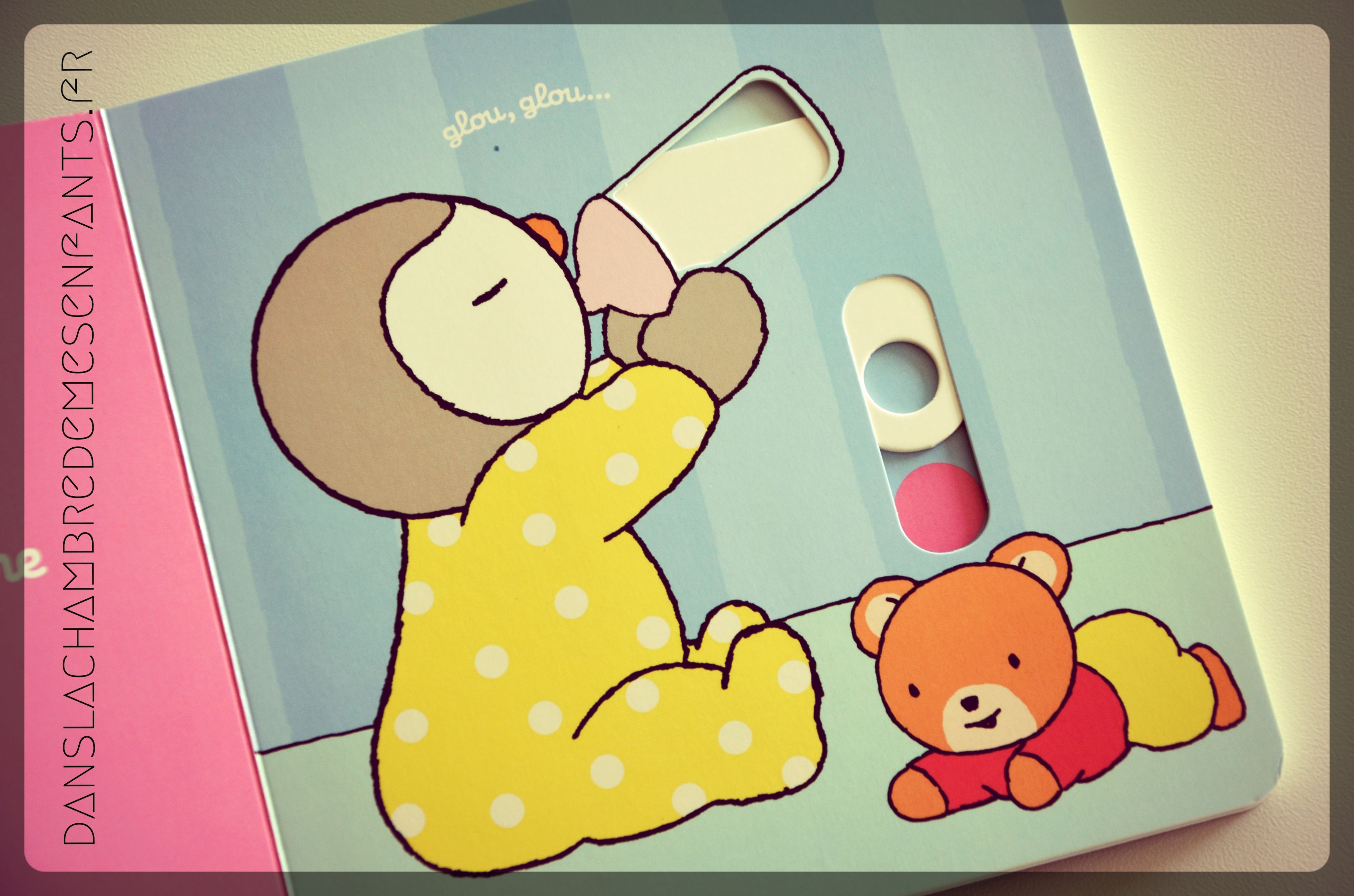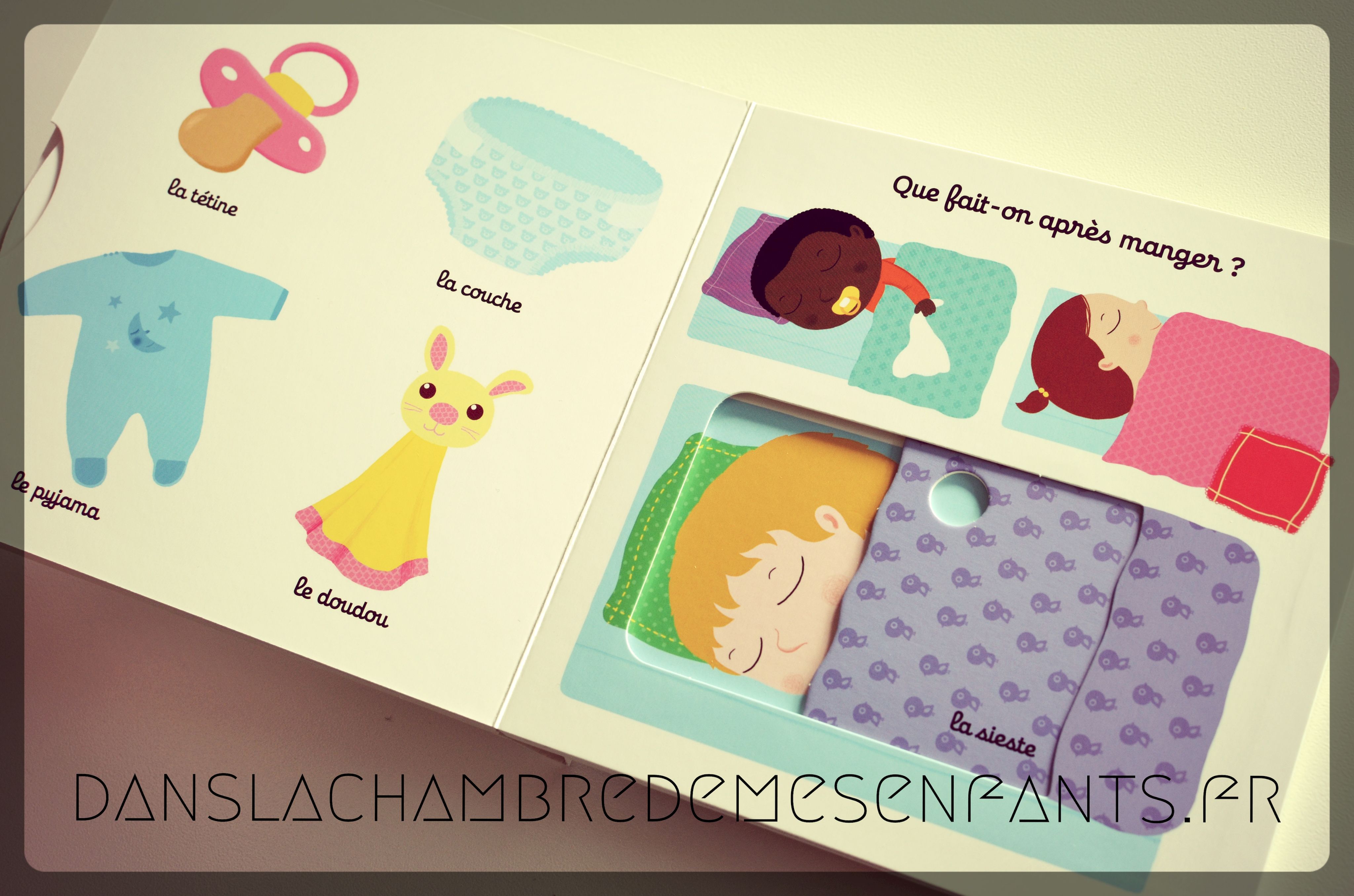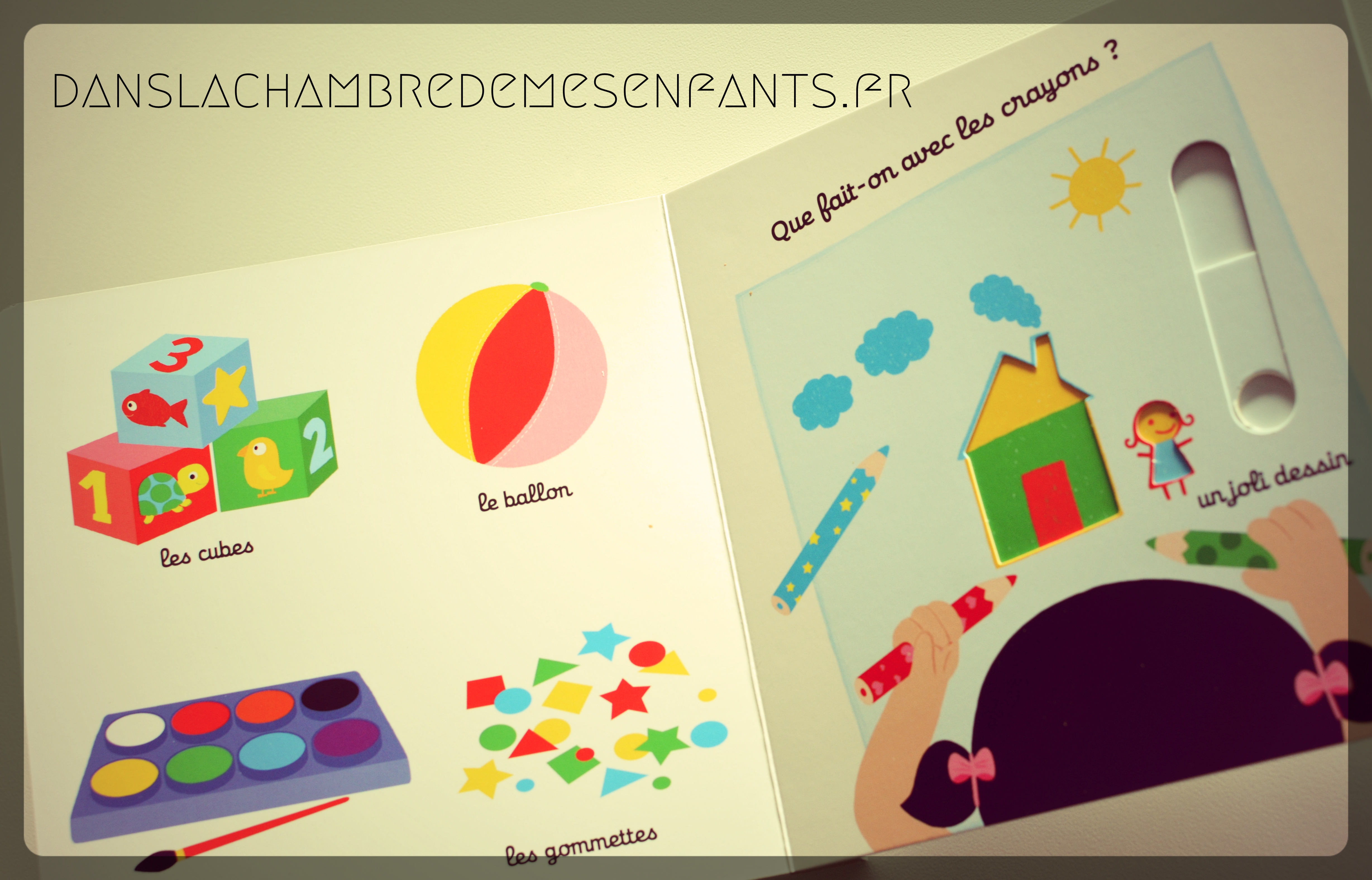 Cette collection d’imagiers, sous petit format cartonné, est assez riche car ses titres présentent des scènes animées par des volets tout en identifiant les composantes (sur les pages de gauche et en fin d’ouvrage, ex : ballon, cube…). Le style est épuré avec des couleurs réservées à la mise en valeur des sujets et les scènes bien choisies (ex : la sieste et la couverture à remonter sur l’enfant, le repas avec les plats à faire défiler dans l’assiette…).