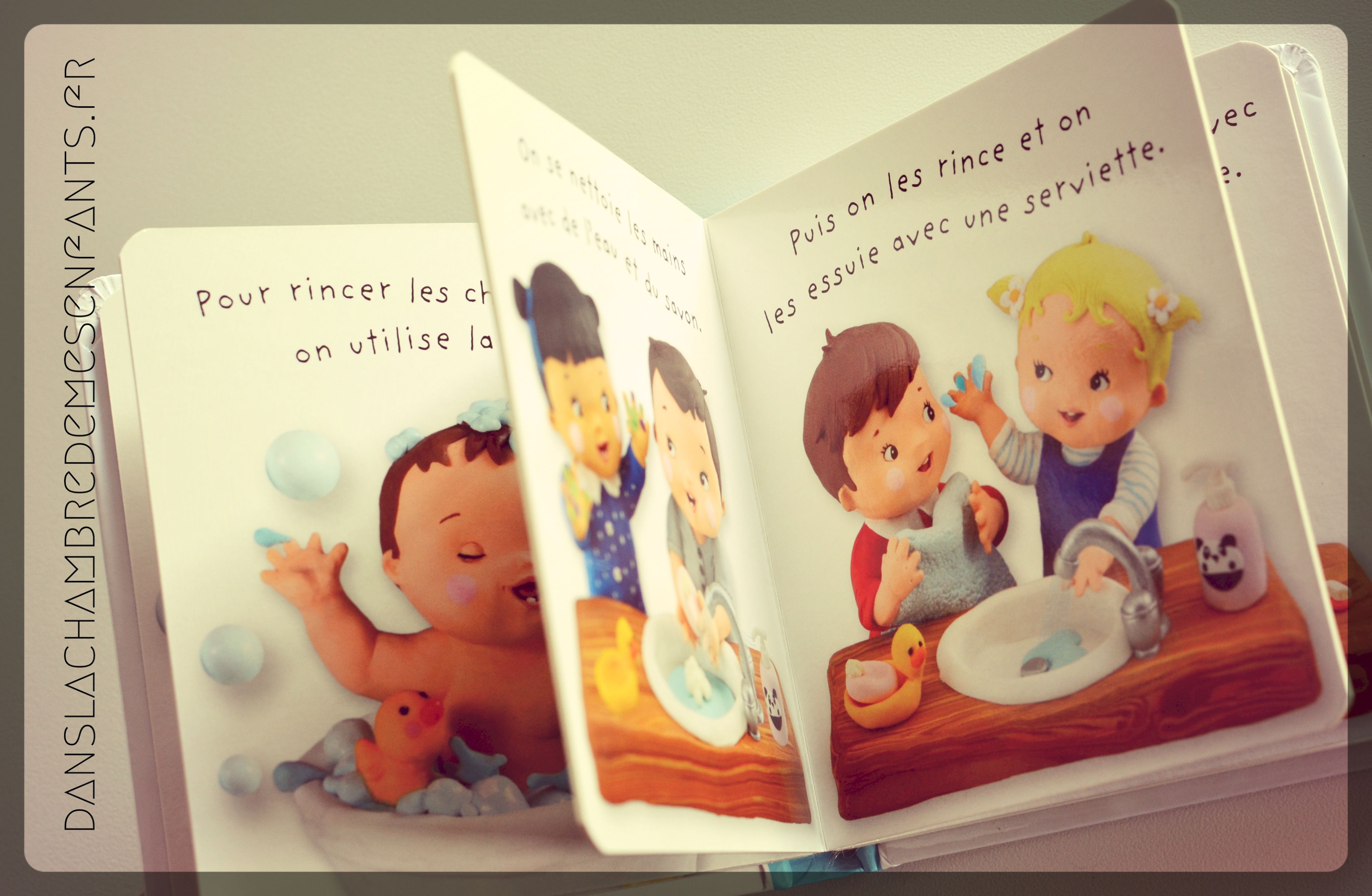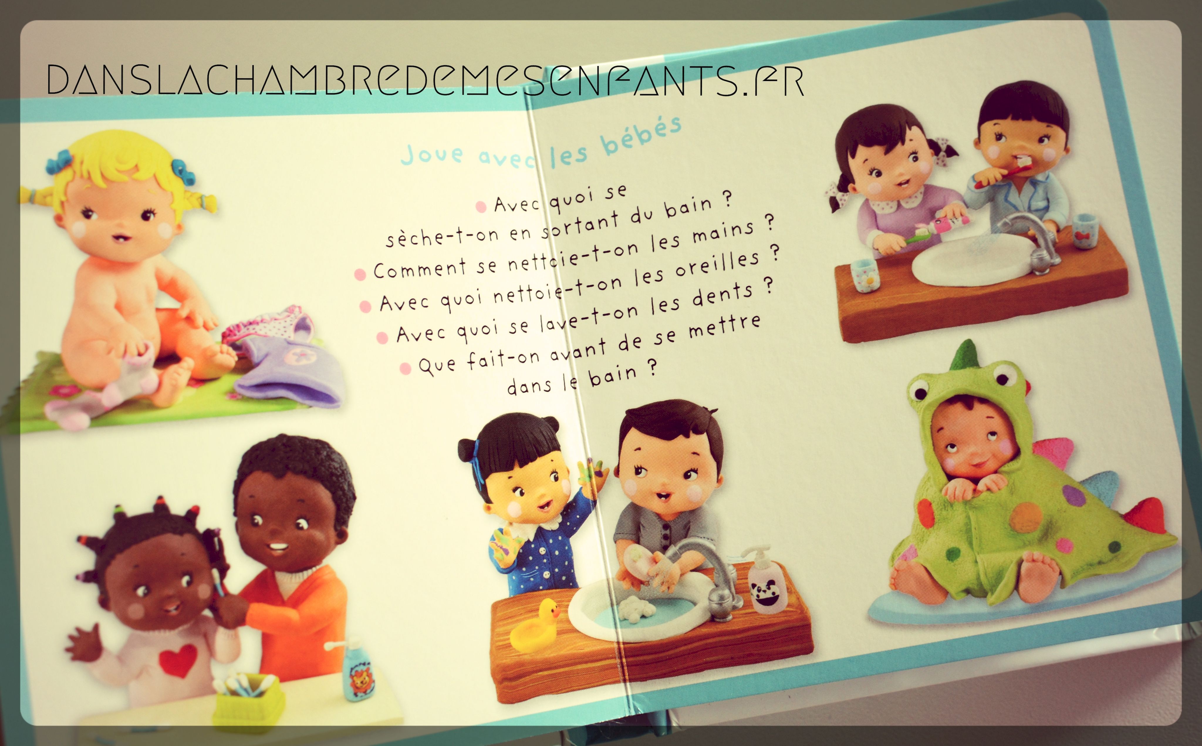 On retrouve le moment du bain, du lavage des mains, des dents… avec un bref commentaire destiné à la lecture à voix haute par un adulte. L’ouvrage est ainsi pertinent et accessible dès 1 an avec une compréhension plus complète dès 2 ans. La lecture est prolongée par un jeu de 5 questions se reportant aux scènes précédentes (ex : « Avec quoi se lave-t-on les dents ? ») qui permet à l’enfant de répondre à l’appui des réponses illustrées.