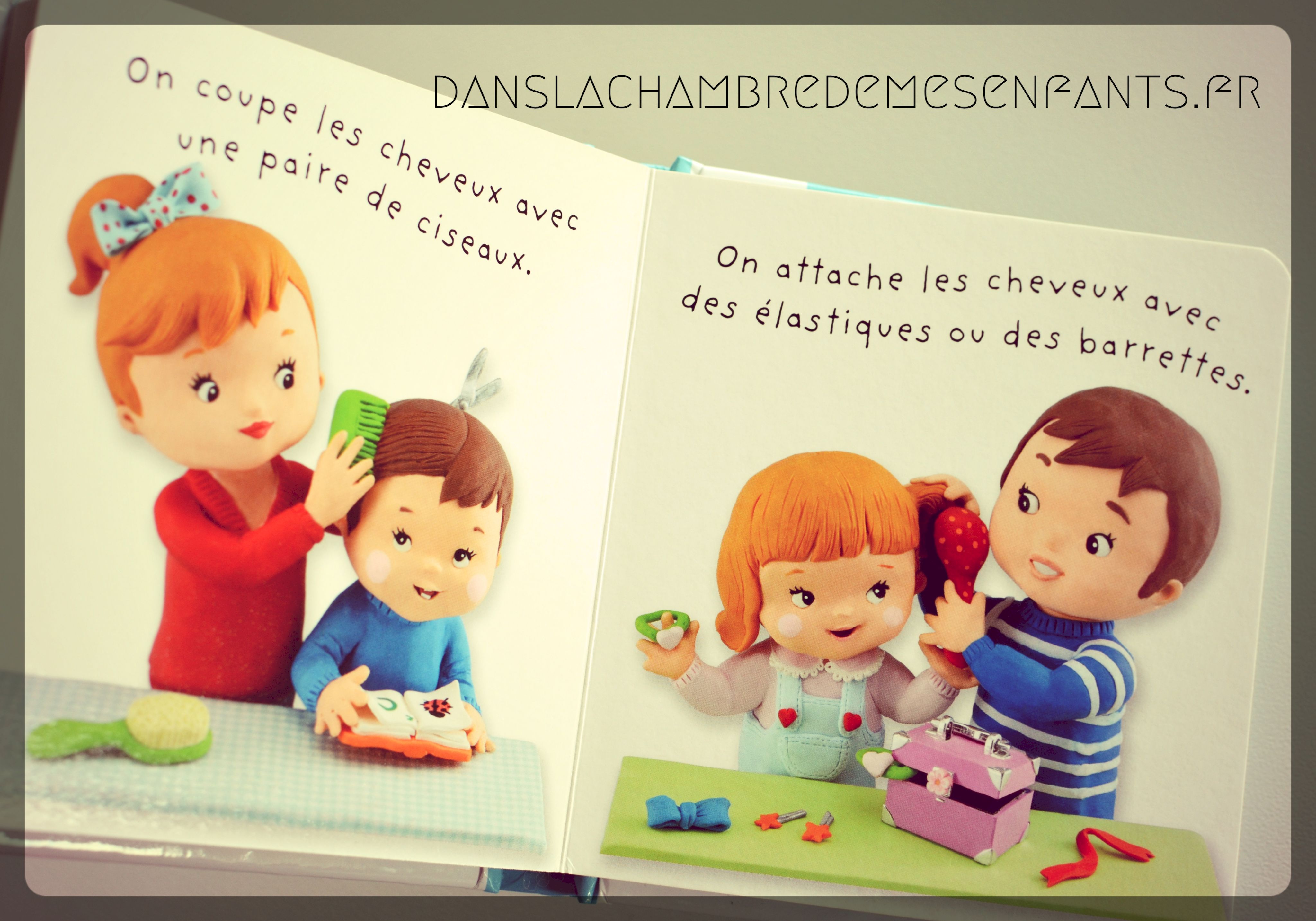 Ce livre est adapté aux petites mains et il retrace des moments du quotidien, tout particulièrement les étapes de la toilette, car c’est un sujet qui intéresse les plus petits. Il est cartonné et solide pour être mis à l’épreuve et les images sont marquées par des traits tout en rondeur à travers un travail de pâte à modeler.
