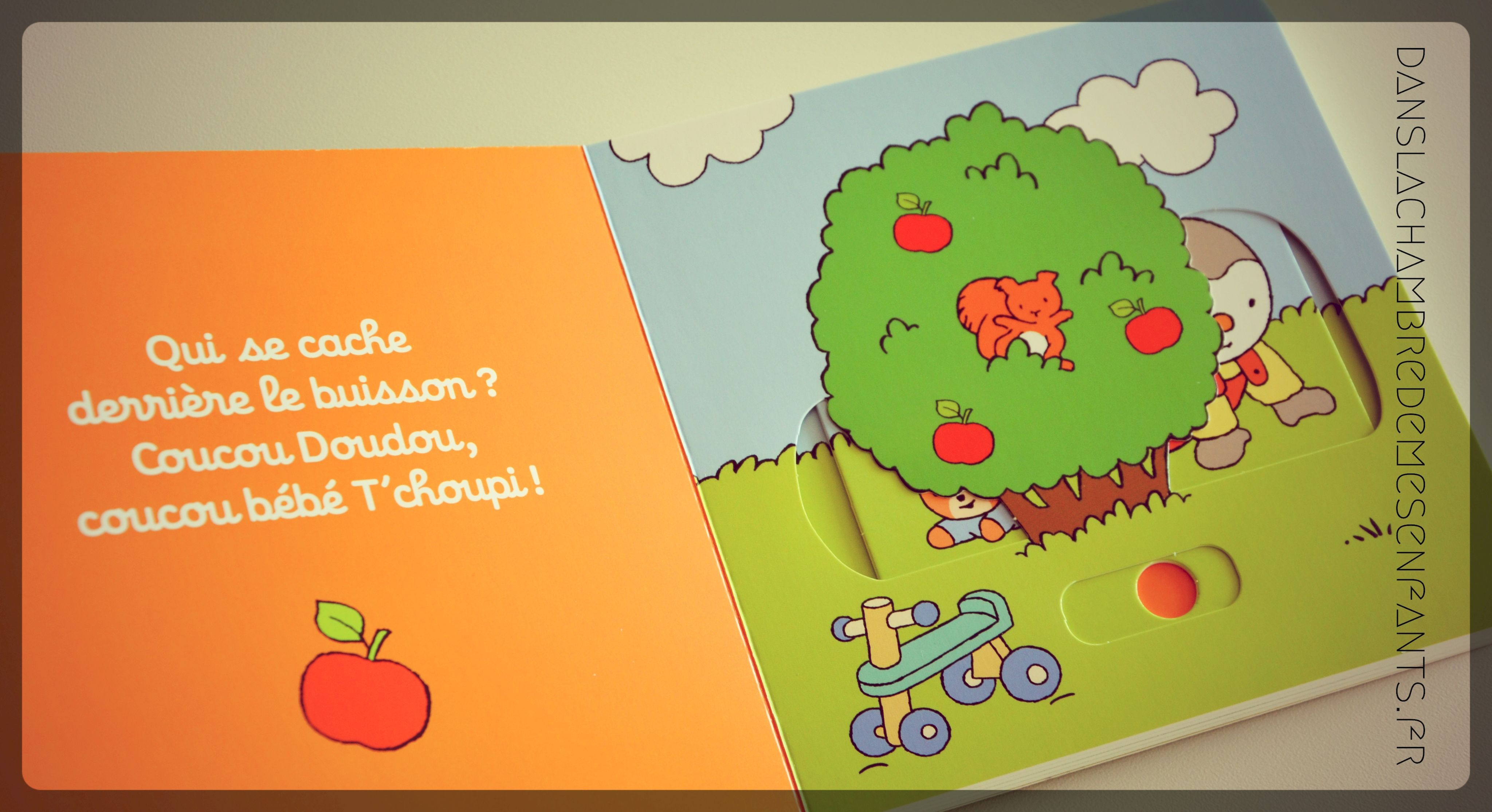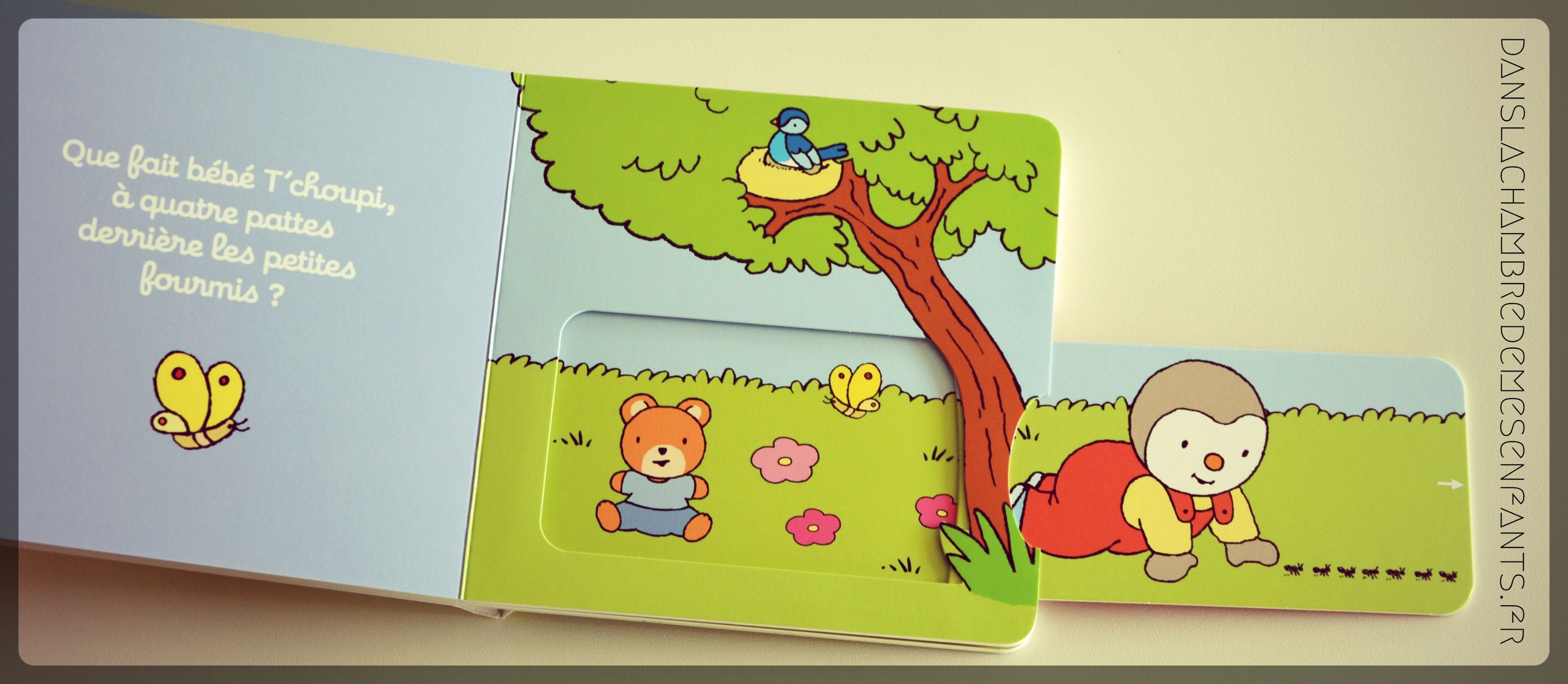 On retrouve notre petit pingouin dans un style adouci grâce à des tons pastel choisis pour la collection « bébé T’choupi ». Que ce soit pour les rituels du soir, du bain au coucher, ou pour une sortie au jardin d’enfants en jouant à cache-cache avec Doudou ou au ballon, T’choupi présente ces moments du quotidien des tout-petits, selon moi, dès 1 an. L’enfant participe en activant de nombreuses animations à savoir des volets coulissants et des roulettes, parfois repérés par un cercle de couleurs et des sens de direction.
