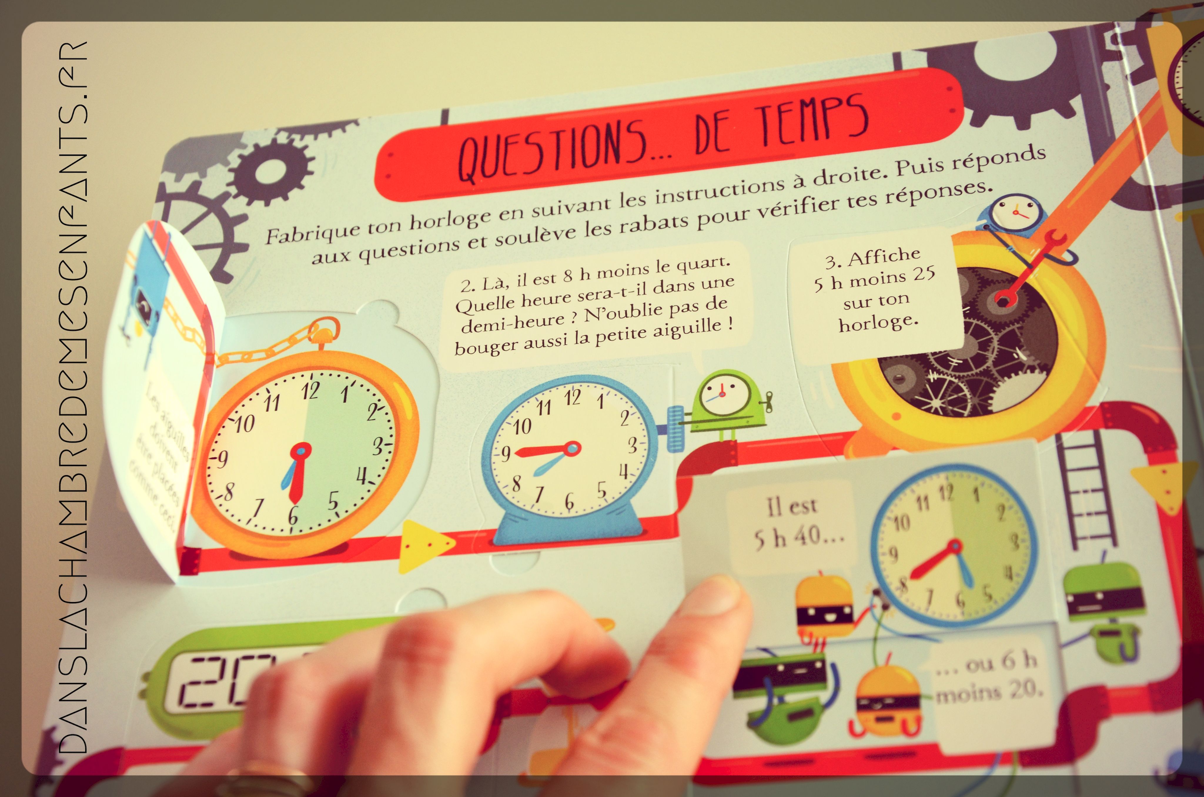 L’avis des enfants : Alex, 6 ans, a très tôt eu des facilités avec les chiffres (pour ça, il ne tient ni de sa mère ni de son père !) et il a eu de bonnes notions dès 3/4 ans. Il sait donc lire l’heure sans difficulté, sur tout type d’horloge, et faire des calculs en lien. Cependant, en s’intéressant à cet ouvrage, ses capacités ont été mises à l’épreuve et il reste toujours à apprendre (ex : notion « am » et « pm »). Le sujet lui a tout de même plu (c’est que l’on parle de chiffres alors…) et c’est lui qui lisait (pour m’expliquer… mais oui, mais oui). Il a eu une préférence pour la fin de l’ouvrage : petit quiz et montage des aiguilles d’une horloge… qu’il a bien sûr mise à l’heure !