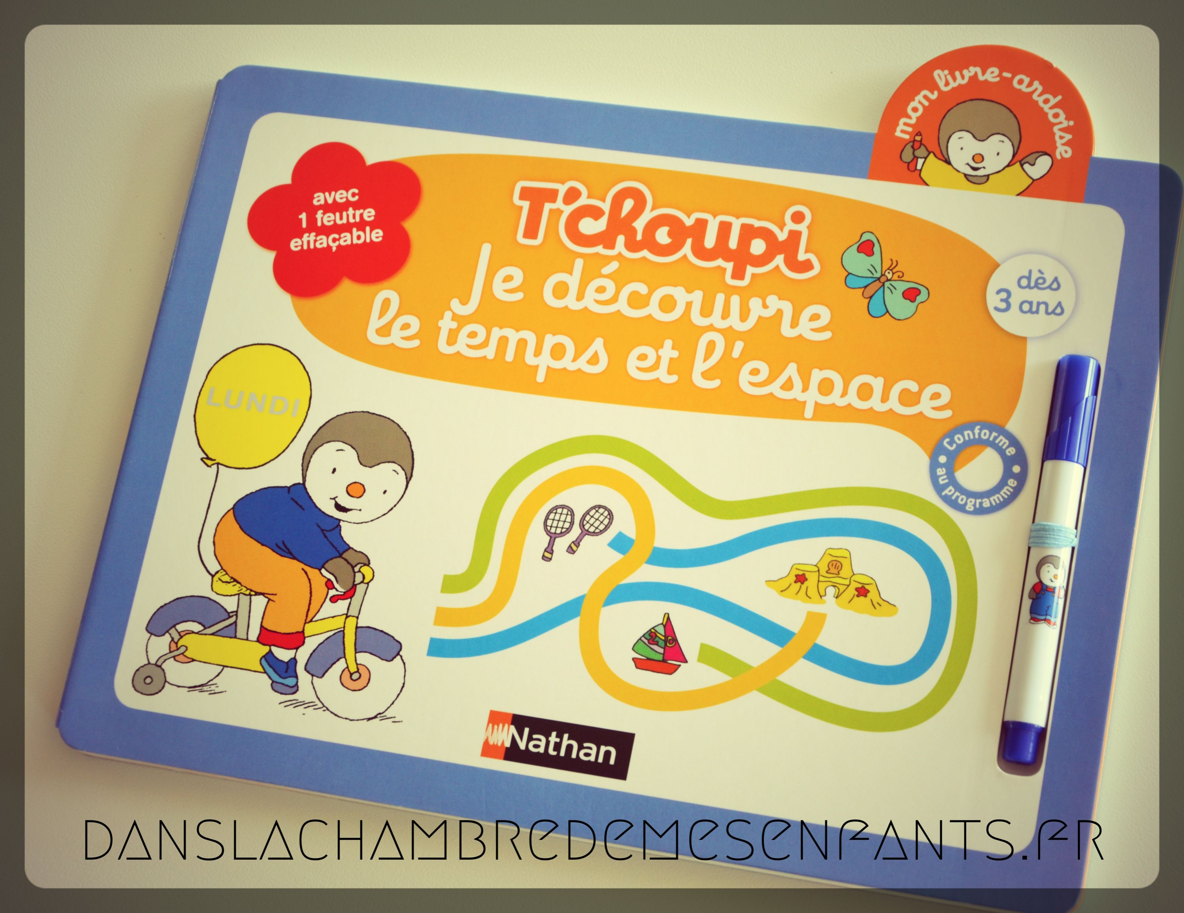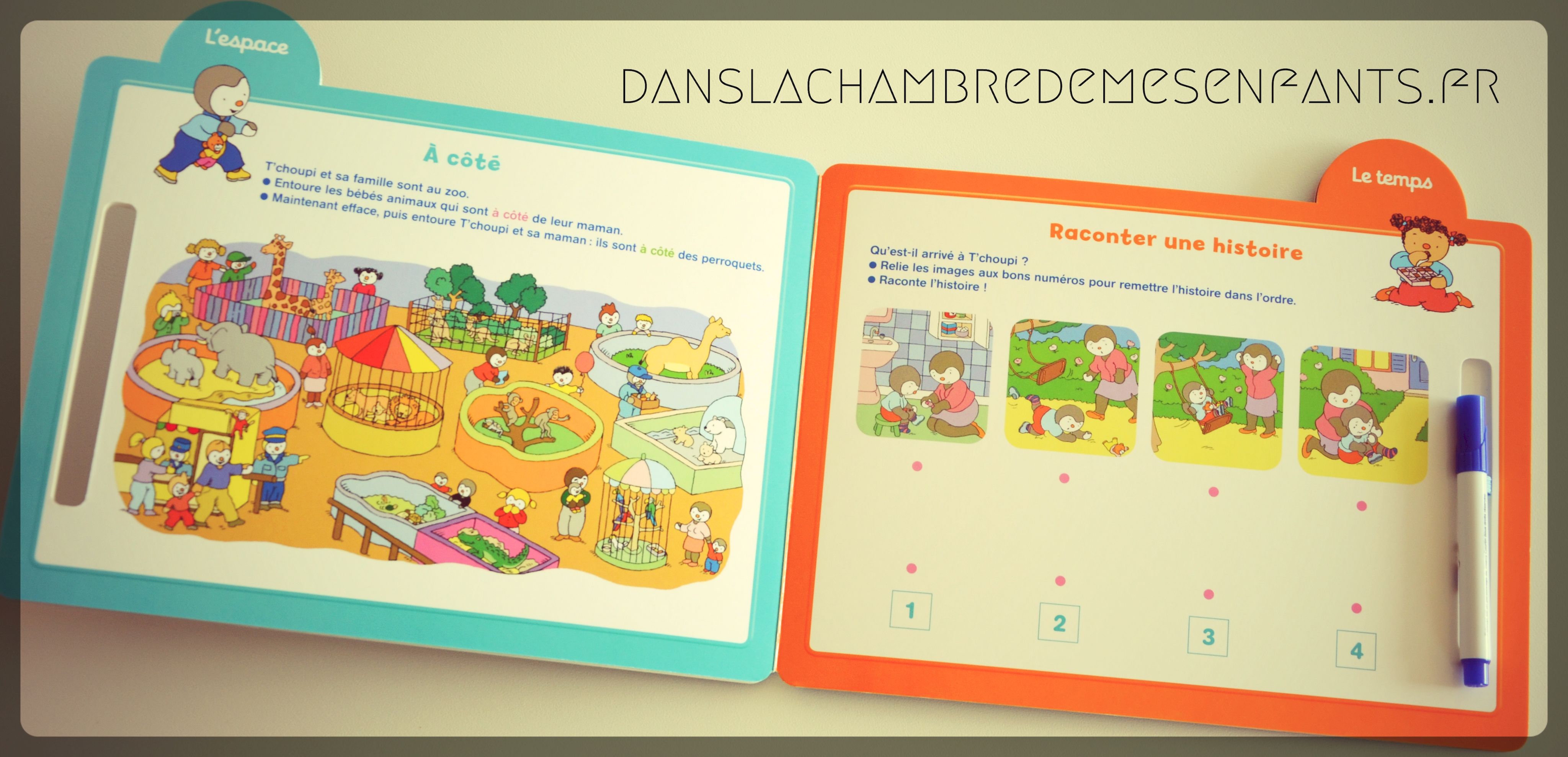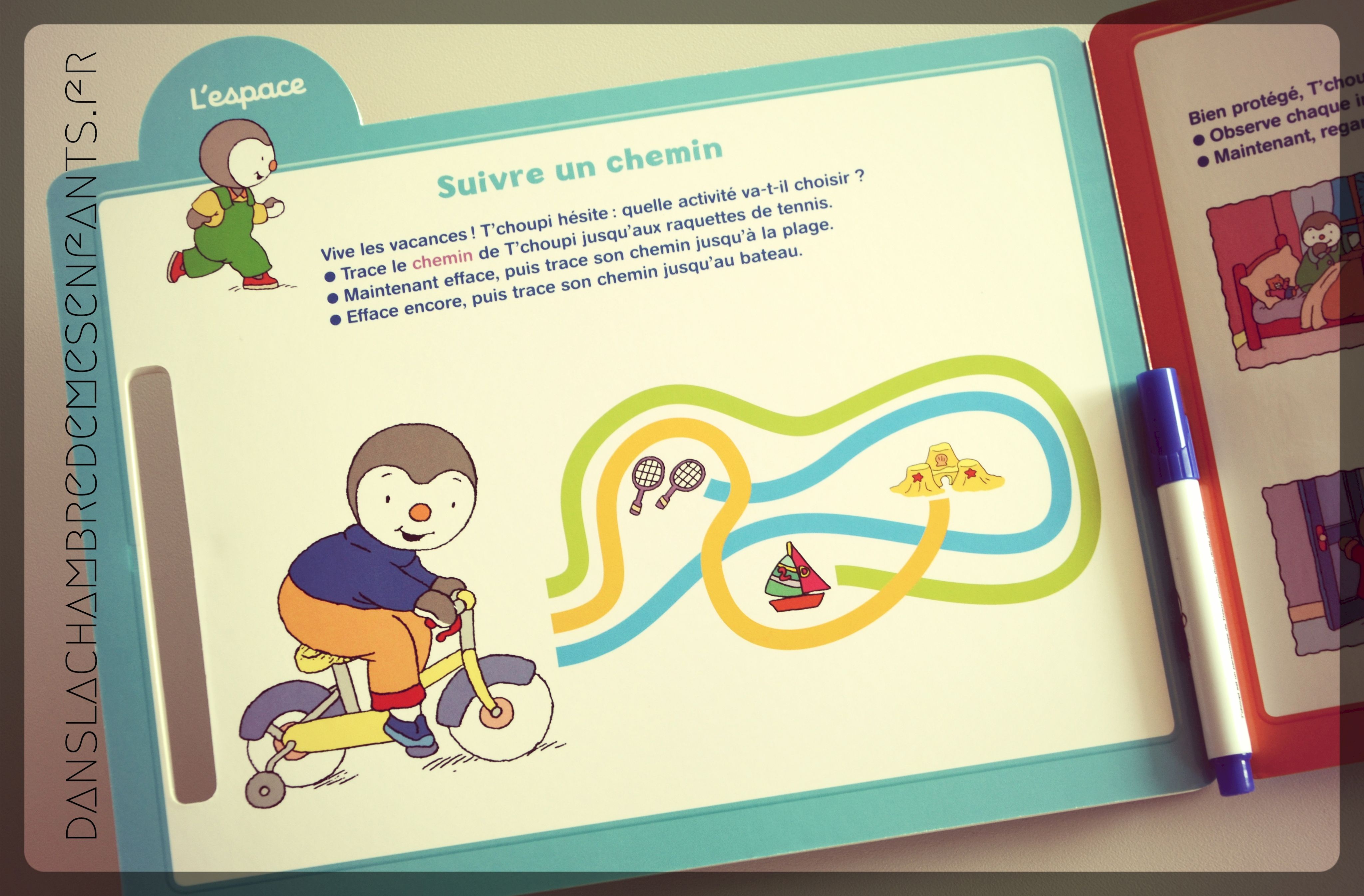 Voici un livre qui peut être utilisé comme une ardoise grâce à des pages (cartonnées) plastifiées et un feutre effaçable (fourni). En suivant le petit pingouin T’choupi, souvent déjà familier, les enfants jouent en travaillant le repérage.