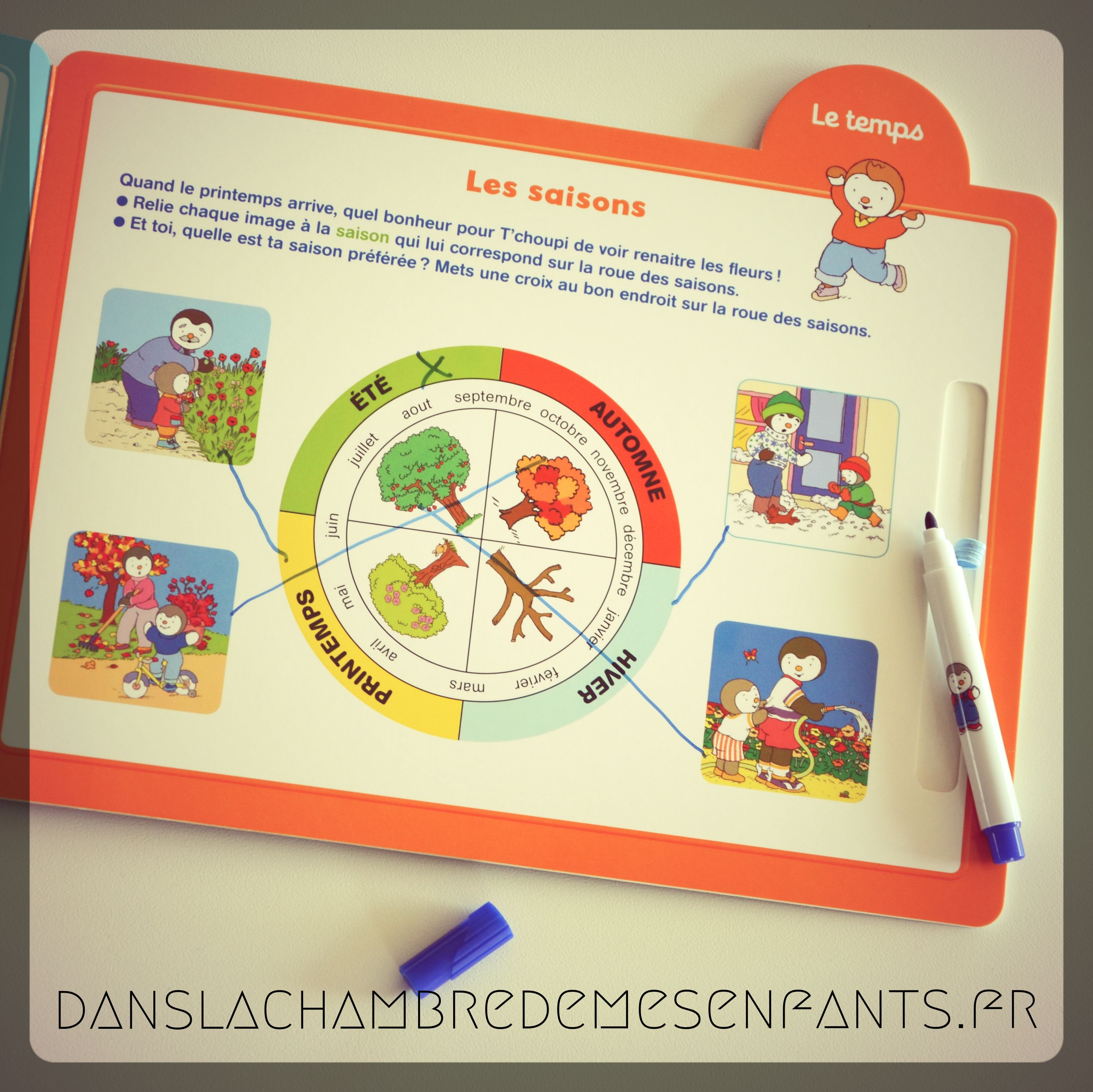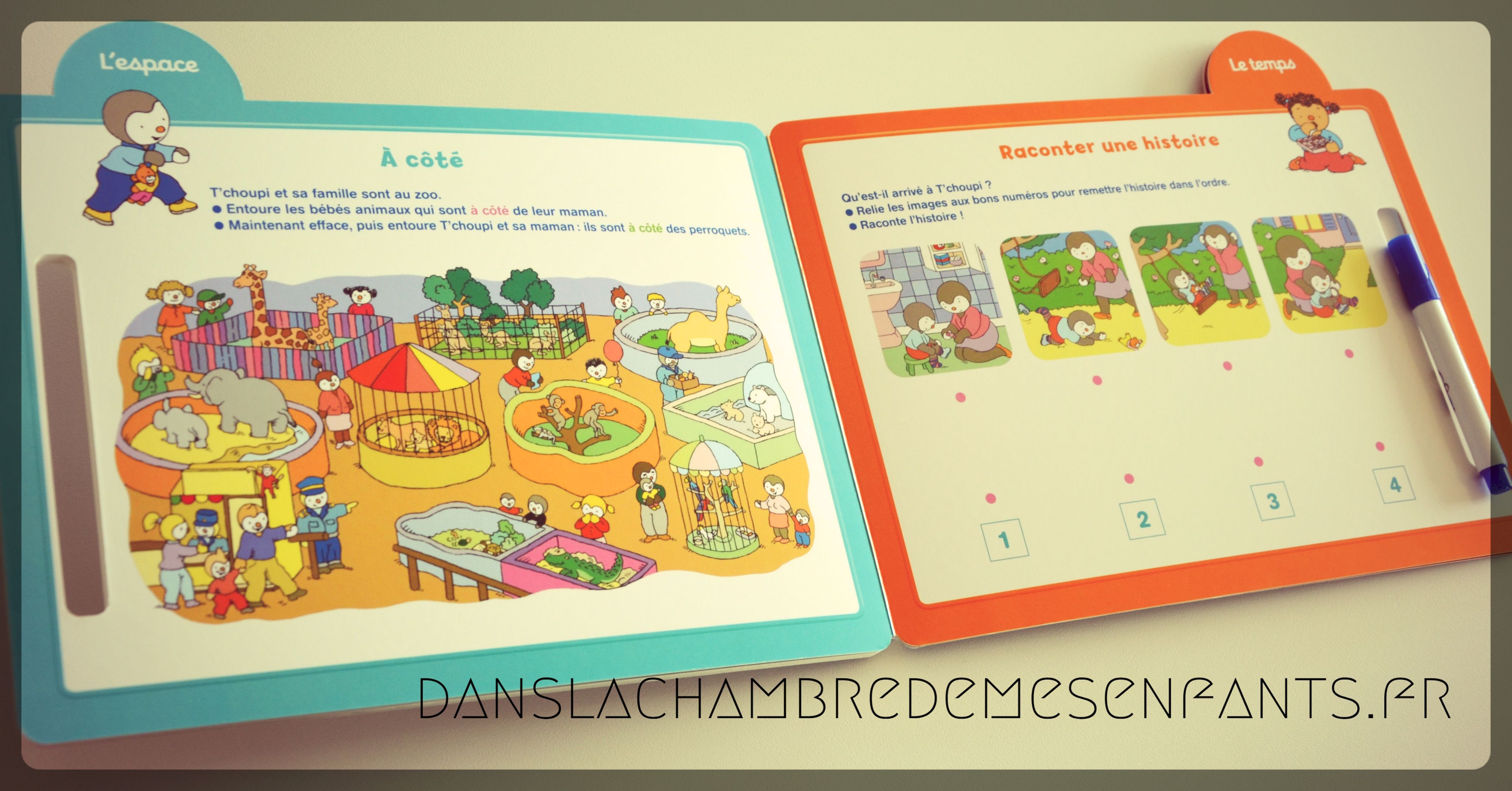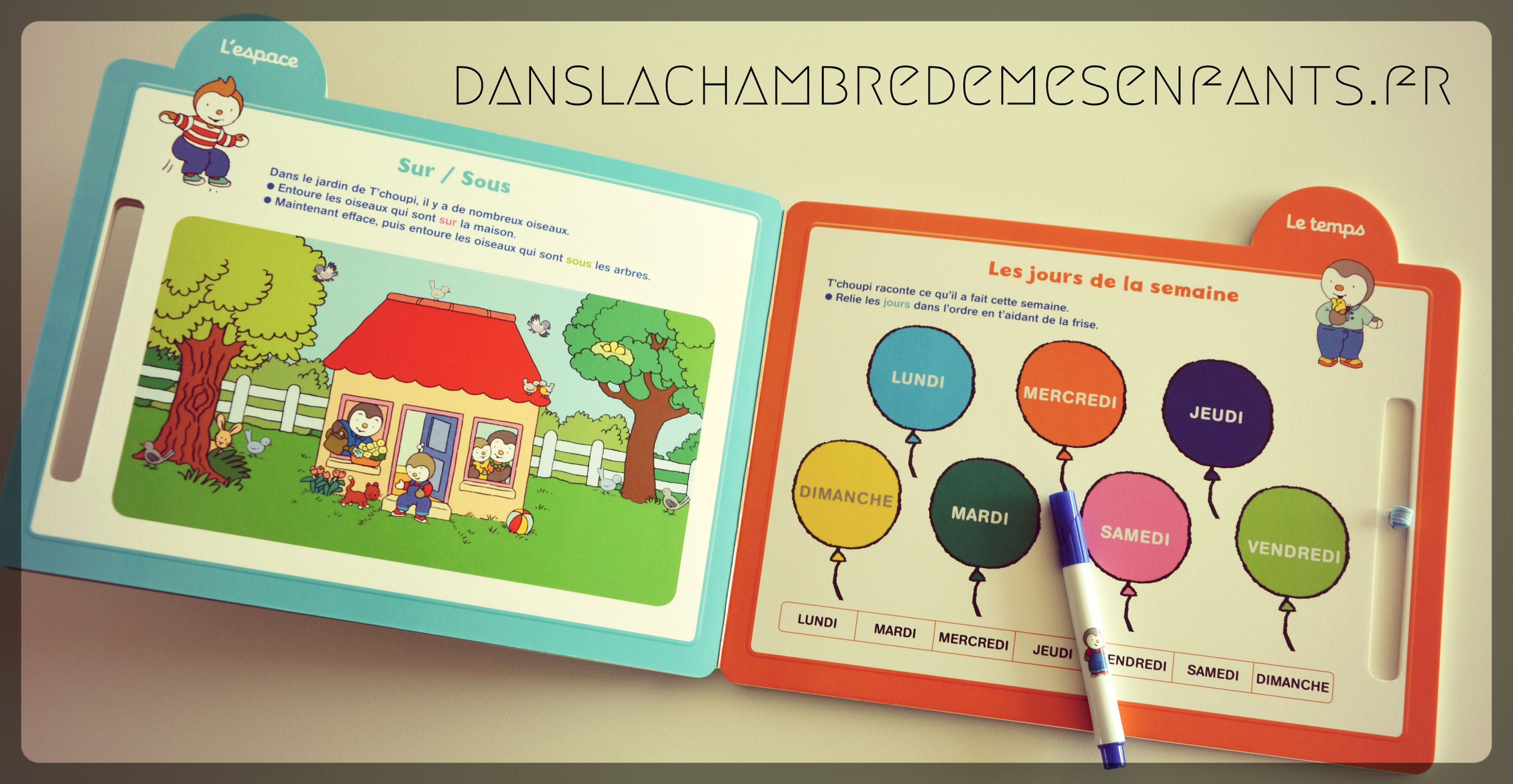 Voici un livre qui peut être utilisé comme une ardoise grâce à des pages (cartonnées) plastifiées et un feutre effaçable (fourni). En suivant le petit pingouin T’choupi, souvent déjà familier, les enfants jouent en travaillant le repérage.