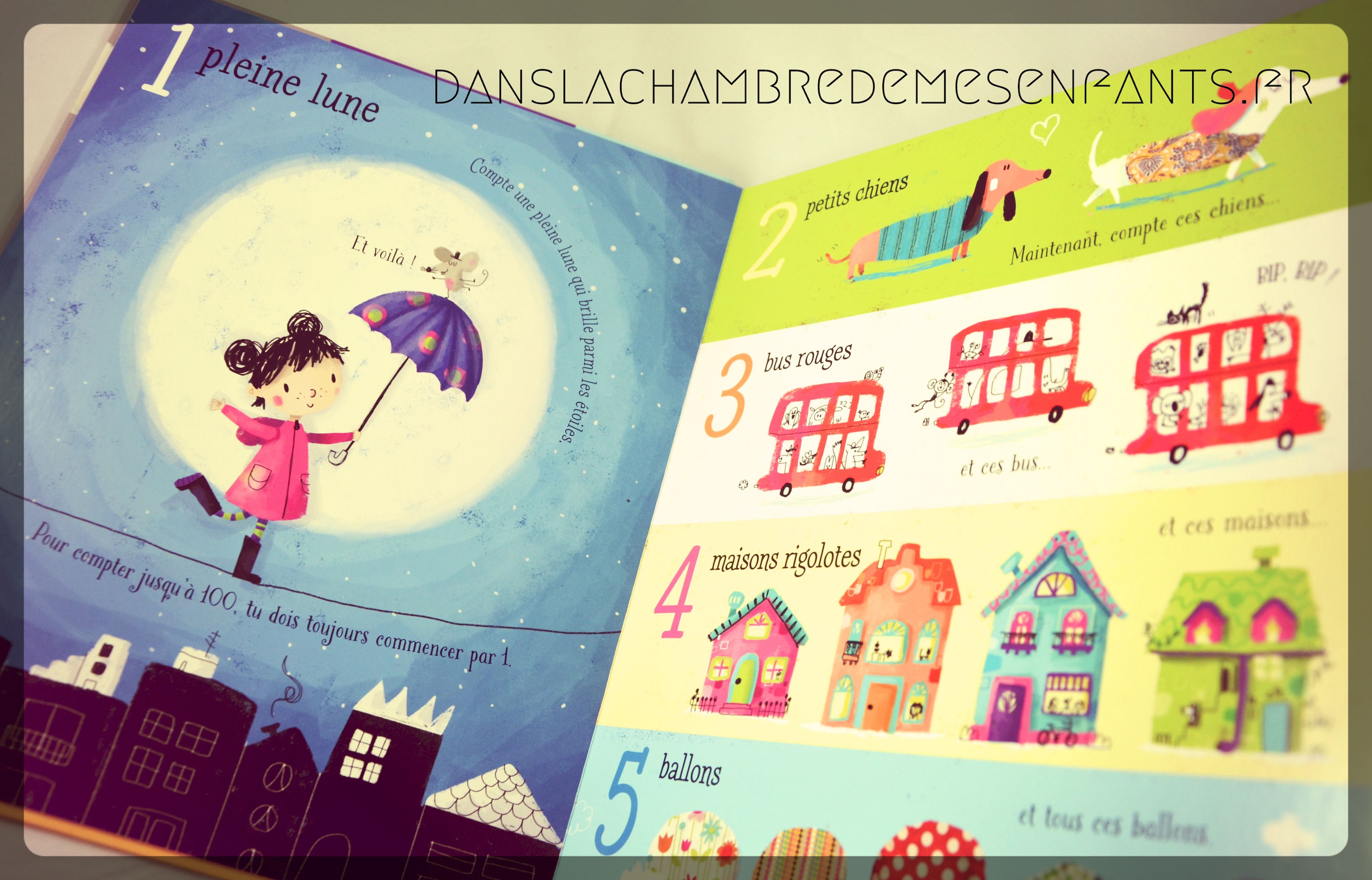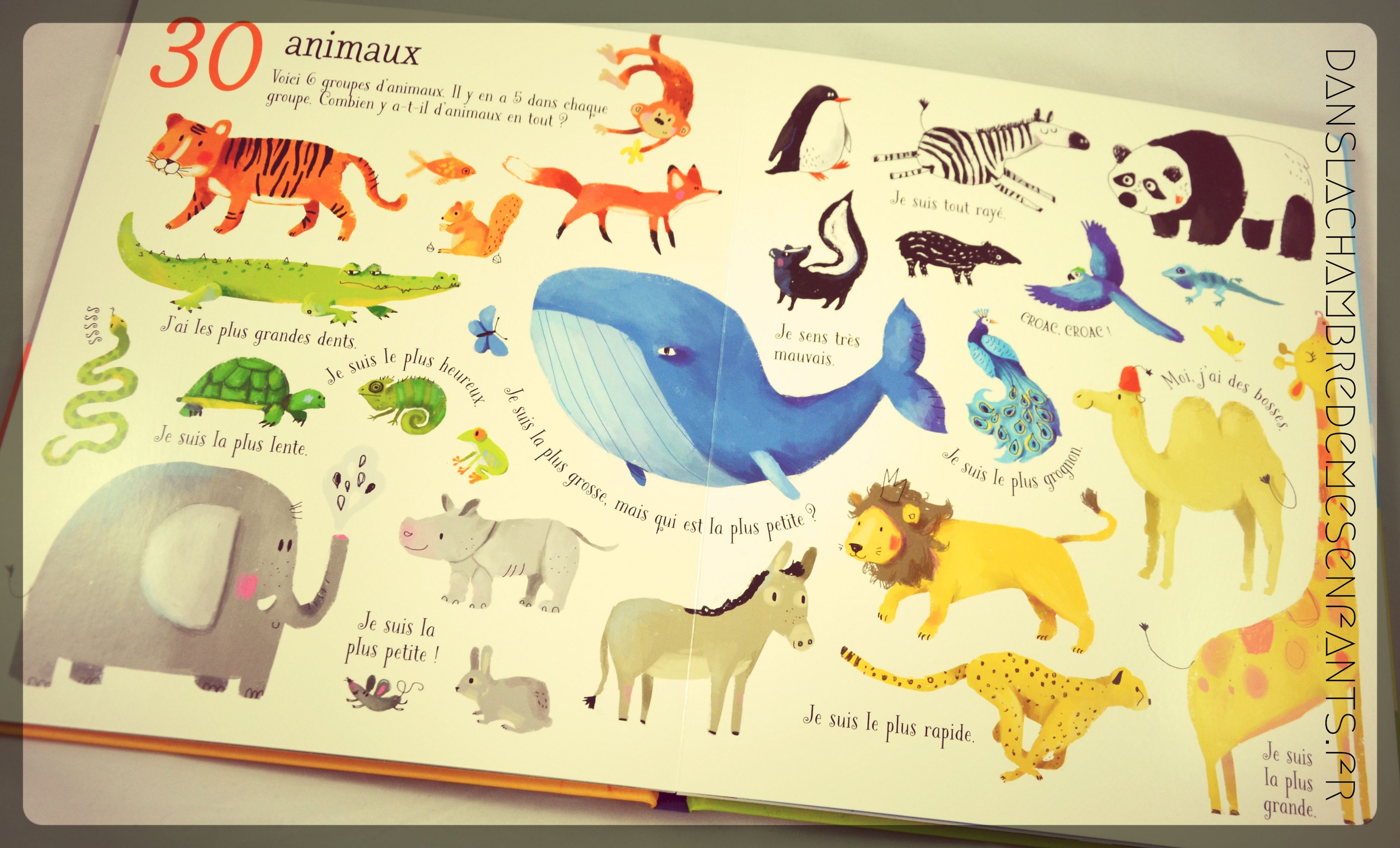 On commence par compter 1 pleine lune, 2 petits chiens, 3 bus rouges… et, arrivé à 10, c’est une découverte par dizaine (20, 30…). Quelques commentaires agrémentent les illustrations (ex : « J’ai les plus grandes dents » [ndlr : le crocodile]) et des petits jeux poussent plus loin l’exercice (ex : « Peux-tu compter 60 poissons colorés qui nagent dans la mer ? » « Quel animal, sur cette page, n’est pas un poisson ? »).