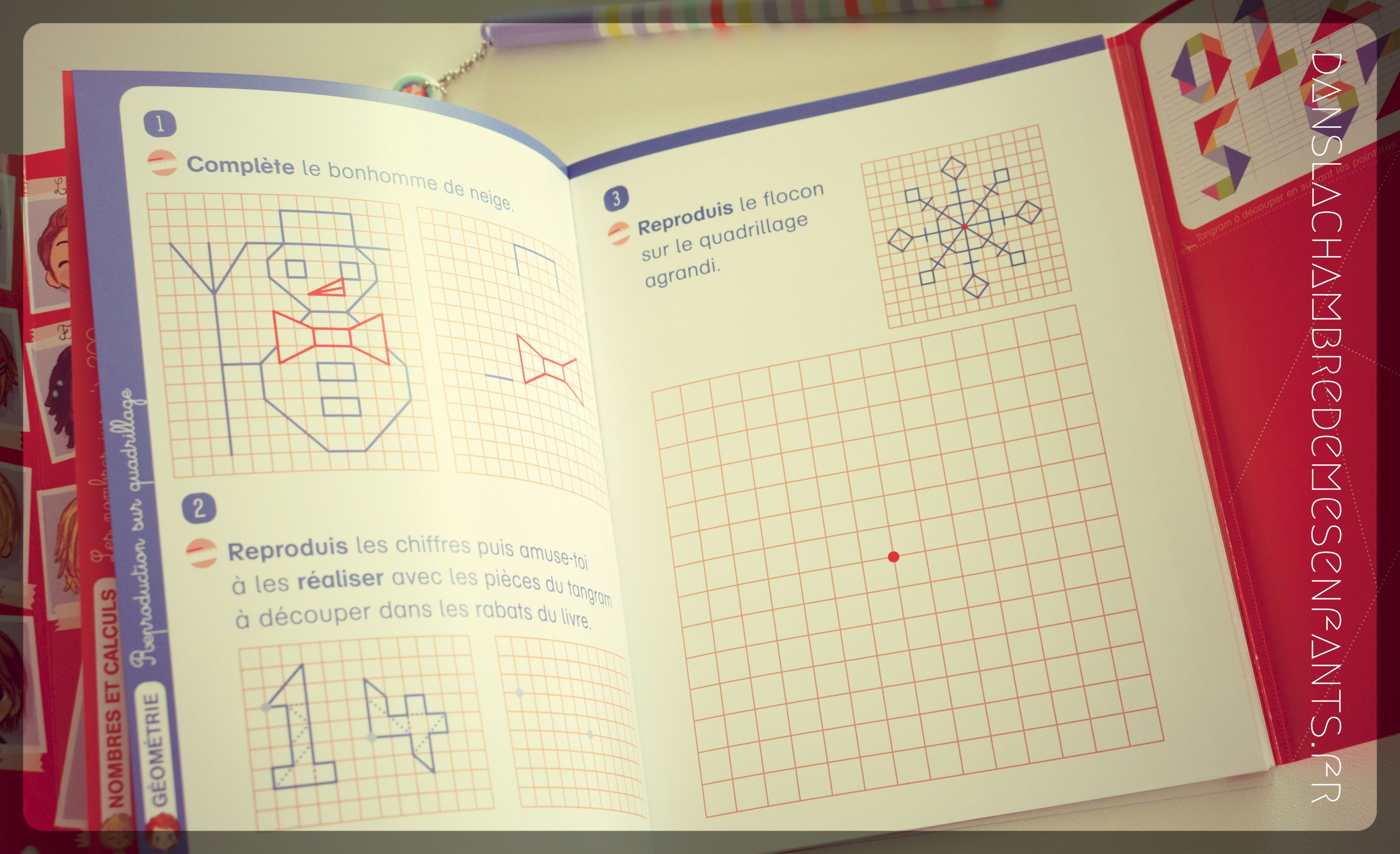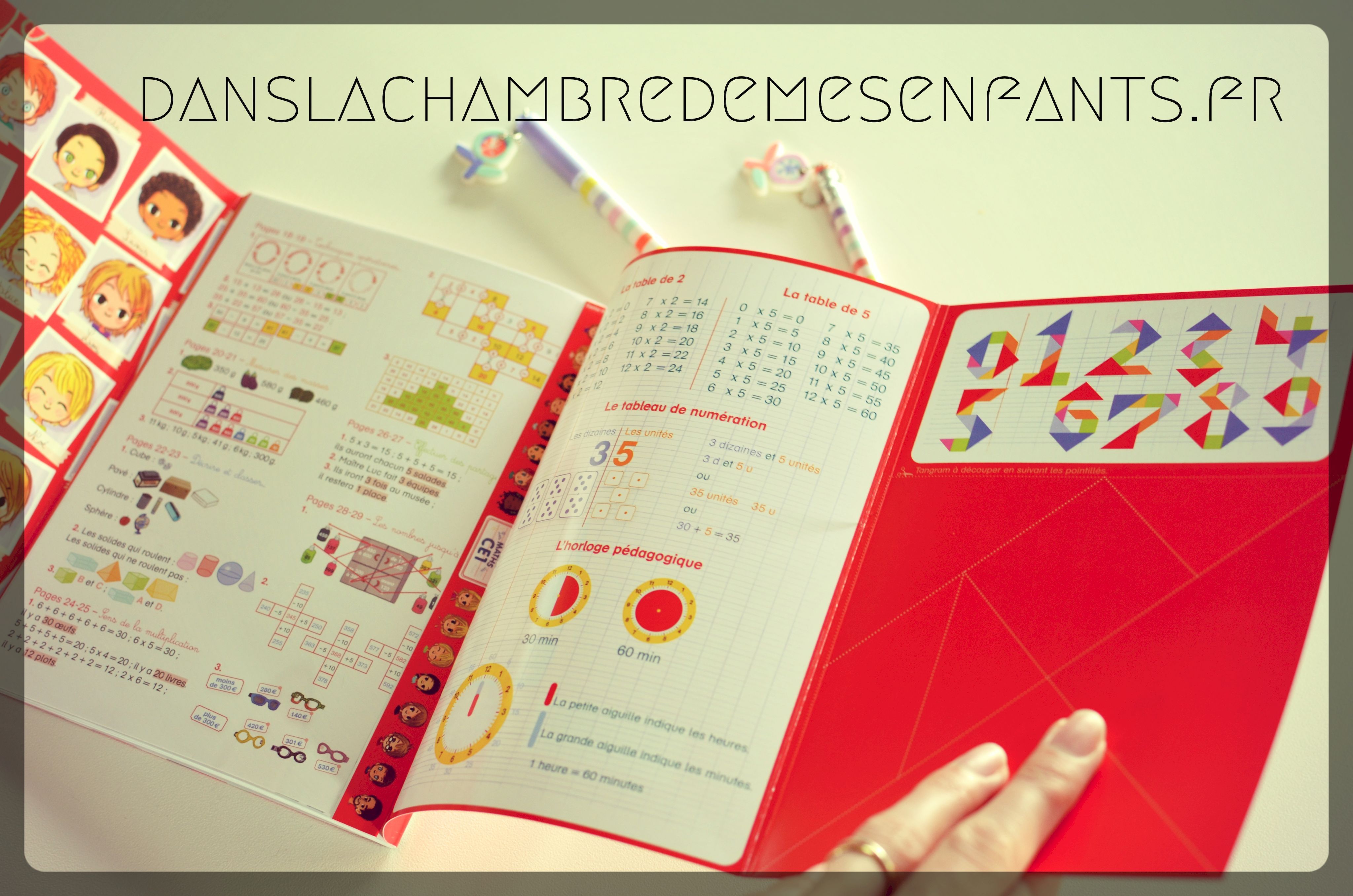 Les exercices sont brefs et diversifiés, tels que conçus par Marie-Pierre Laforgue, enseignante. Leur réalisation est confortée par un rabat comportant des repères (ex : table de 2, horloge pédagogique, tangram à découper et modèles de chiffres). Pour ne rien gâcher au côté pratique, une feuille mobile (plastifiée et transparente) est fournie pour s’entraîner à l’aide d’un feutre effaçable (non fourni). A cet égard, il est pertinent de prévoir des feutres à pointe fine et de plusieurs couleurs pour réaliser certains remplissages codifiés.