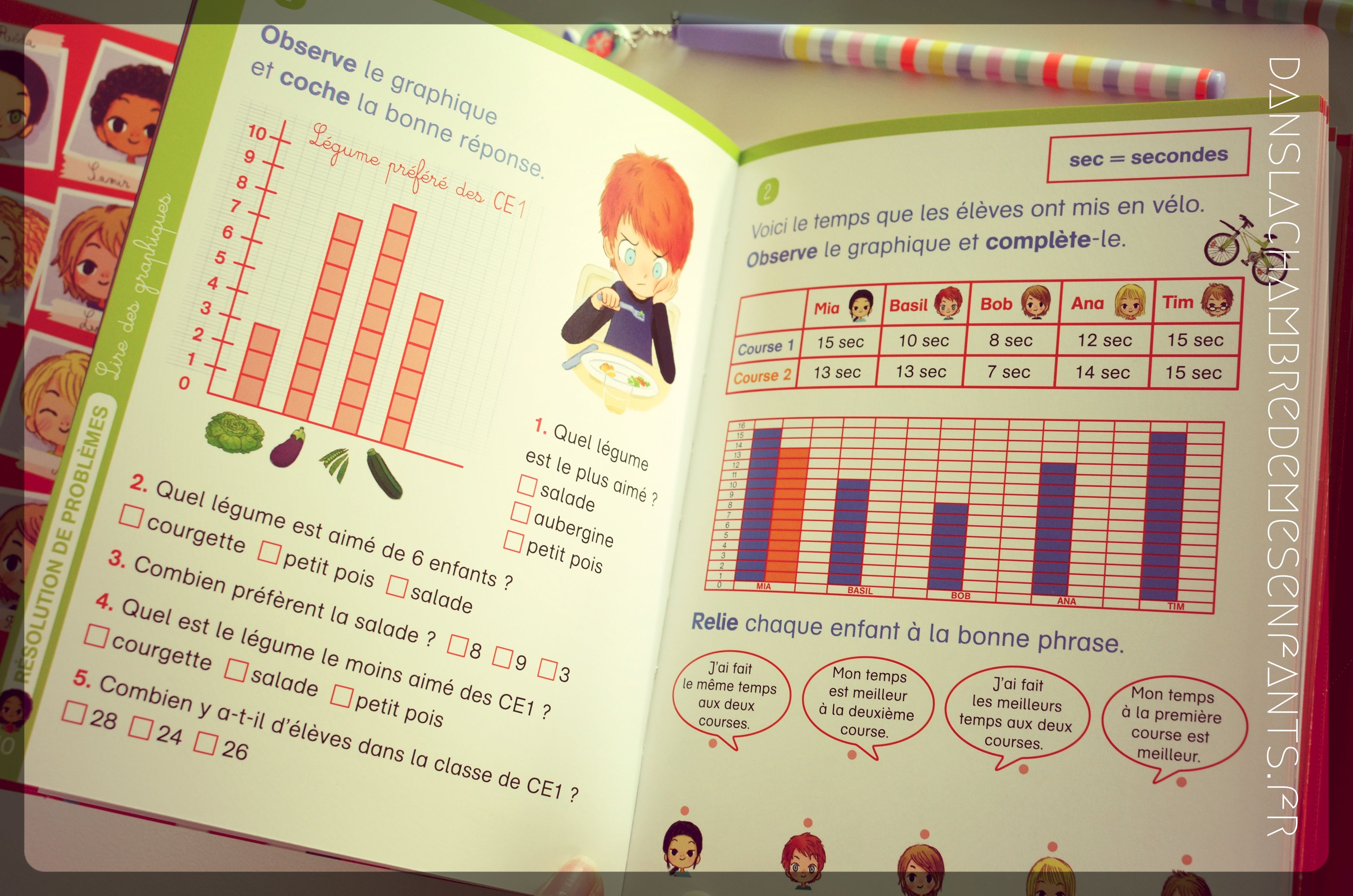 Je trouve ce format intéressant à l’exception de ses dimensions car, à cet âge, les enfants ont des difficultés à écrire petit, au surplus avec un feutre. Sur le fond, les consignes sont parfois trop brèves à mon goût pour permettre une compréhension aisée et les enfants peuvent donc avoir besoin de l’aide d’un adulte (ex : Des graphiques objets de problématiques alors que les légendes sont incomplètes).