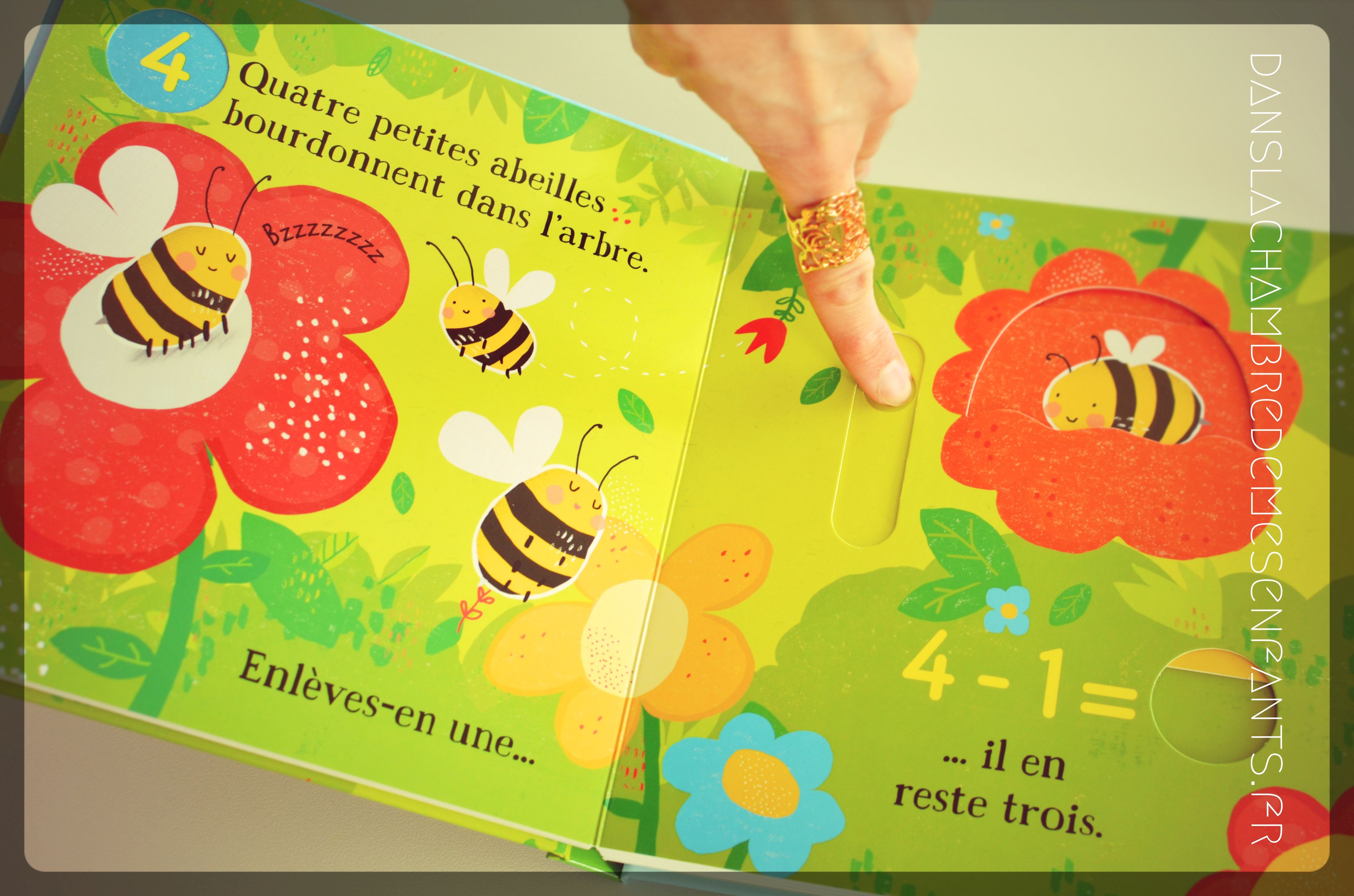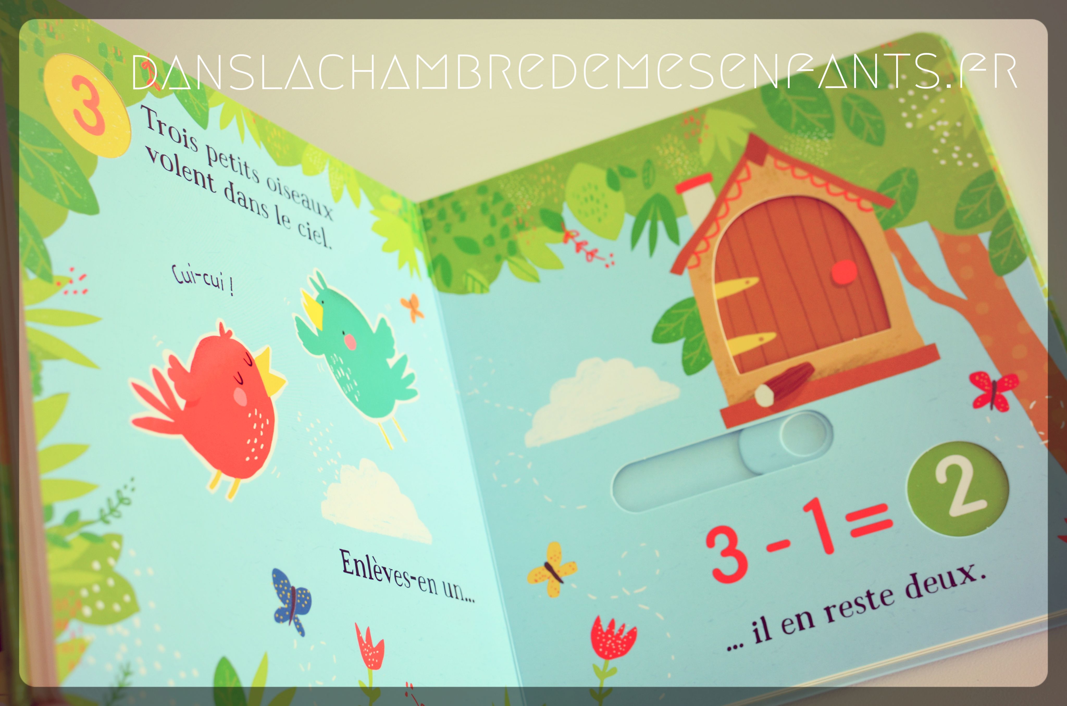 En effet, on retrouve la rondeur des illustrations et la simplicité des livres pour tout-petits avec une animation par double page (et dès la couverture) à actionner au doigt faisant apparaître le résultat du calcul (apparition ou disparition de la figure objet de la scène commentée – ex : « Cinq petits papillons volettent sur la rive. Enlèves-en un… il en reste quatre 5 -1 = …4 » [ndlr : faisant disparaître un papillon derrière un feuillage]). Les scènes évoluent de 1 à 5 et inversement selon le titre choisi.