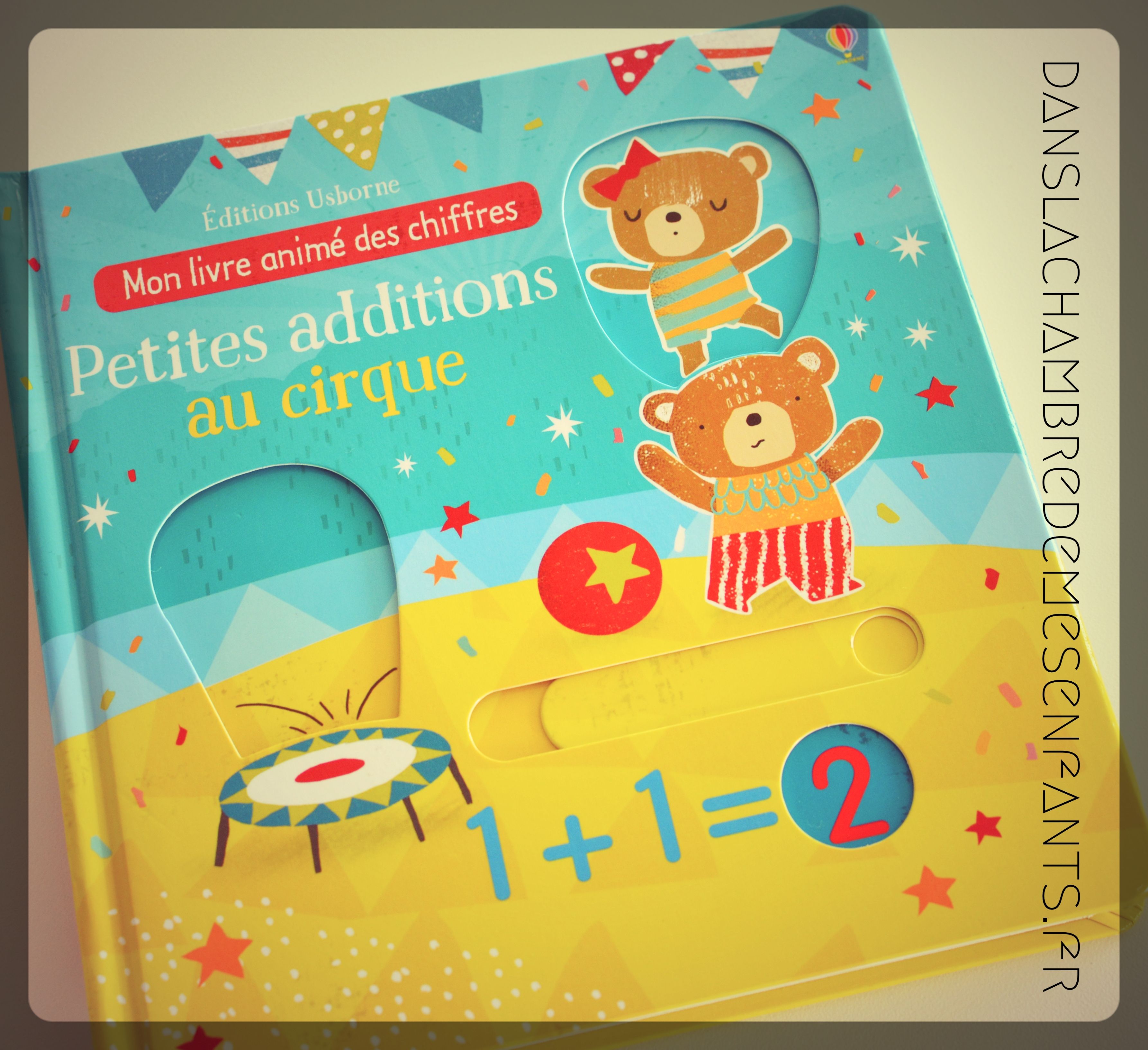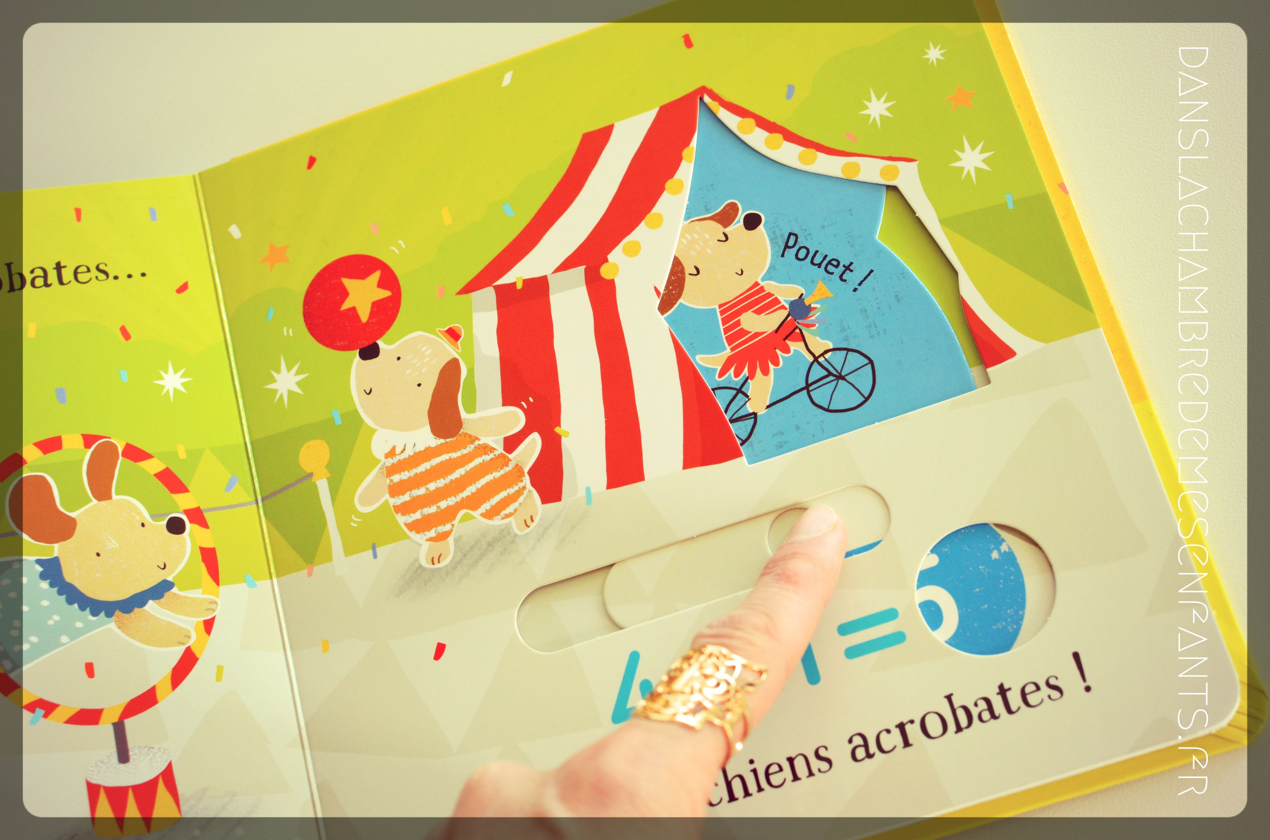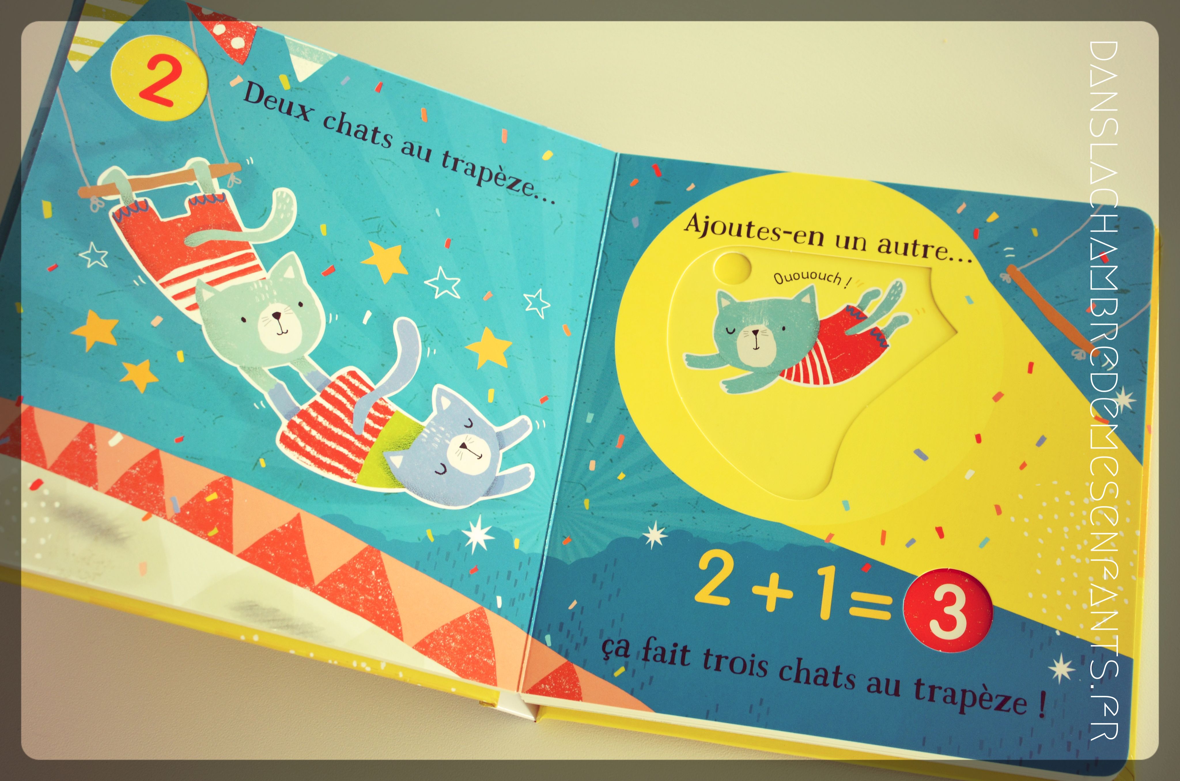 Les soustractions sont présentées « dans le jardin » avec des décors végétales ornés de papillons, d’abeilles, d’oiseaux… jusqu’au clair de lune. Quant aux additions, elles se font en compagnie de petits animaux (ours, chats, souris…) qui font le spectacle « au cirque » avec un numéro de trapézistes (2 enfin… 3 quand on le fait apparaître !), d’acrobates… et un final avec un magicien qui fait sortir 5 colombes (il y en avait déjà 5 !… on fait compter jusqu’à 10 cette fois-ci ! Mais oui, c’est un coup du lapin magicien !).