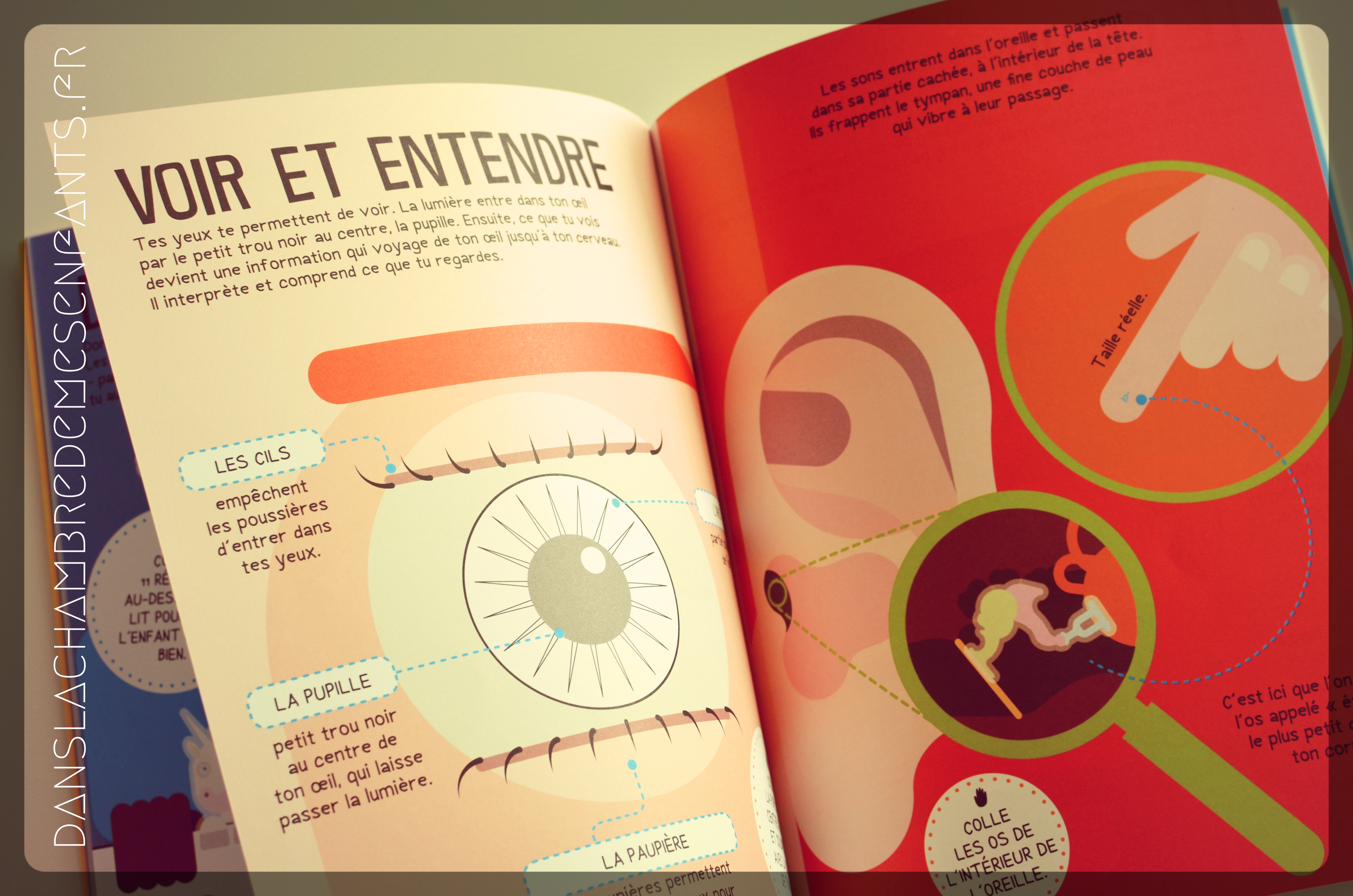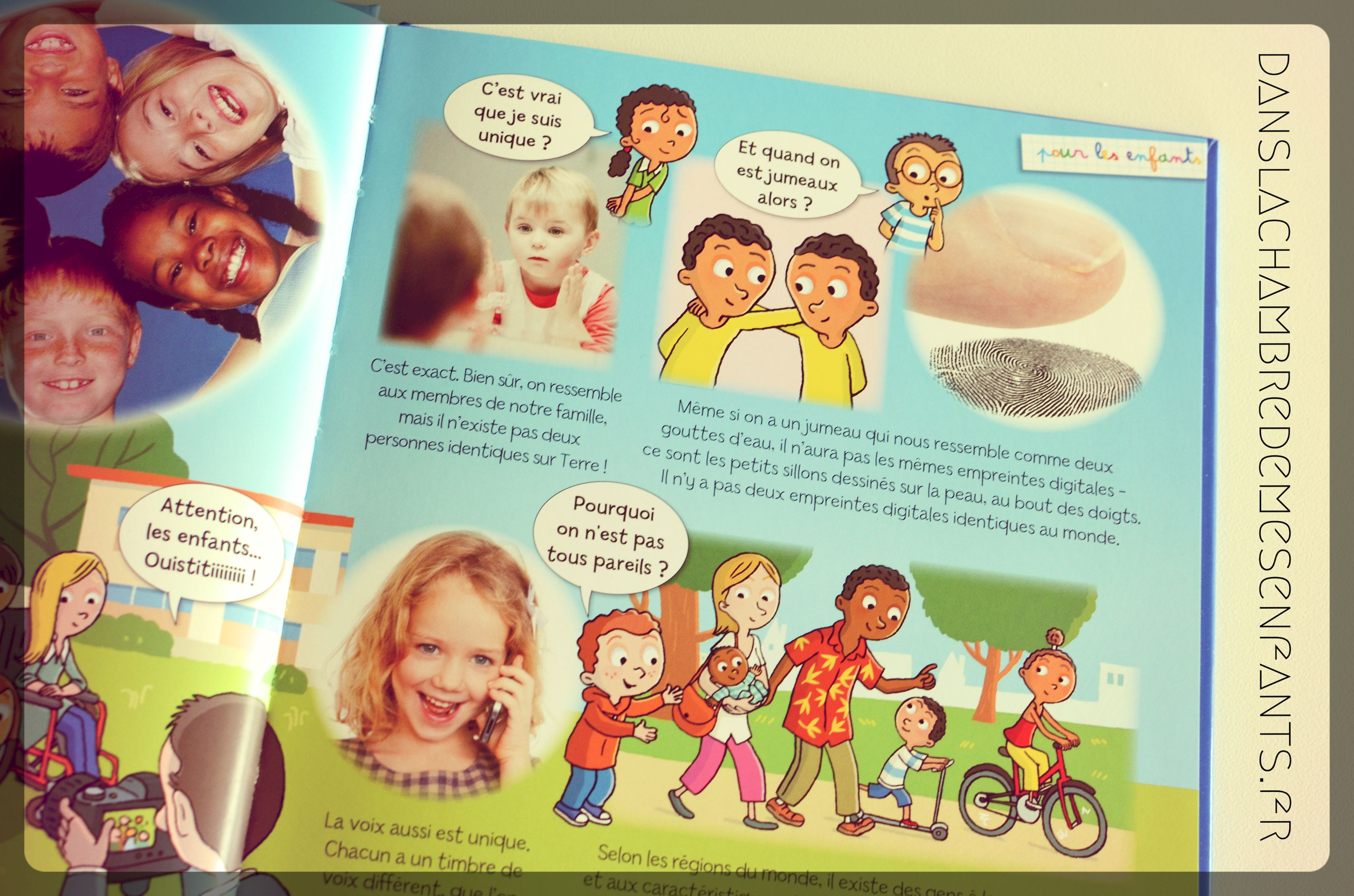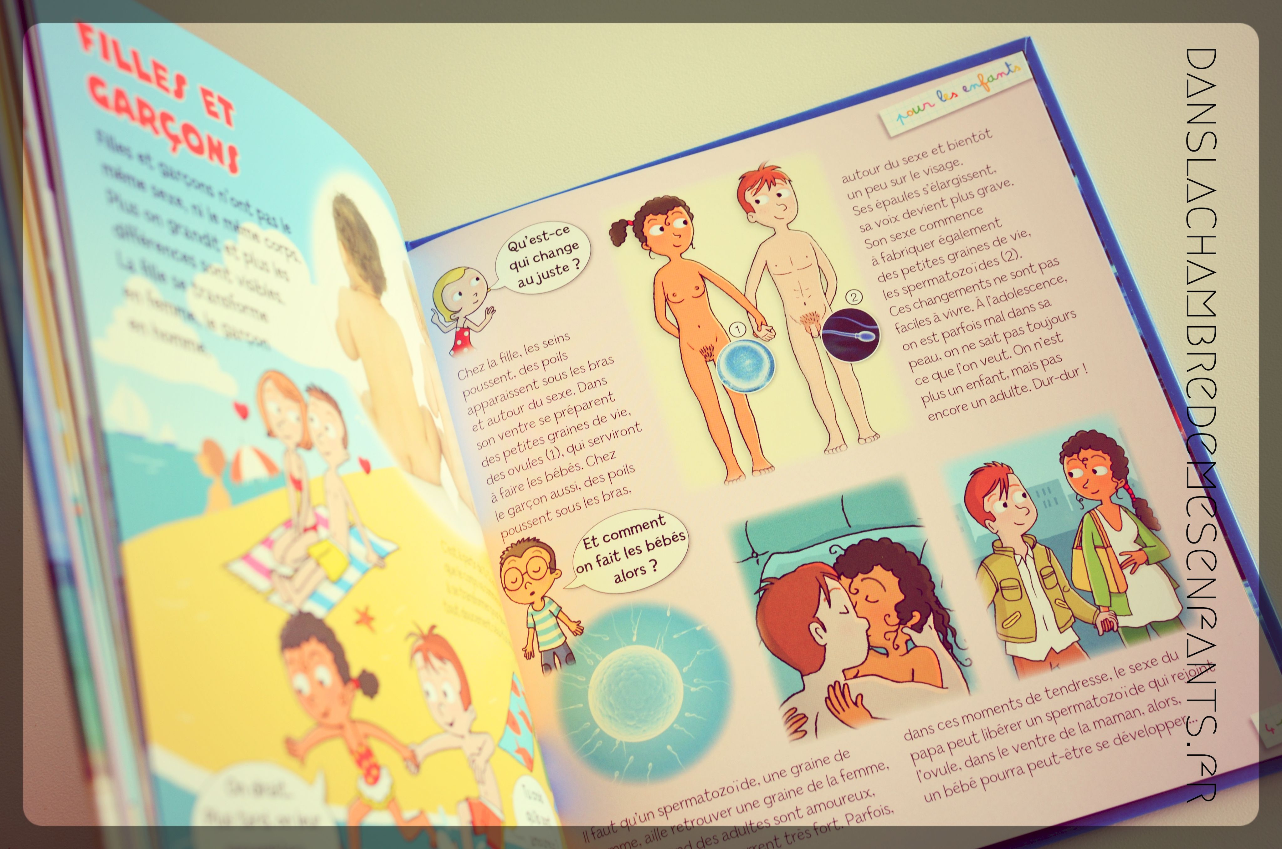 C’est un documentaire pertinent mais j’avoue trouver cette présentation trop encombrée (trop d’informations diverses [explications, dessin, bulles, annotations…]) ce qui complique, à mon avis, l’approche. Il fouille le sujet plus comme le ferait un adulte pour le côté (presque) exhaustif car il va au-delà du questionnement des enfants (ex : système nerveux), ce qui est tout de même intéressant. Mon fils l’a parcouru mais il n’a pas tenu jusqu’au bout et je m’y suis attardée avec lui plus tard sur des sujets sélectionnés. En effet, le passage consacré à la conception et la naissance des bébés est assez précis mais je trouve, personnellement, mon fils un peu jeune pour en savoir autant. C’est un point de vue qui n’appartient qu’à moi… maman poule ou sujet un peu gênant encore pour moi (il n’a que 6 ans…) peu importe.