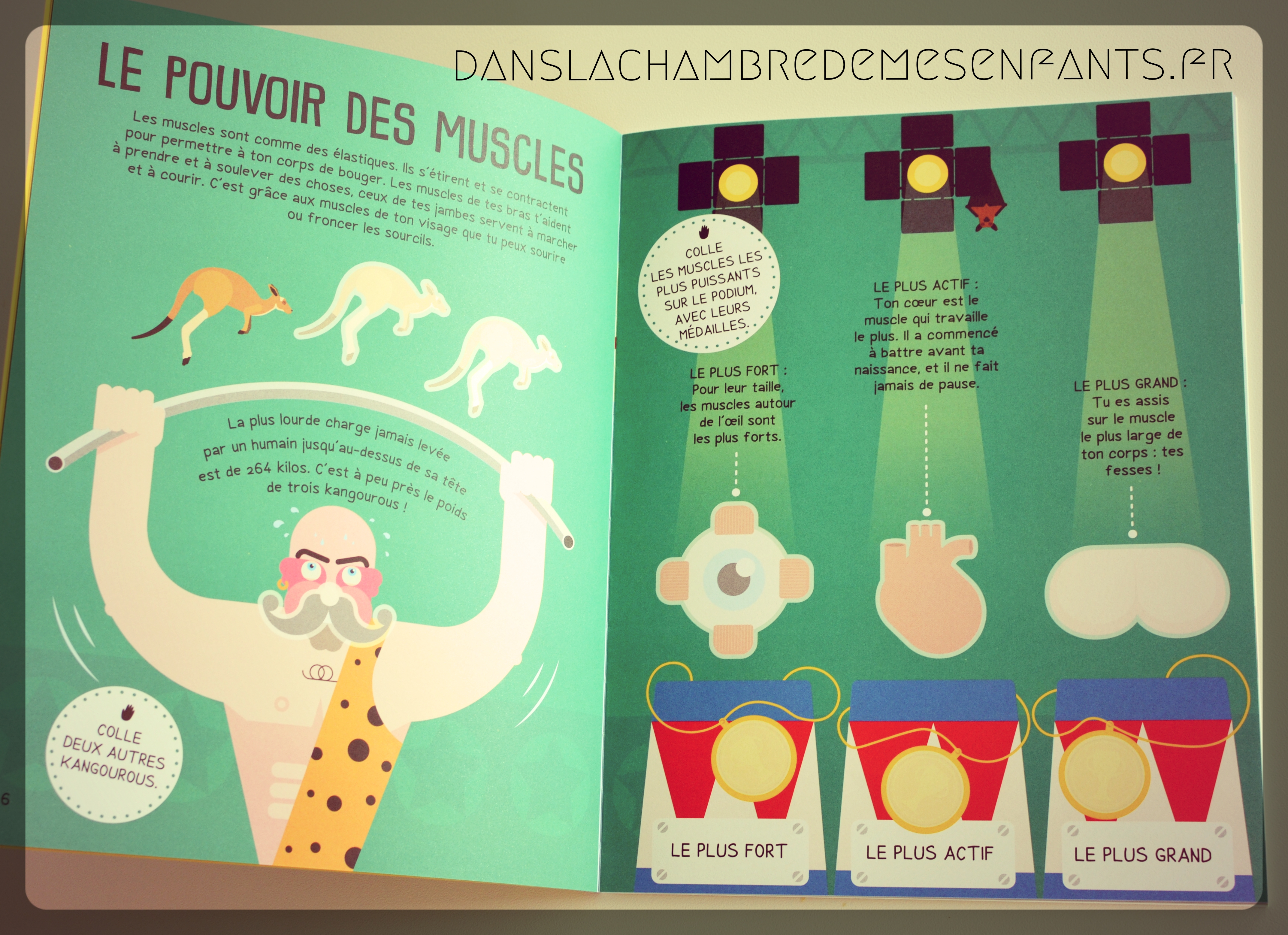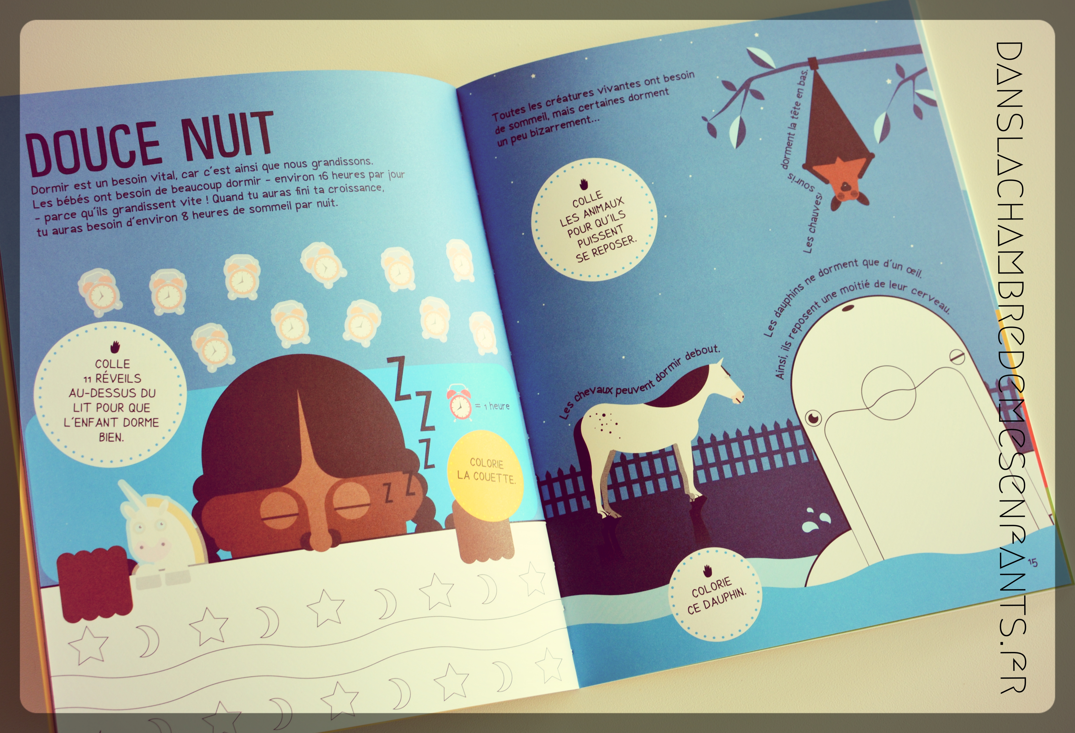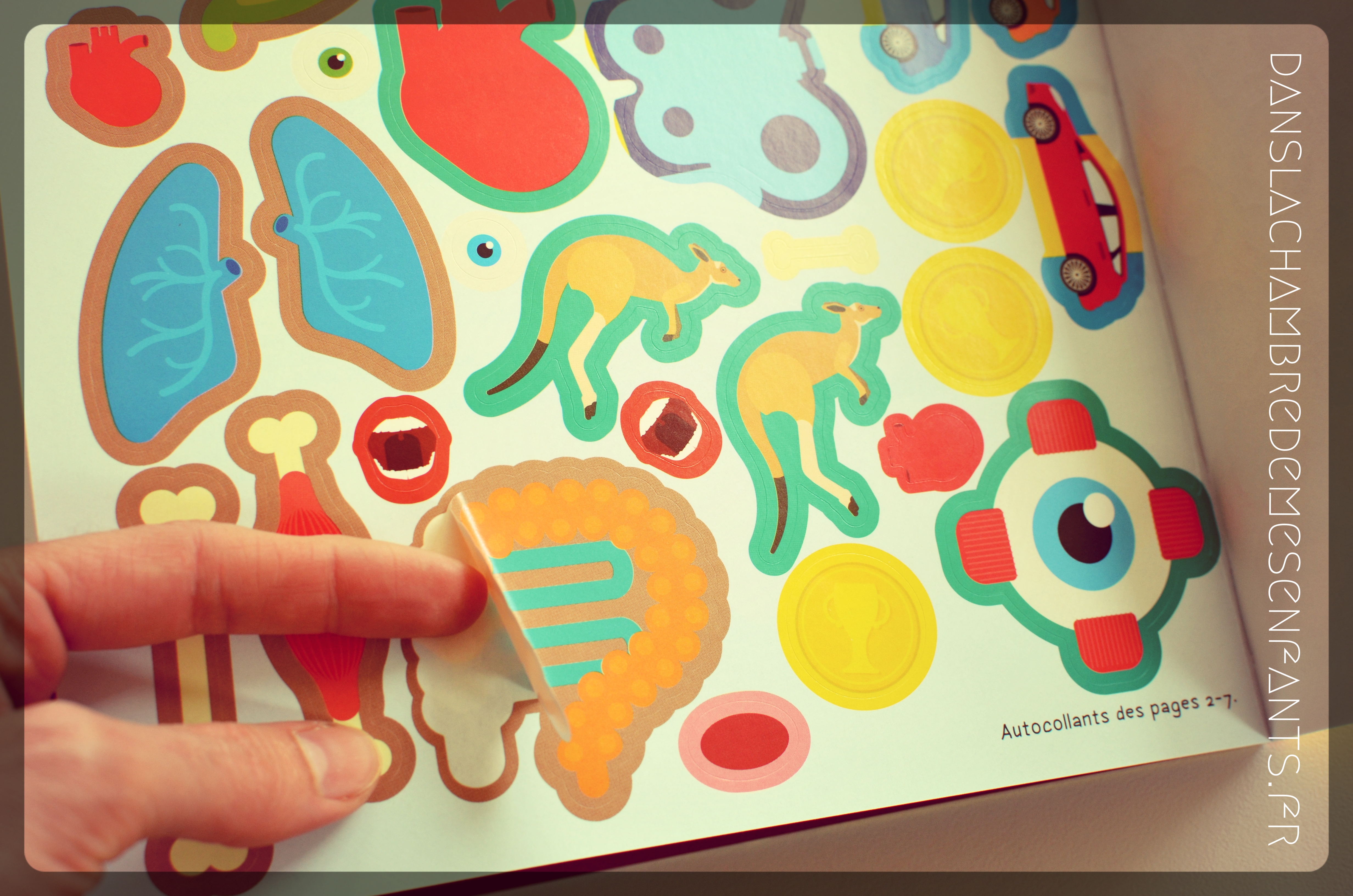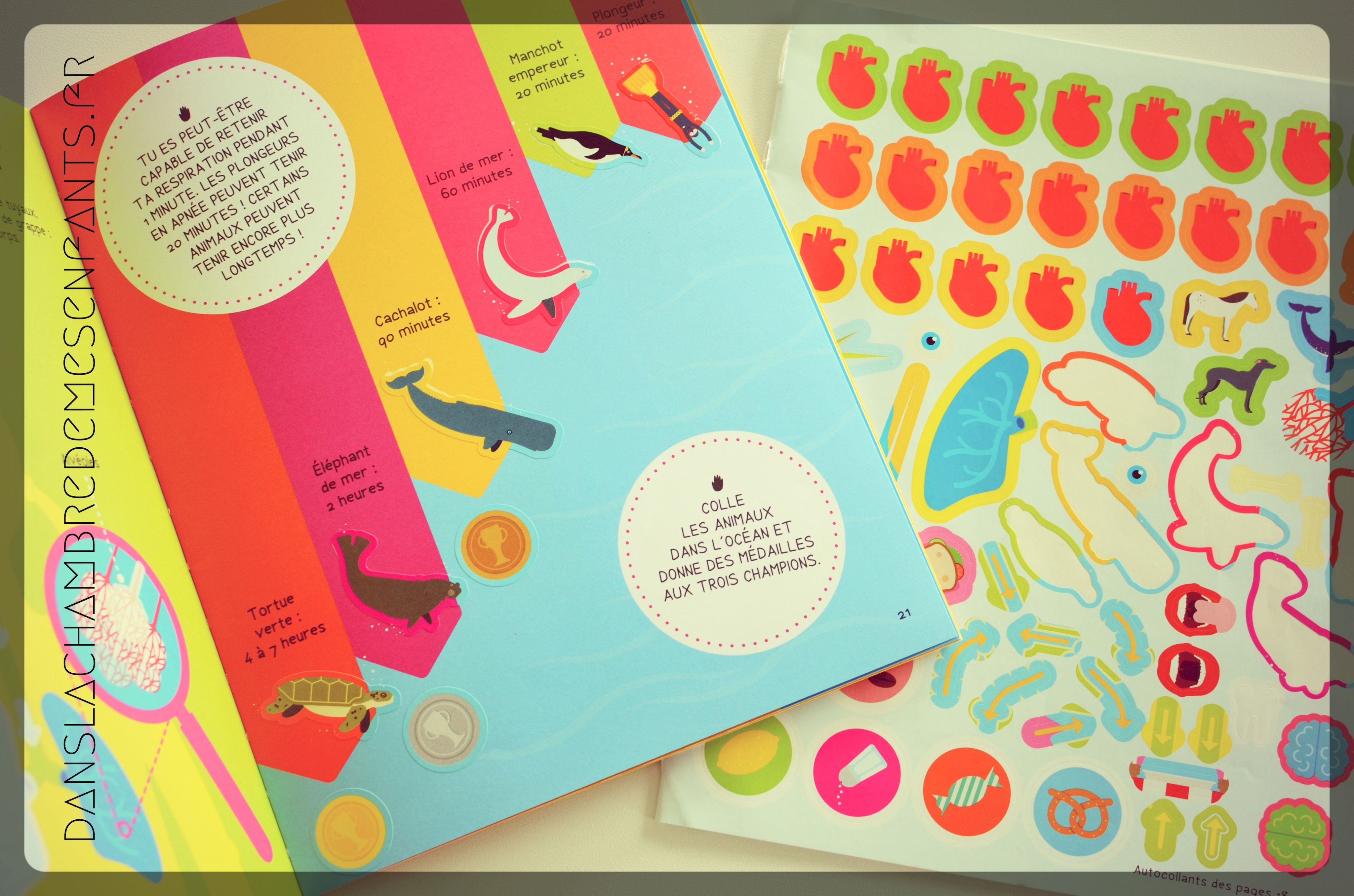 L’avis des enfants : Alex l’a beaucoup aimé et il y est revenu souvent non seulement pour le lire à sa façon (dans le désordre) mais aussi pour le compléter à sa guise sans passer trop de temps (c’était top en salle d’attente l’autre jour !). Il a particulièrement aimé les informations assez étonnantes qui illustrent les explications (ex : « Un petit insecte, le Cercopoidea, fait des sauts de 70 cm. C’est comme si tu pouvais sauter par-dessus 2 tours de Big Ben »). Les stickers ont été un vrai plus pour conserver son attention mais le coloriage beaucoup moins (c’est donc juste une question d’affinité).