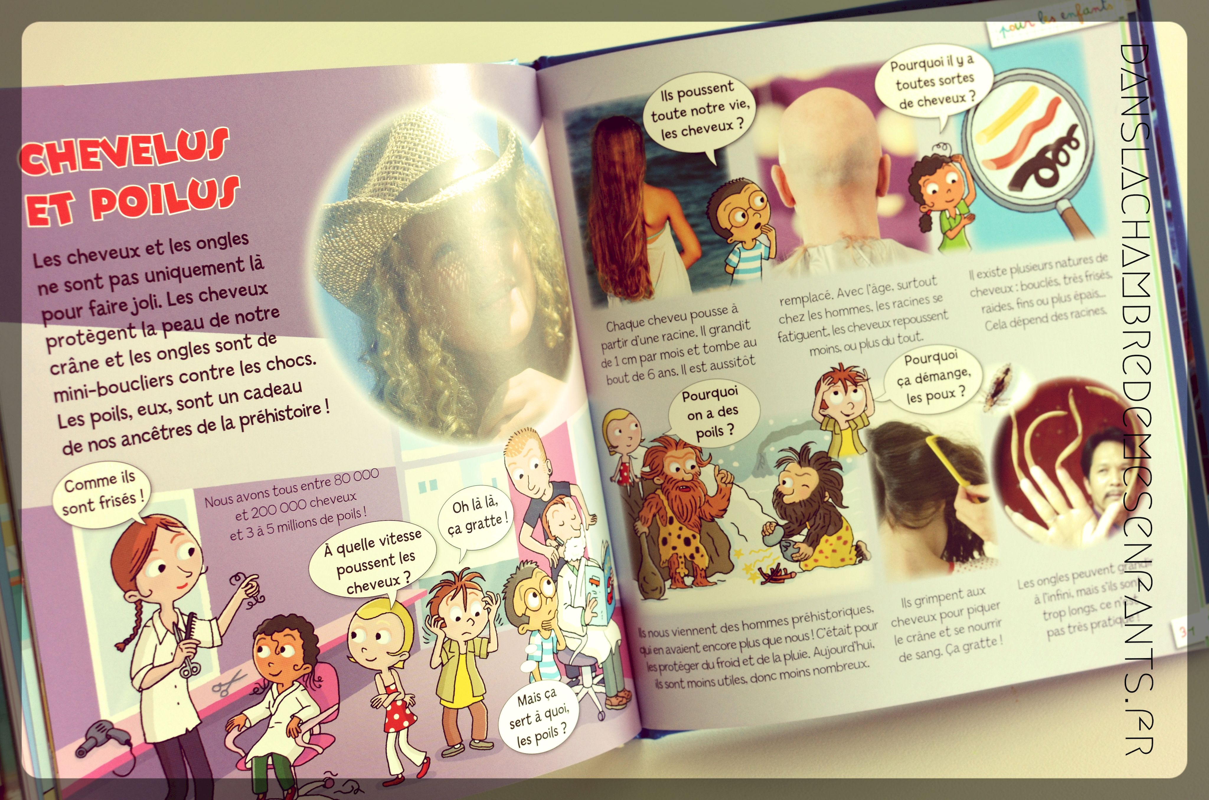 L’avis des enfants : Alex, 6 ans, adore les documentaires mais il aime surtout les consulter en 1er tout seul. Il commence par le feuilleter et il apprécie de pouvoir choisir l’ordre de lecture (commençant par ses sujets favoris). Cet ouvrage lui a paru trop fourni et il n’a donc pas tenu jusqu’au bout. Certains sujets l’intéresseront sûrement selon sa propre actualité (ex : « Chevelus et poilus ») et il restera ainsi pertinent en grandissant.