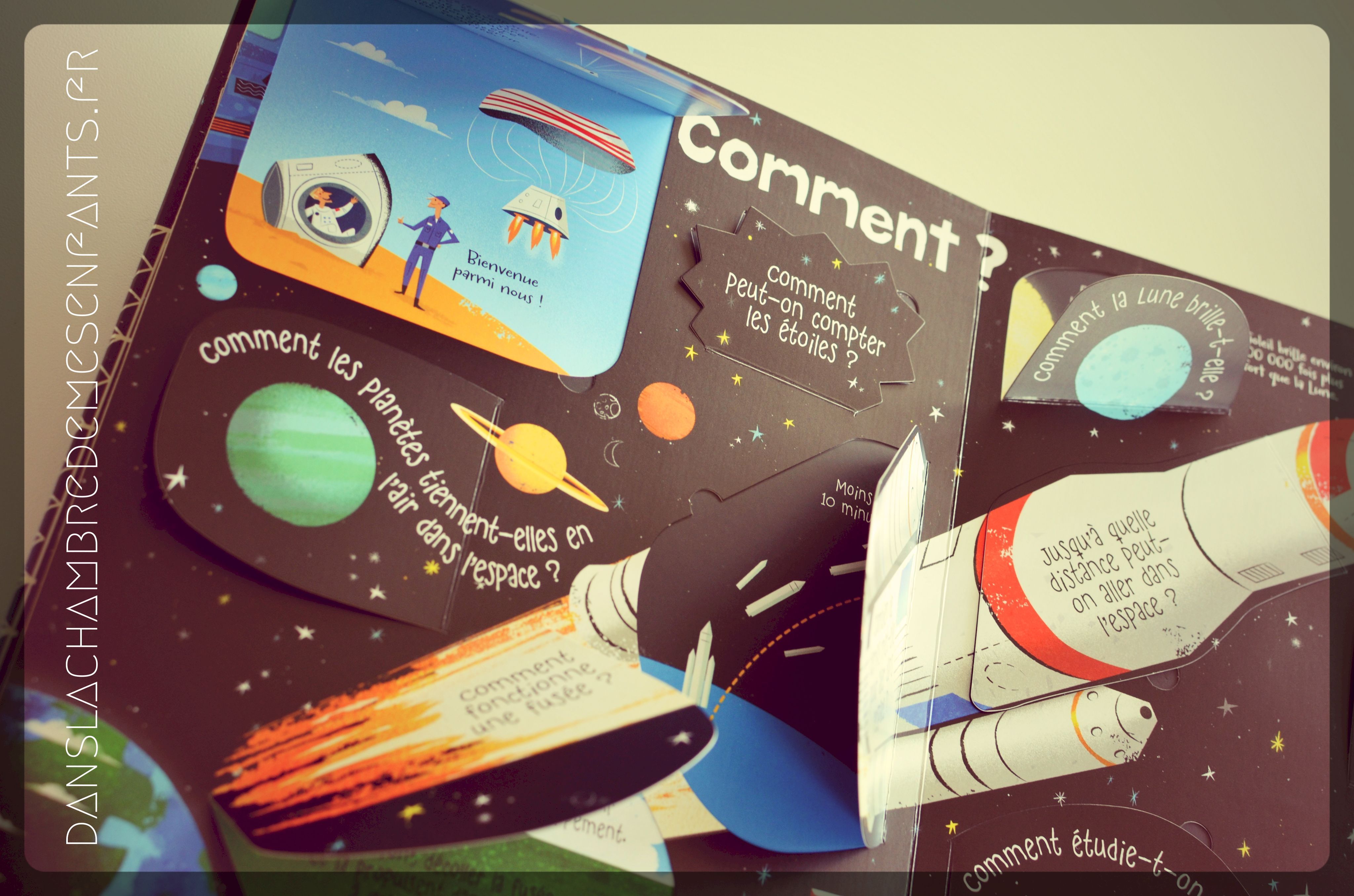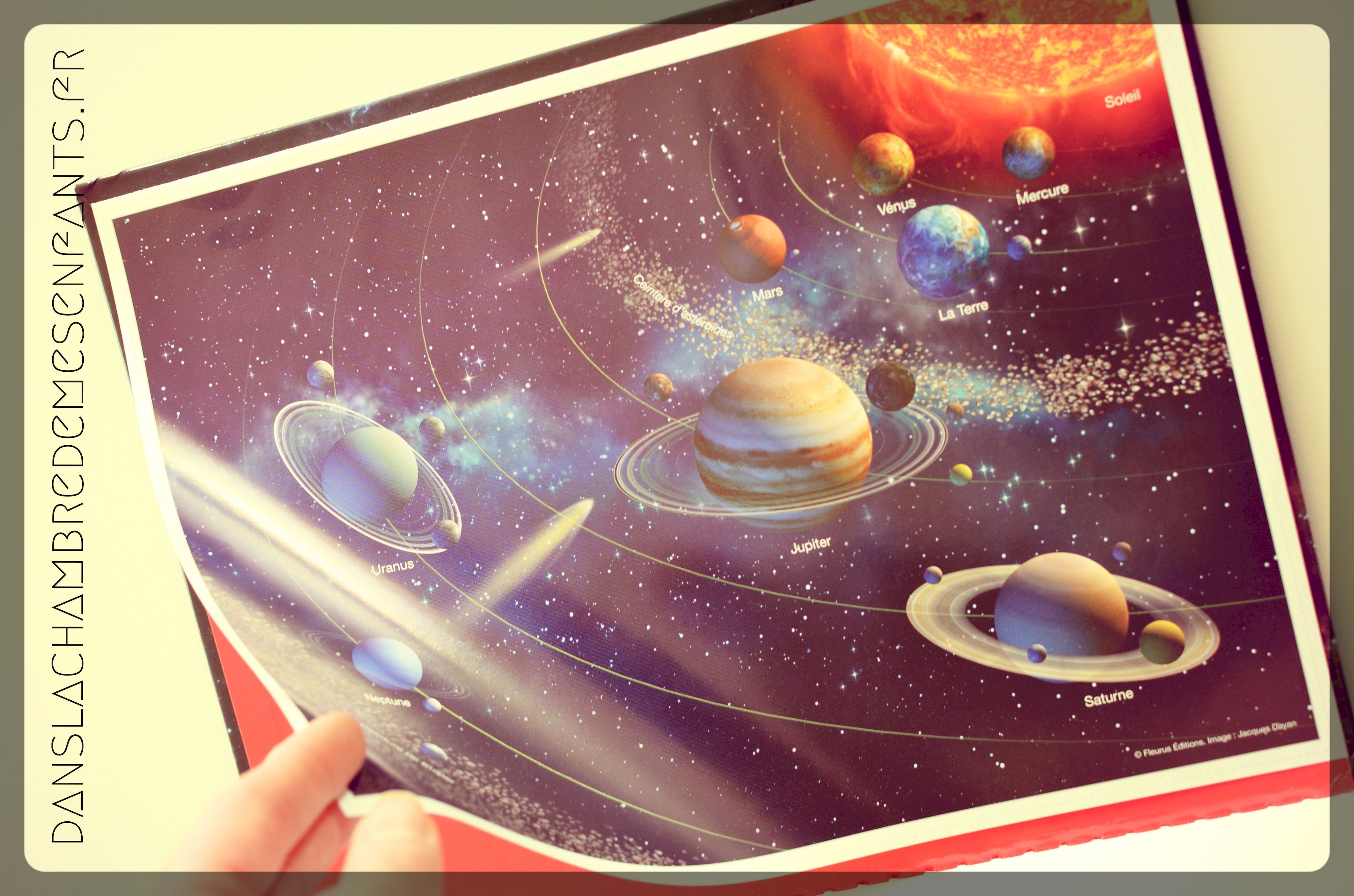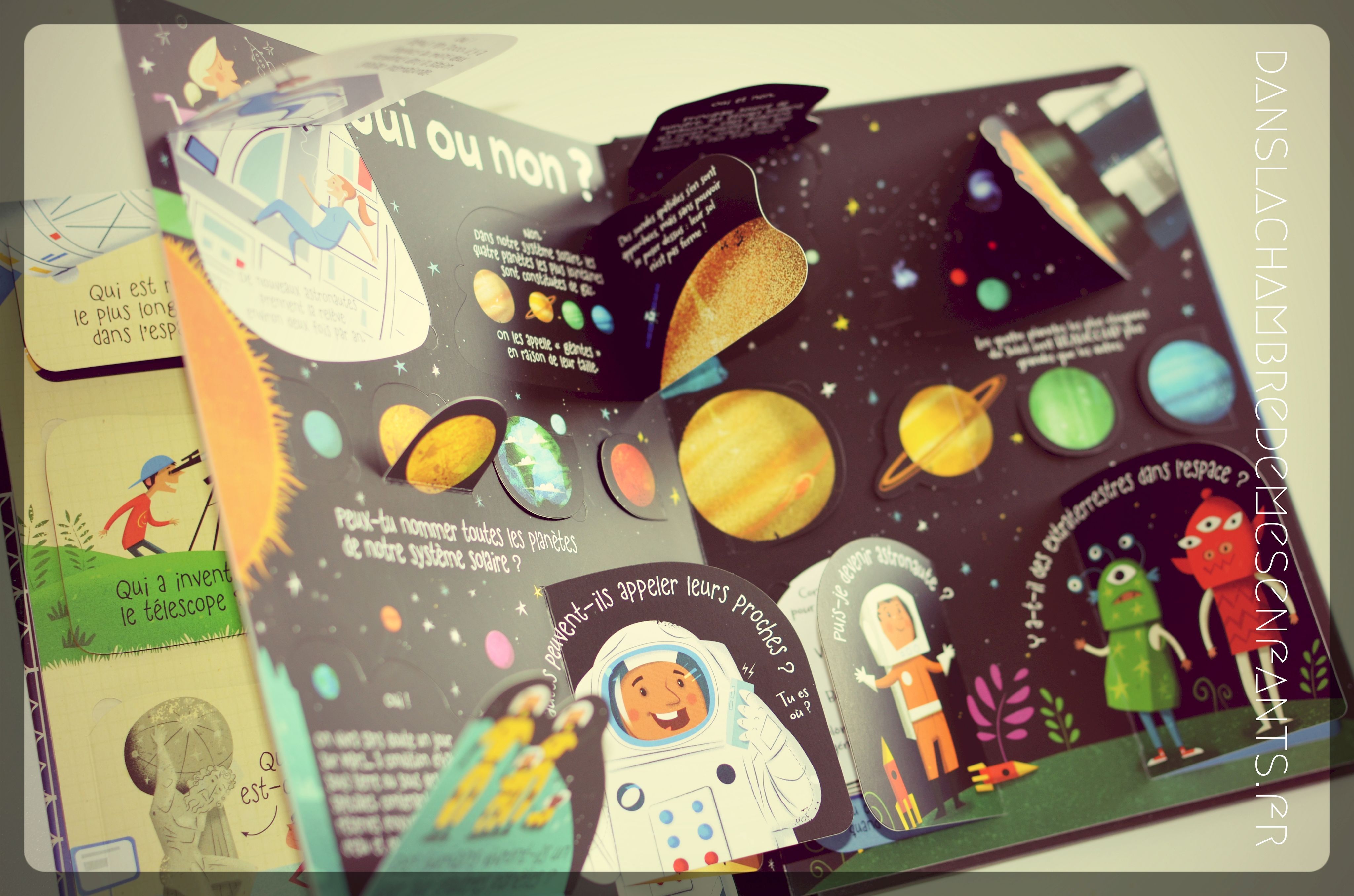 L’avis des enfants : Alex est tellement piqué par le sujet en ce moment qu’il a demandé à visiter La Cité de l’Espace, revenant avec une fusée sous le bras. Mais voilà, il en veut encore plus et, dans ce livre, il a trouvé ce qu’il cherchait. Il a découpé les pages (planètes et système solaire) qu’il garde dans sa table de nuit pour les avoir sous les yeux quand il regarde ses livres sur l’Espace avant de dormir (je l’ai même surpris après l’heure à la lumière de sa veilleuse !) et il a choisi de présenter cet ouvrage à sa classe. En résumé : « Maman, c’est vraiment mon préféré celui-là, je l’adore ! ».