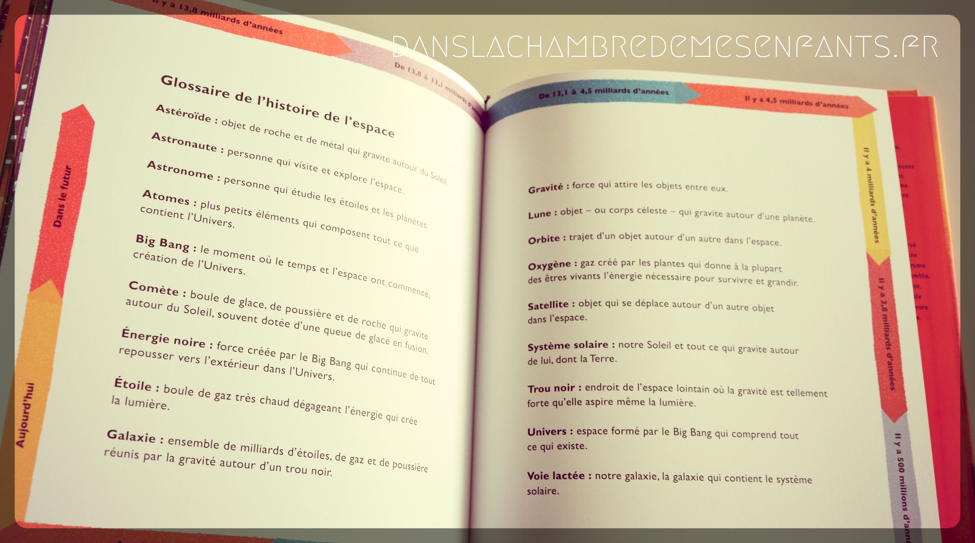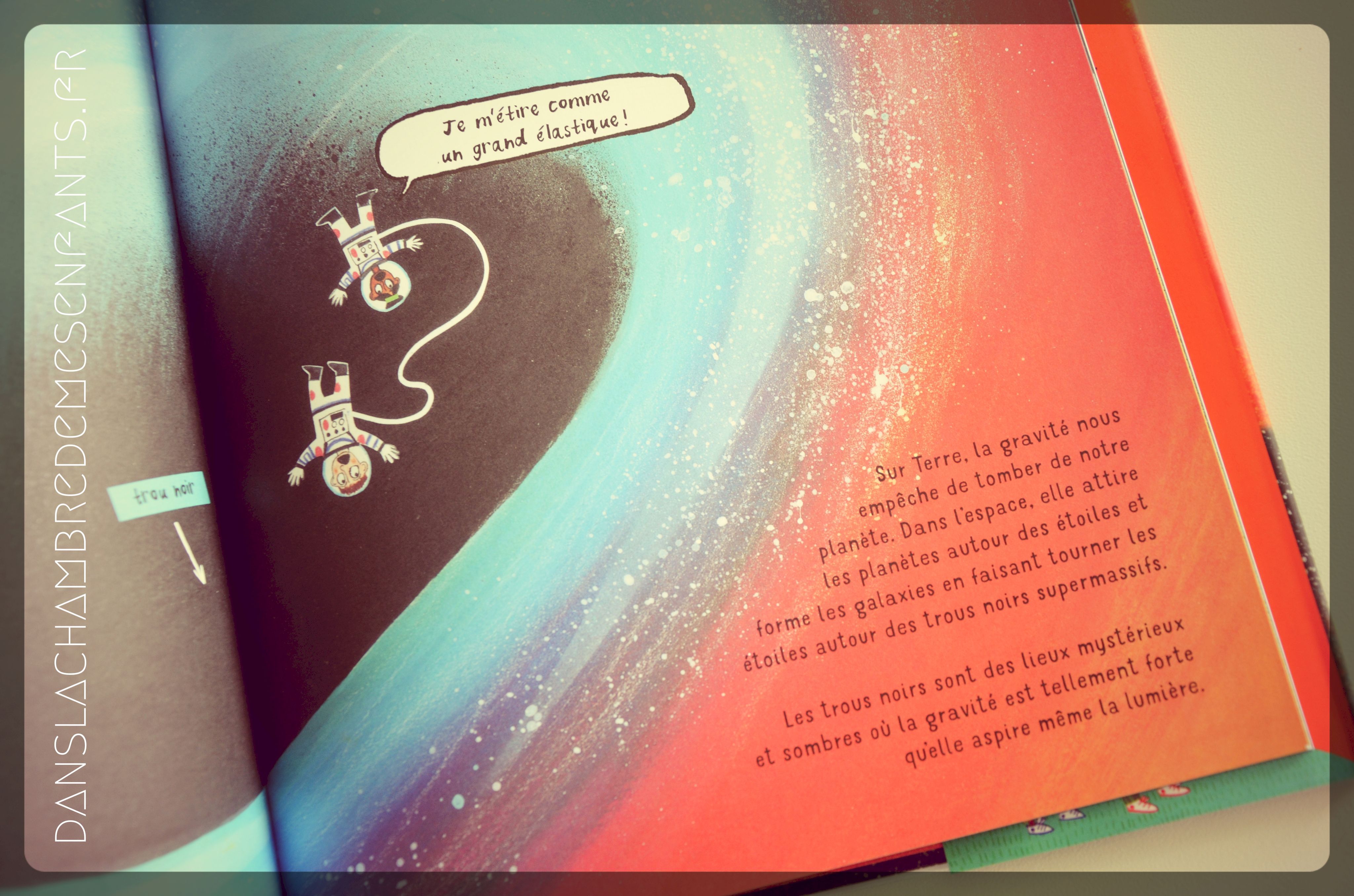 J’ai sélectionné cet ouvrage car nous avions eu un vrai coup de cœur pour le 1er titre sur la vie sur Terre. Sous la même forme, on retrouve ici un sujet tout aussi prenant qui retrace l’histoire de l’univers de façon originale à travers de grandes illustrations enfantines et assez précises pour une bonne compréhension. Chaque scène est dédiée à un épisode primordial de la construction de l’univers, situé dans le temps en bas de page (ex : « Il y a 13,8 milliards d’années […] Avant le Big Bang, il n’y avait rien du tout. ») avec des personnages qui s’expriment au moyen de bulles pour créer une double scène.