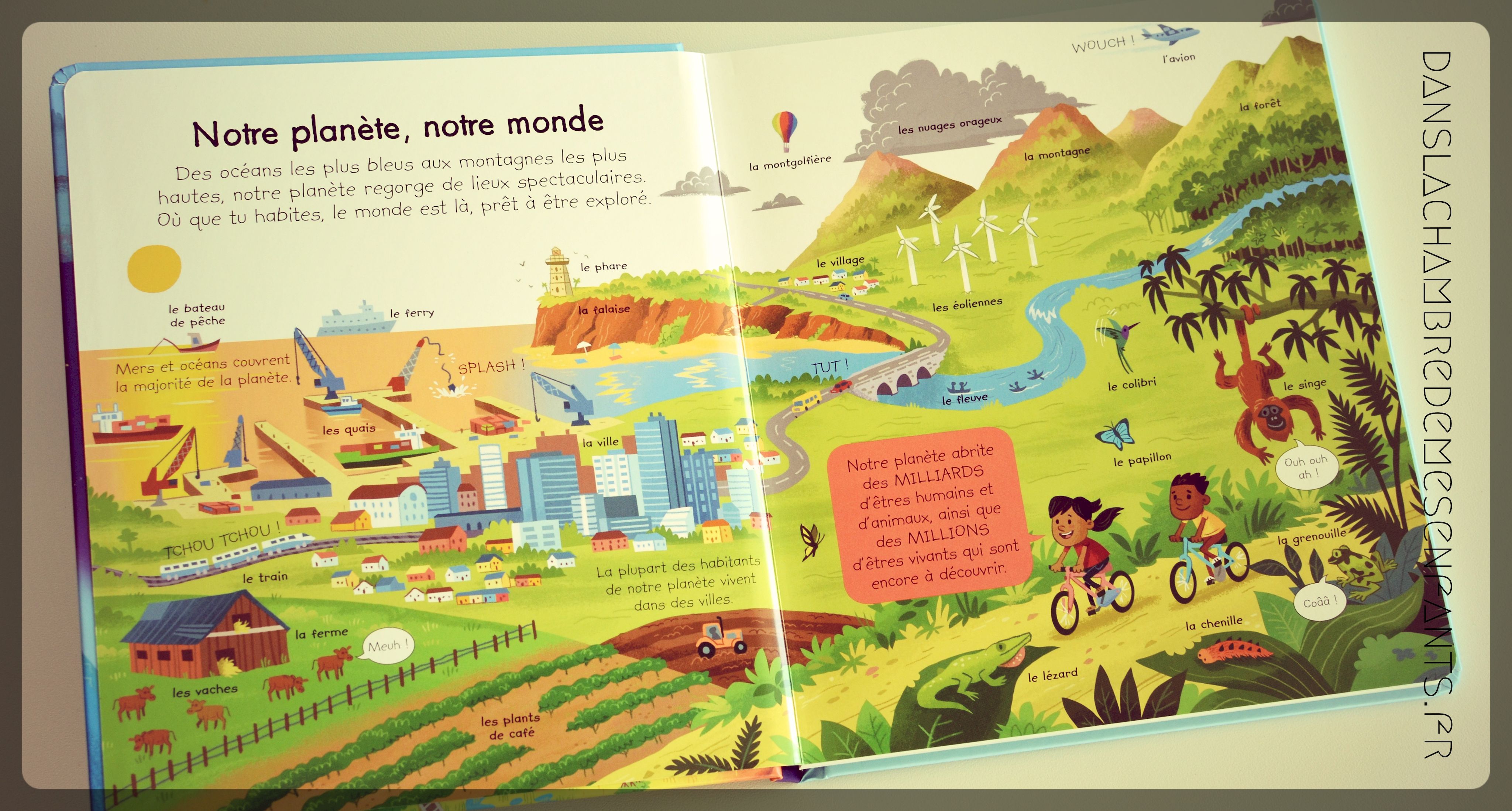On retrouve cette collection pour un titre dédié à la planète bleue. Il s’agit d’un documentaire pour les plus jeunes, dès 3 ans voire 4 ans, qui met en avant des illustrations douces et colorées, commentées par de nombreuses brèves explications et annotations sous les titres suivants :