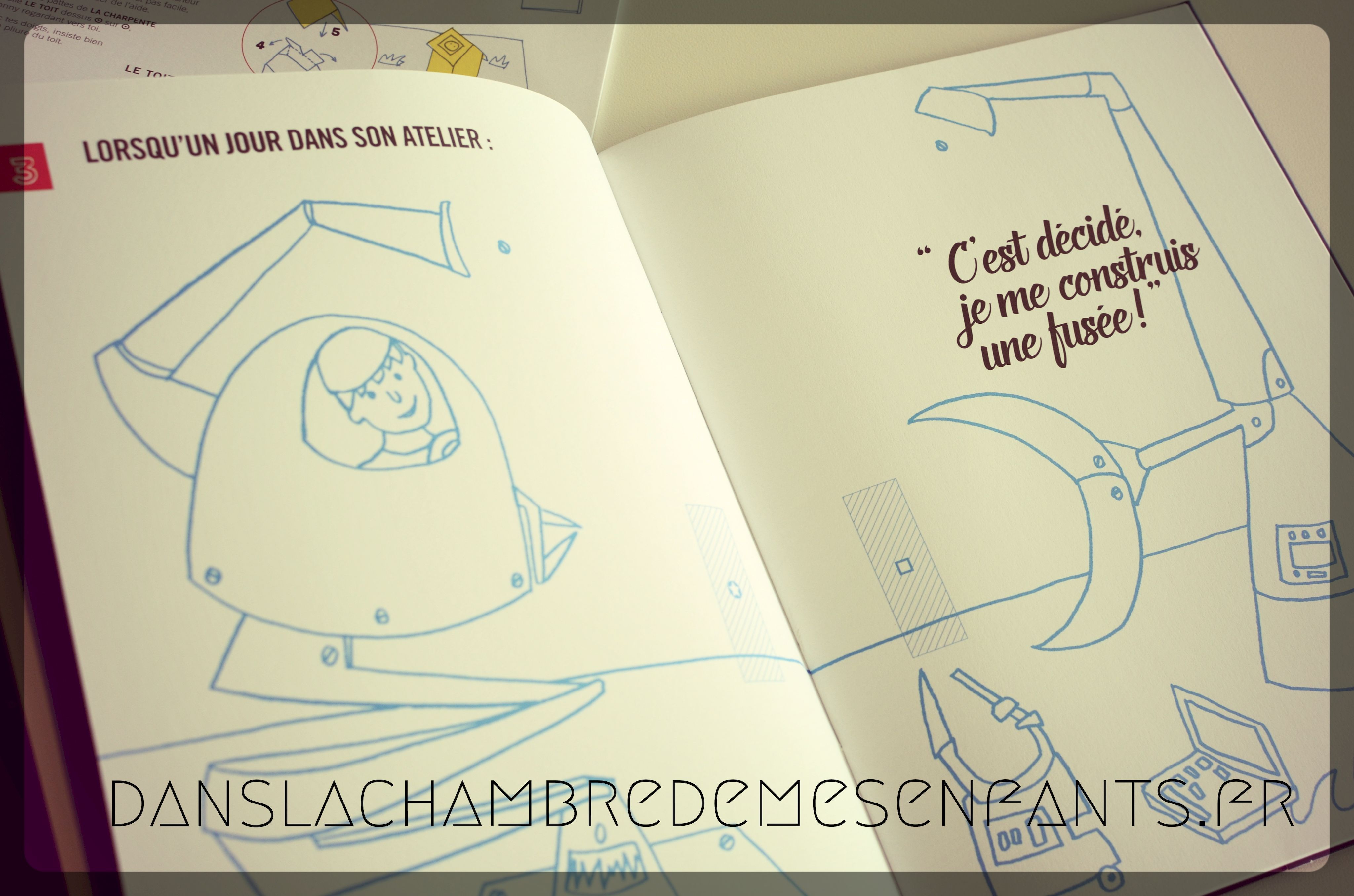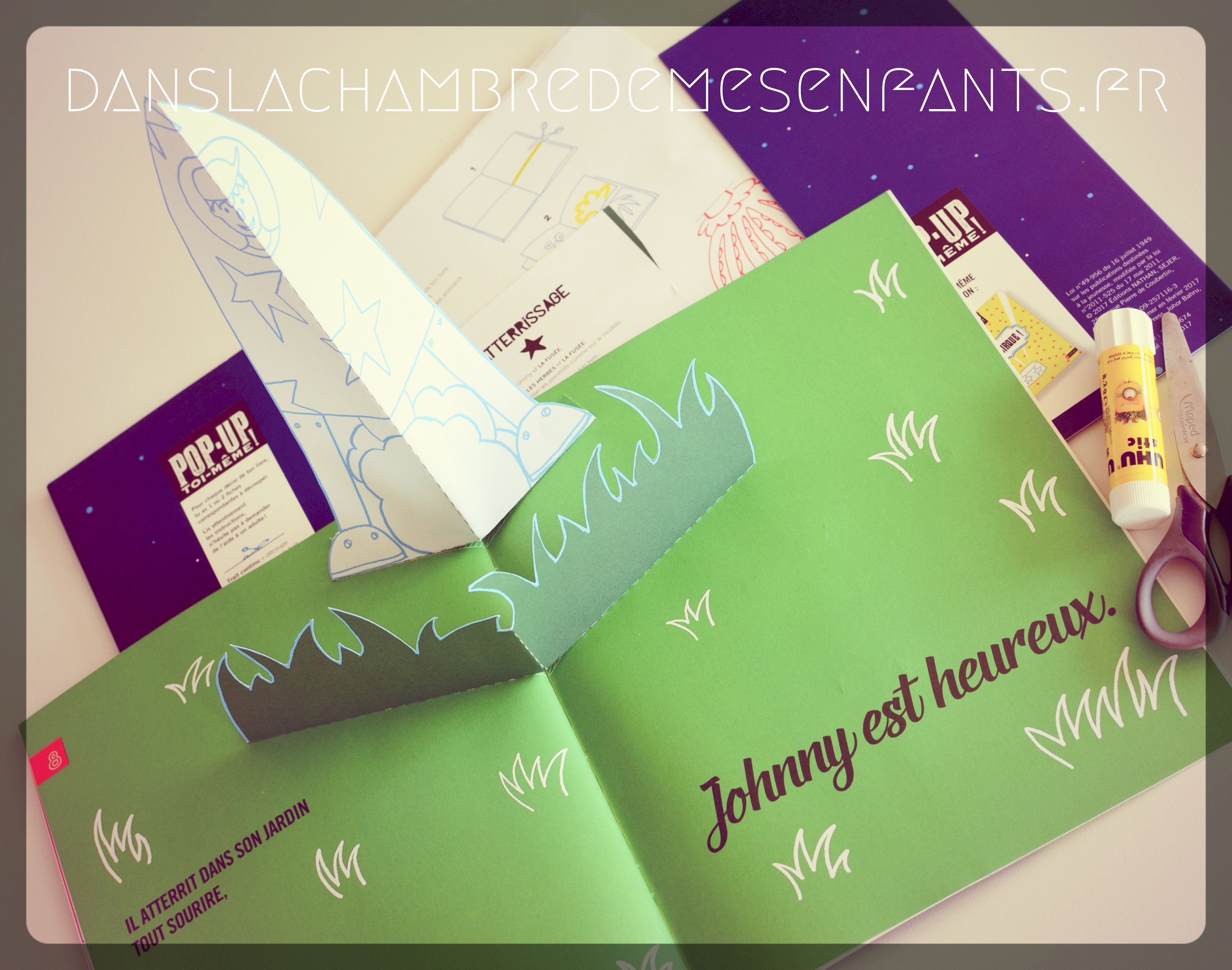 Le livre pop-up raconte l’histoire de Johnny, un garçon qui réalise son rêve d’Espace en construisant une fusée. L’enfant est invité à y inscrire son nom, à dessiner son portrait (et un peu plus), à colorier des pages et, surtout, à découper et coller des éléments à mettre en relief. Le système est très simplifié et on met en œuvre efficacement les éléments pop-up. J’avoue que les lignes de pliage sont parfois un peu décalées (recto sur verso) mais cela est sans grande incidence.