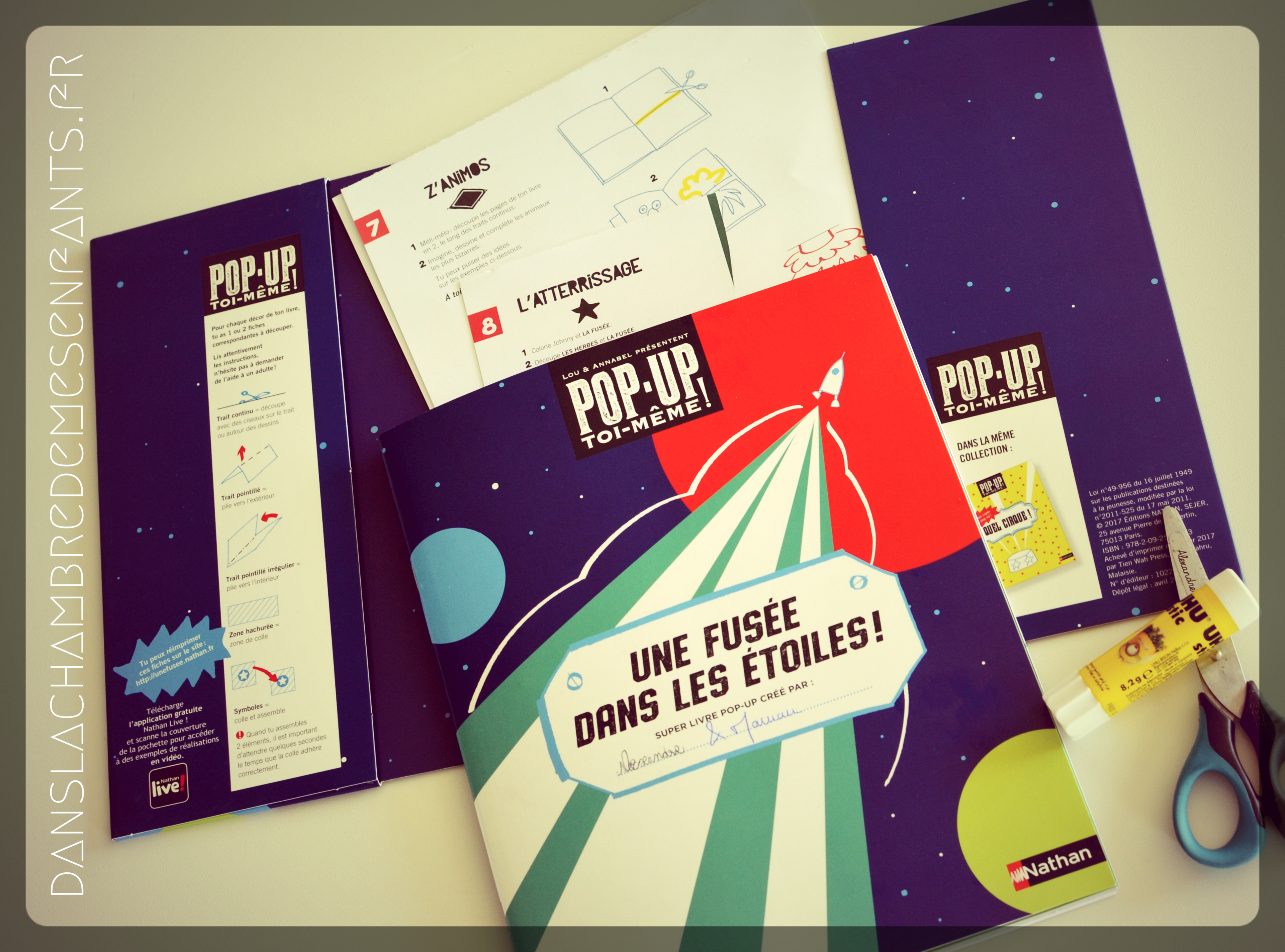 Des vidéos bonus sont proposées gratuitement via l’application Nathan (non compatible avec Microsoft) que je n’ai pas pu vérifier. Pour réaliser l’atelier, il est nécessaire de s’équiper d’une paire de ciseaux, d’un bâton de colle, de feutres/crayons de couleur et de ruban adhésif.
