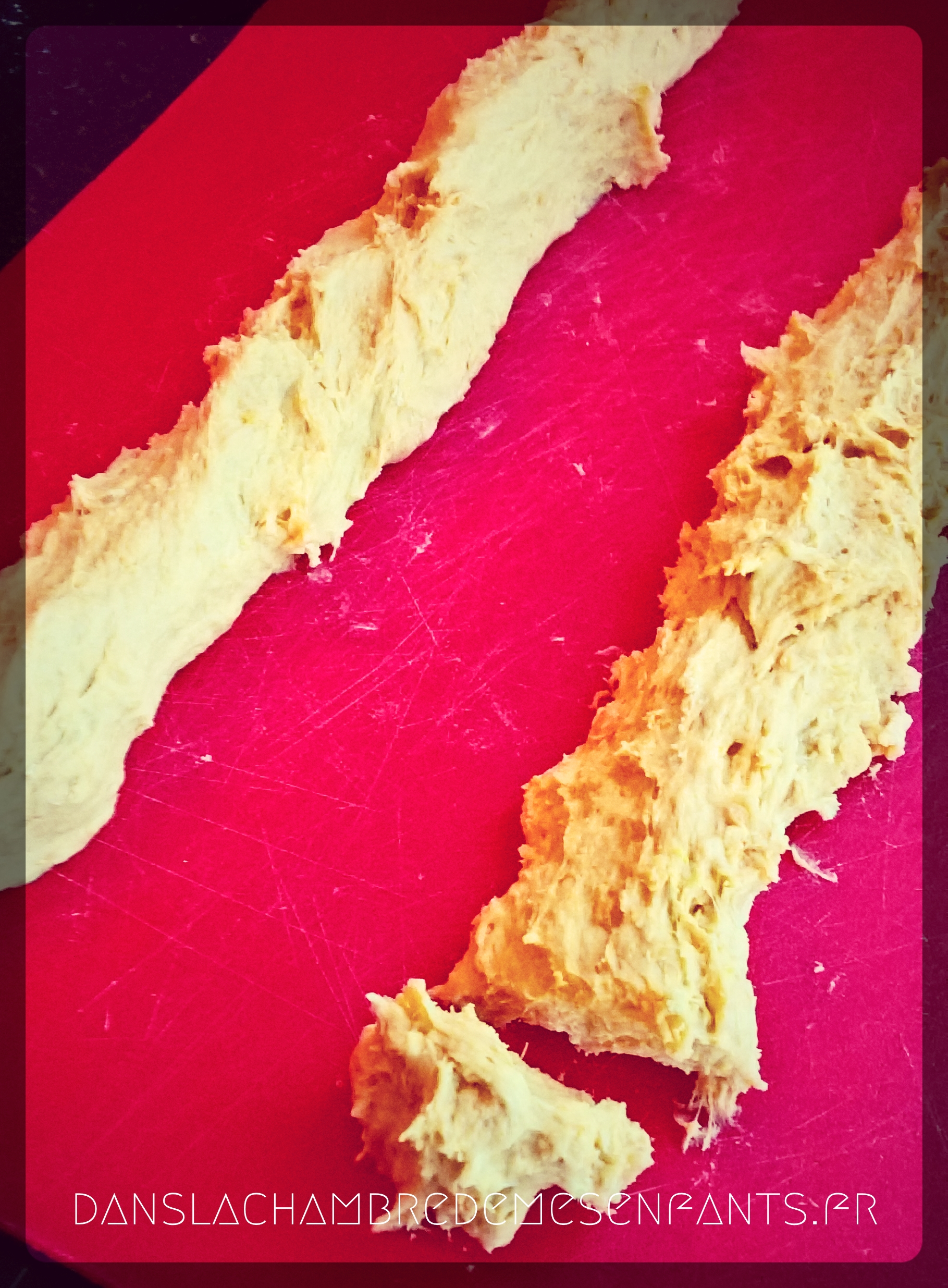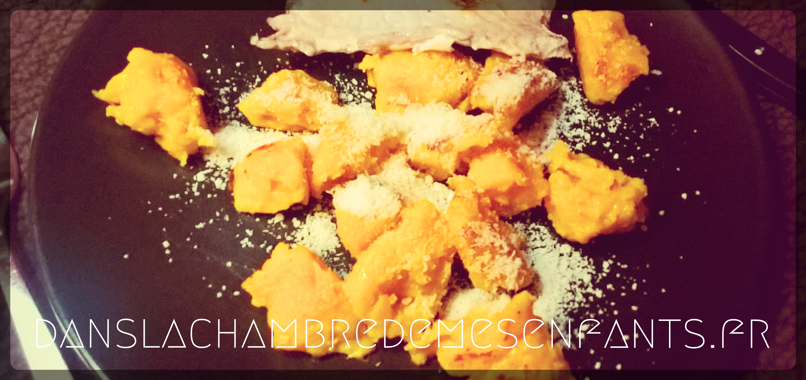 Test 2 : Ensuite, il y a eu les gnocchis de patates douces et zeste d’orange. La texture n’est pas celle indiquée dans la recette malgré un rajustement de quantité de farine, ce qui n’a pas permis une découpe net (voir la photo avant cuisson). Une fois dans l’assiette, c’est moche (il faut l’avouer) mais c’est bon ! Bien évidemment le goût est assez sucré (il s’agit de patate douce) et ce malgré l’utilisation de beurre salé (choix personnel) pour les faire revenir. Ils me rappellent la saveur des crêpes de ma mère et ce n’est pas pour me déplaire. Alex, 6 ans, qui n’est pas fan des gnocchis en général, en a redemandés tellement cela lui a plu.